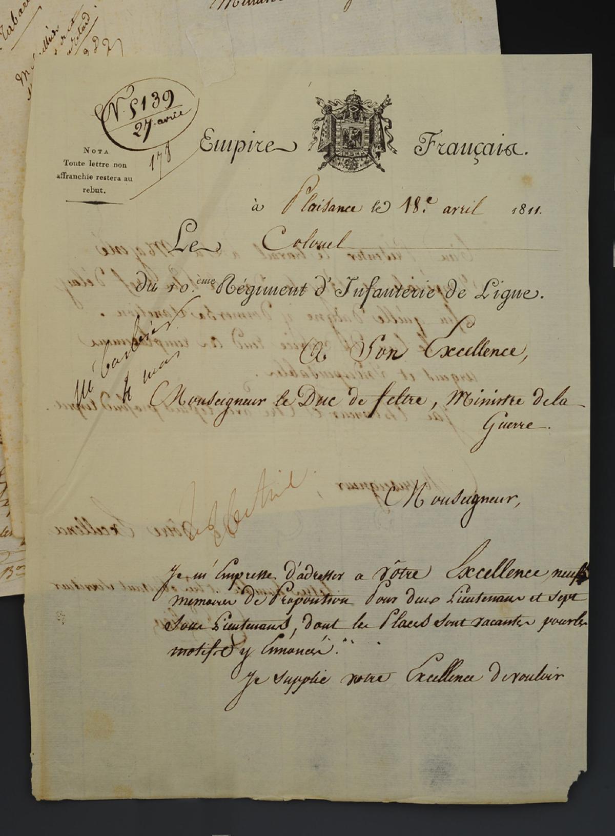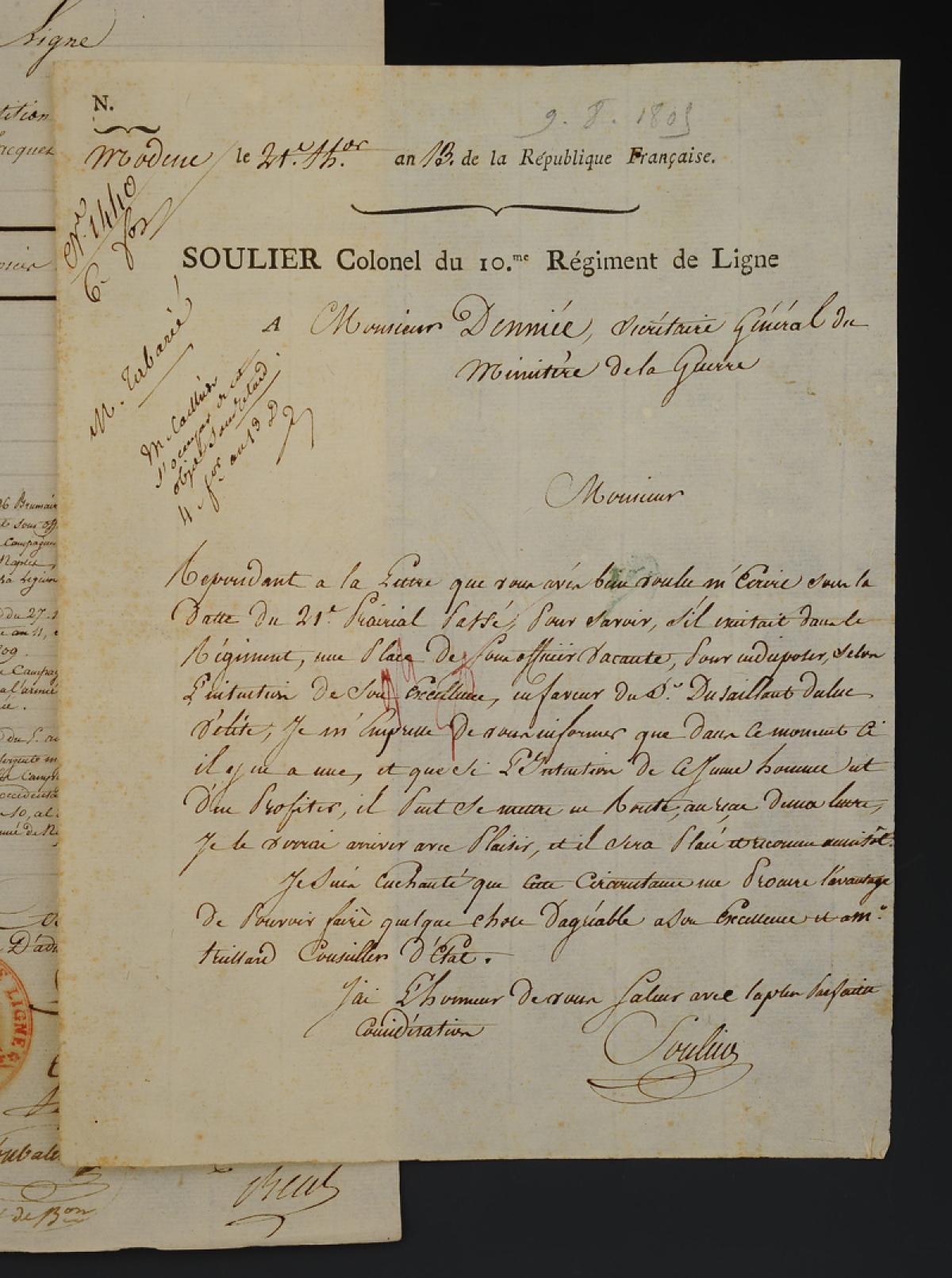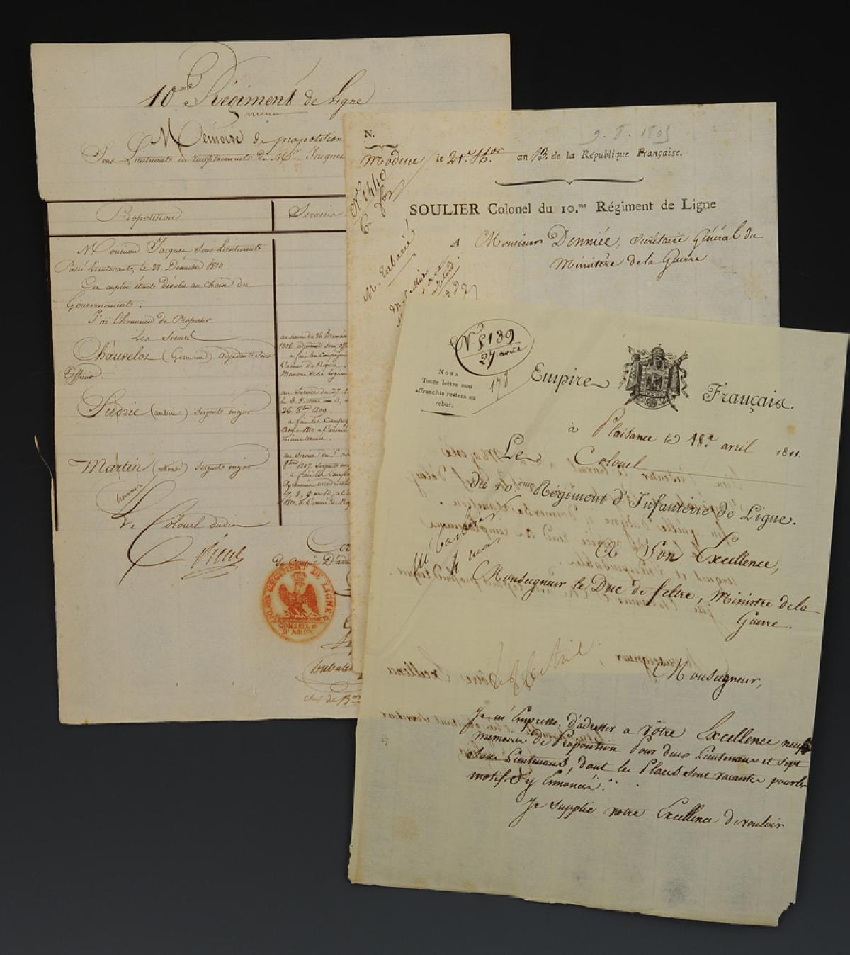 10th Line Infantry Regiment. LOT OF TWO LETTERS SIGNED BY COLONEL SULIER, one dated 1805 to the Secretary General of the Ministry of War, the second from 1811 to the Duke of Feltre, Minister of War, and A MEMO SIGNED BY COLONEL REAL, 1813. 18911-10