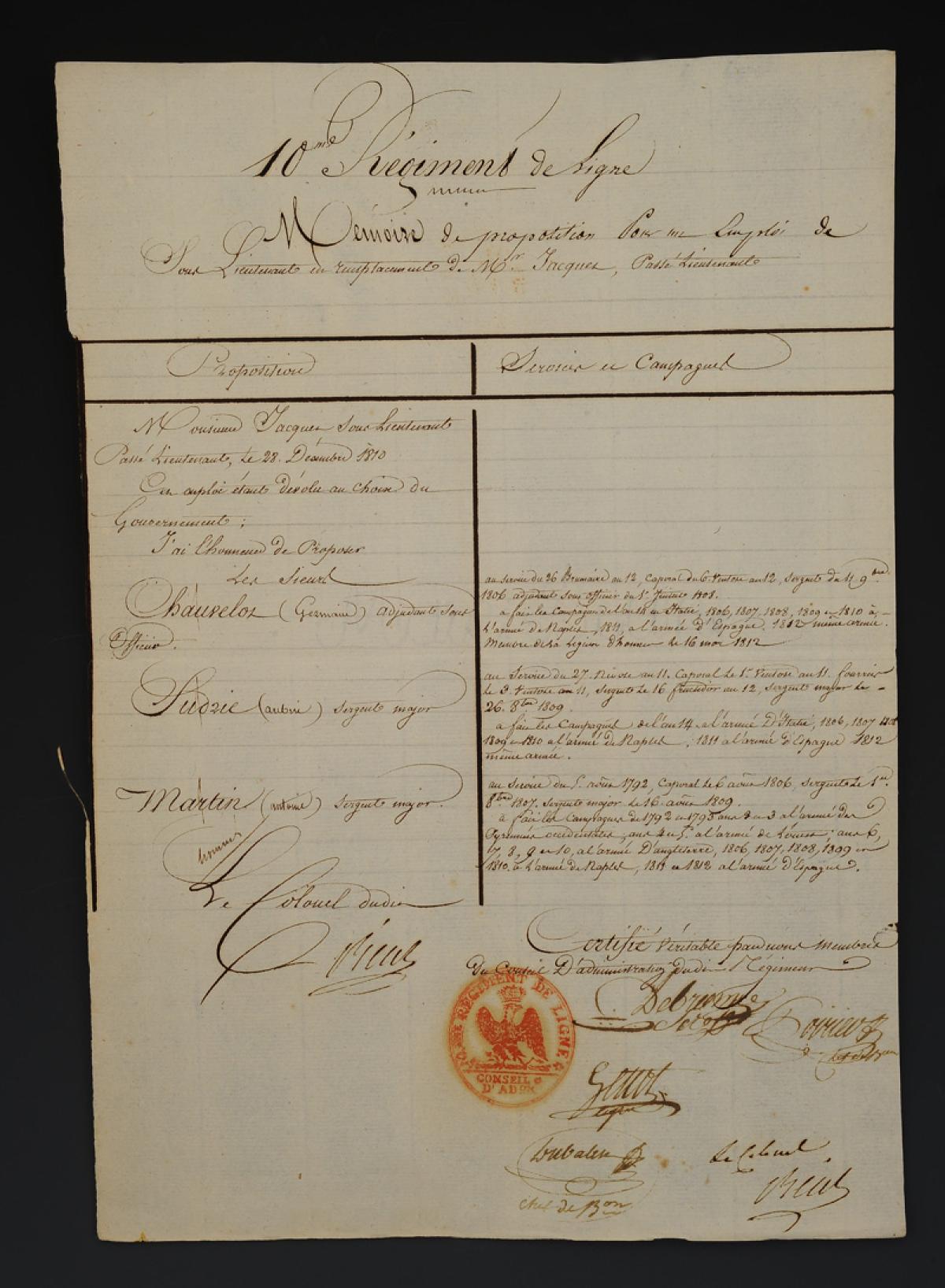- Proposal memo for a second lieutenant position to replace Mr. JACQUES, who was promoted to lieutenant. Certified as genuine by the members of the regiment's administrative council. 1813