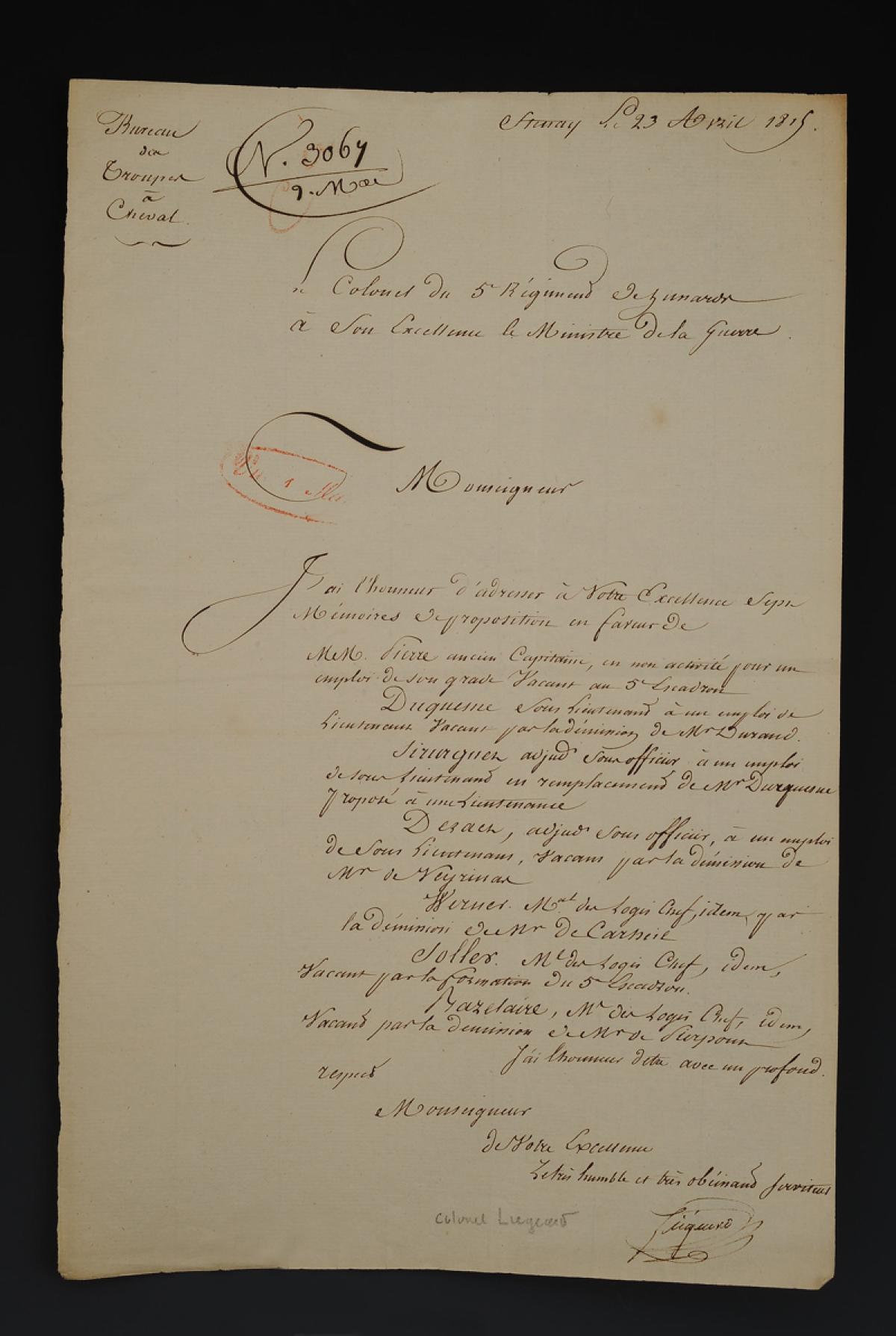 "Office of Cavalry Troops". Stenay, April 23, 1815. The Colonel of the 5th Regiment of Hussars to His Excellency the Minister of War. The colonel proposes seven names for vacant positions. Dimensions: 31.5 cm x 20.5 cm. 1 page. Good condition, fold marks, remnants of red ink stamp "Seen May 1".