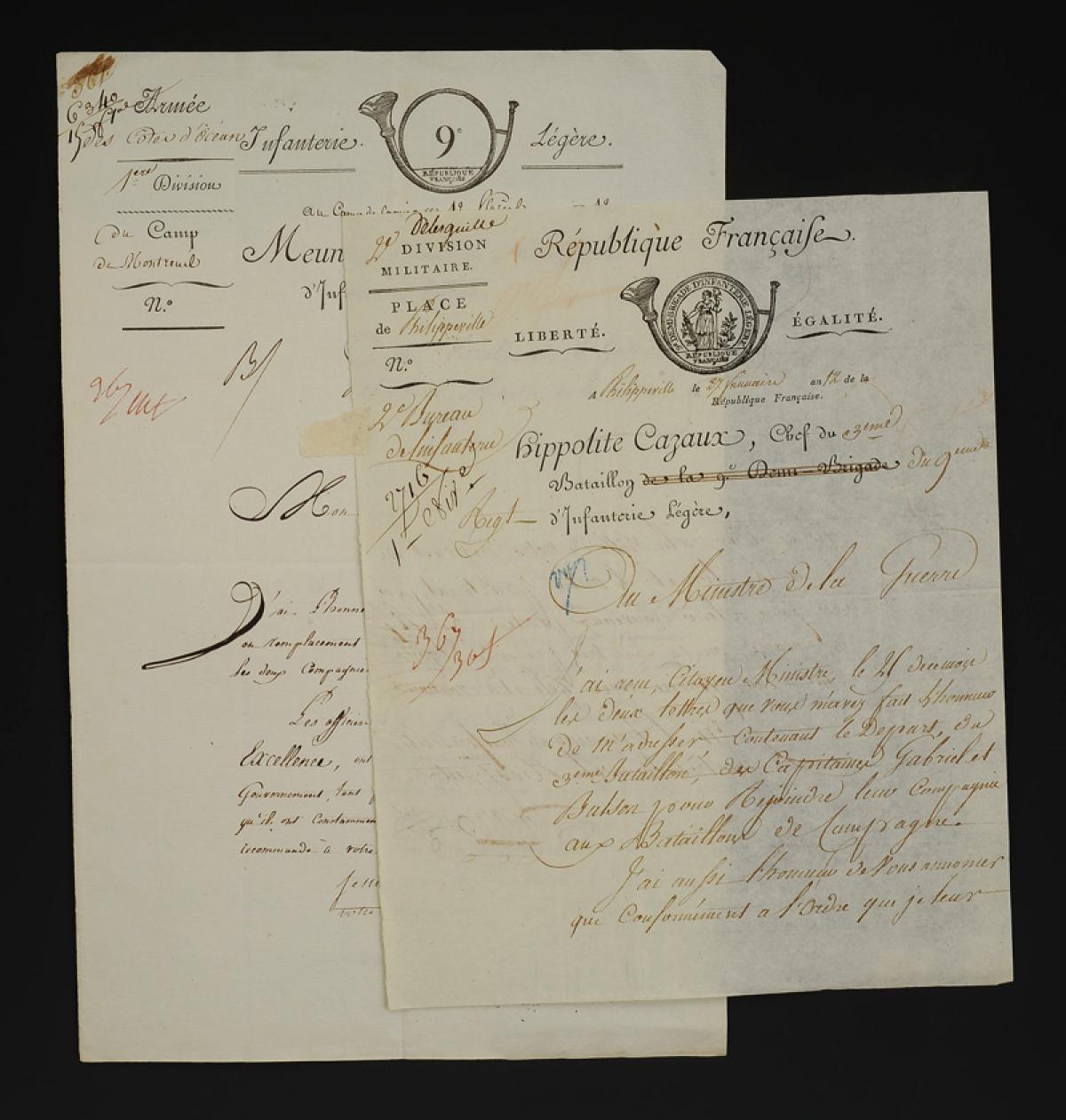 - DEPARTURE ORDER of Captains Gabriel and Balson from the 3rd Battalion. Signed by Hippolite CAZAUX, chief of the 3rd Battalion of the 9th Light Infantry Regiment, in Philippeville on 27 frimaire year 12 (December 19, 1803), addressed to "The Minister of War". Vignette of the hunting horn of the 9th Light Infantry Half-Brigade. 1 sheet front and back. Size 24 cm x 19.5 cm. Good condition, folding creases.
