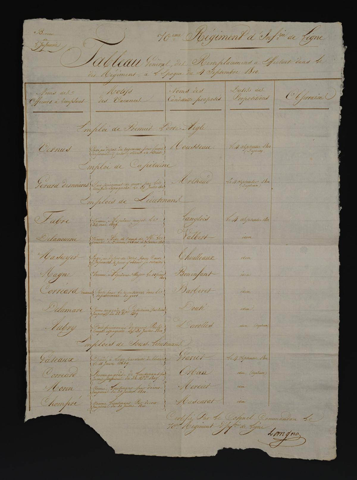 70th Line Infantry Regiment. GENERAL TABLE OF REPLACEMENTS TO BE MADE BY 4 SEPTEMBER 1810, certified and signed by Colonel Lavigne. 18909-24