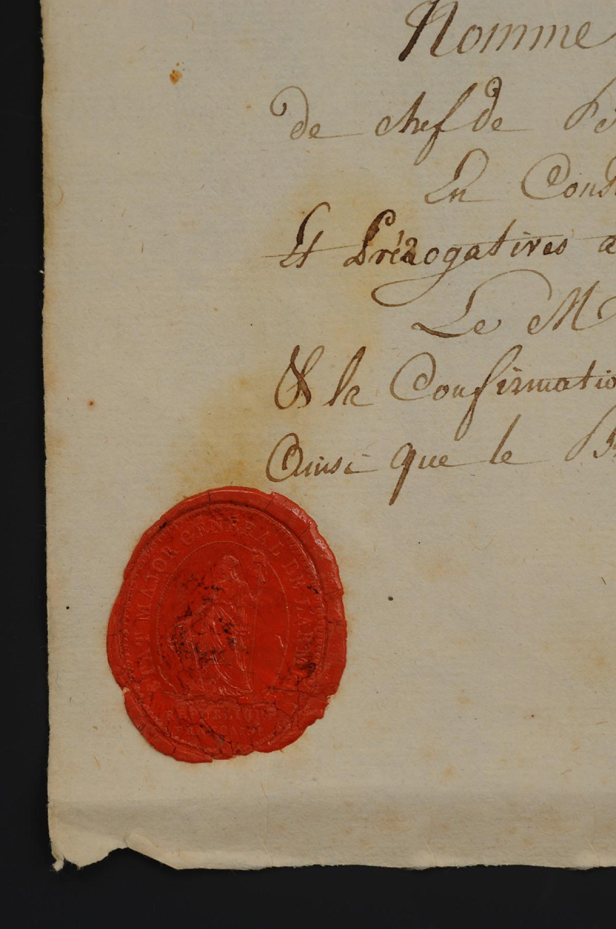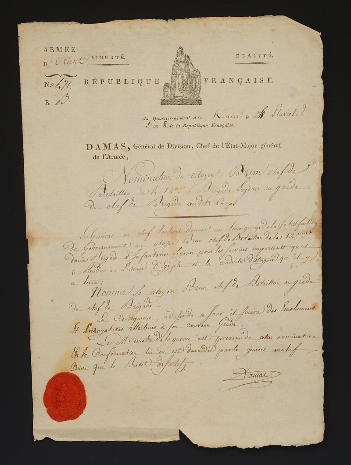 "The Chief General wanting to give a testimony of the Government's satisfaction to Citizen Brun, Battalion Commander of the 12th half Brigade of Light Infantry for the important services he has rendered to the Army of Egypt and the distinguished conduct he has held there: