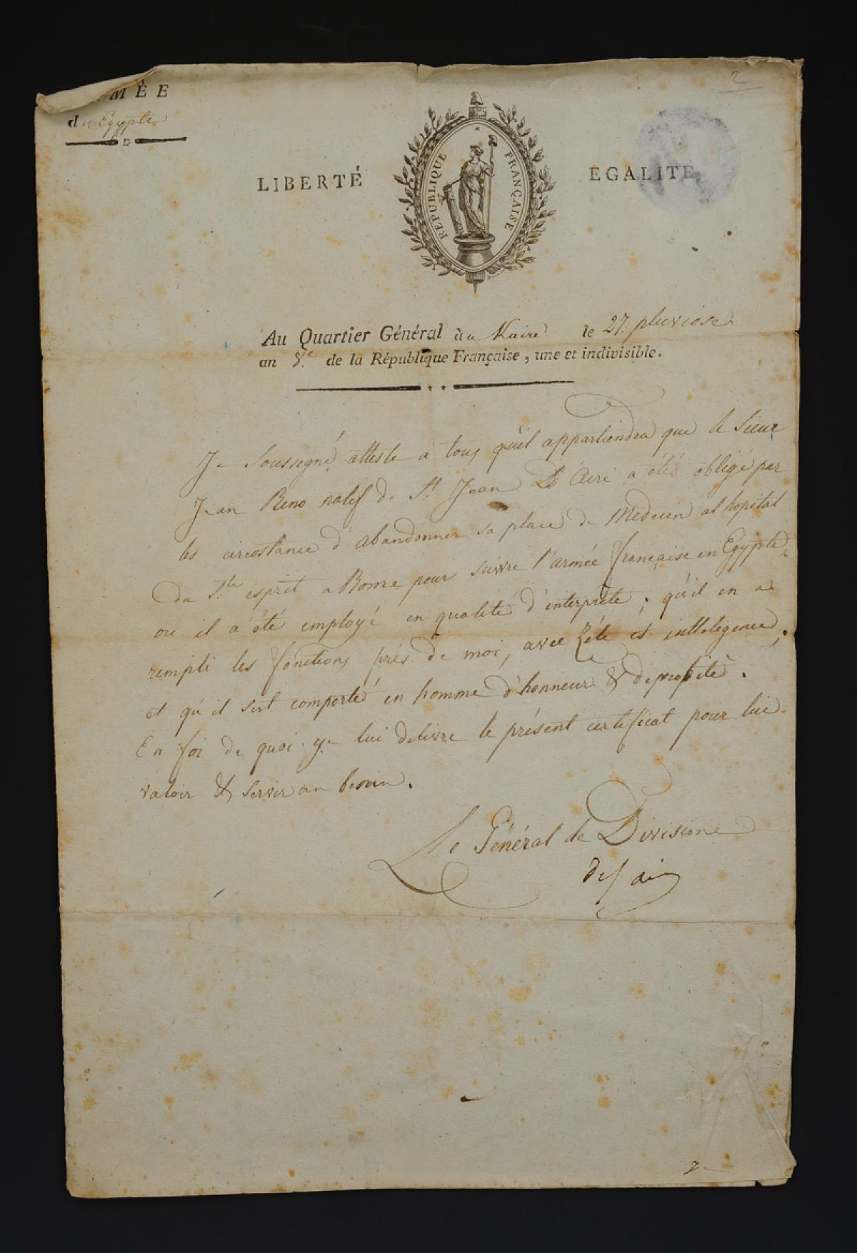 "I, the undersigned, attest to all concerned that Mr. Jean RENO, native of St. Jean d'Acre, was compelled by circumstances to leave his position as a doctor at the St Esprit hospital to follow the French army in Egypt where he was employed as an interpreter; that he fulfilled his duties with zeal and intelligence in my presence, and conducted himself as a man of honor and integrity.