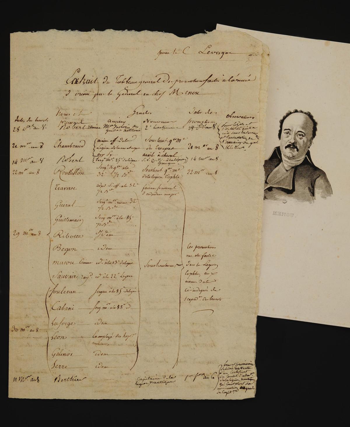 Oriental Army. EXCERPT FROM THE GENERAL PROMOTIONS TABLE MADE IN THE ORIENTAL ARMY BY THE CHIEF GENERAL MENOU *, 1801. 18910-7
