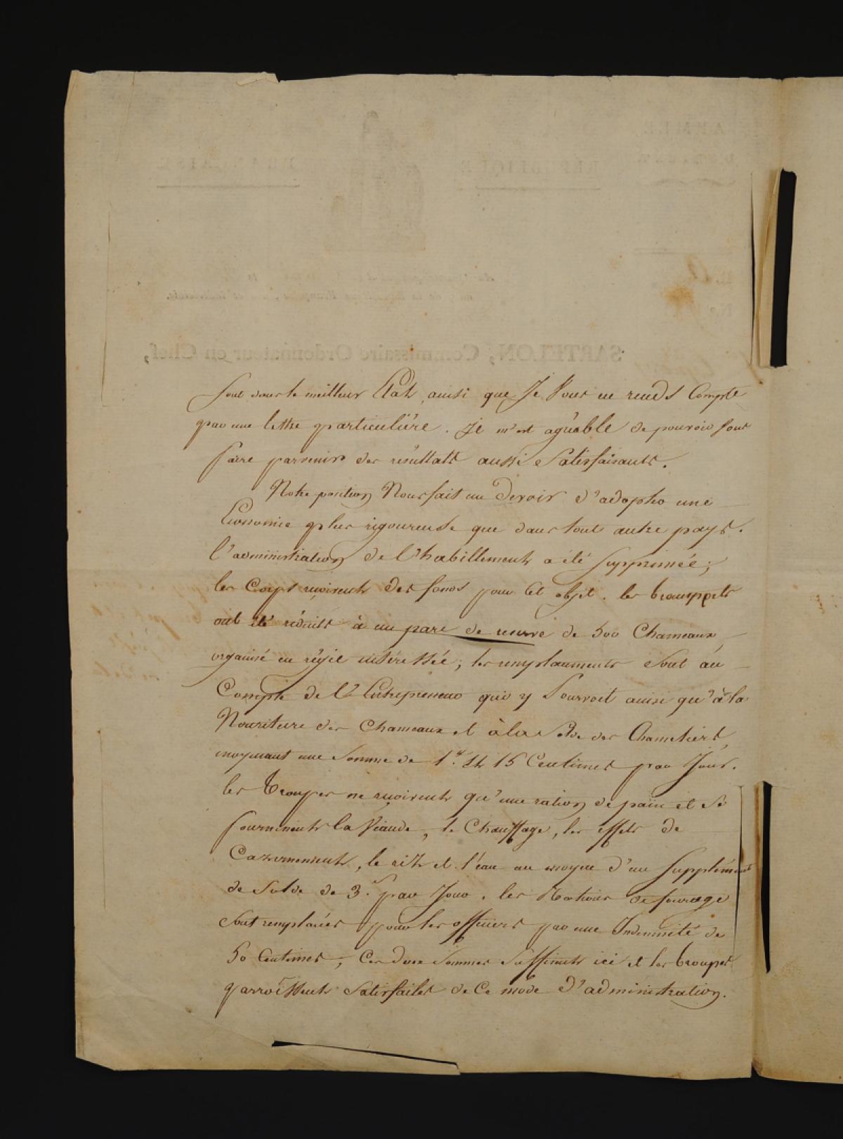 "… The clothing fully issued to the different Corps must last until the end of Year 9. The shortage of blue fabrics has forced us to resort to mixing various colors; the resulting uniforms have had the greatest effect. […] I am pleased to be able to send you such satisfying results. Our situation requires us to adopt a more rigorous economy than in any other country. Transport has been reduced to a reserve park of 500 camels organized under contract [...] Replacements are the responsibility of the Contractor who provides for them as well as for the camel drivers' food and pay […] the troops receive only a ration of bread and provide themselves with meat, heating, barracks supplies, rice, and water through the honorable deeds evidenced by the various letters that arrived with the ships "Le Dégagé," "La Rosalie," and "Le San Philipo" [...]