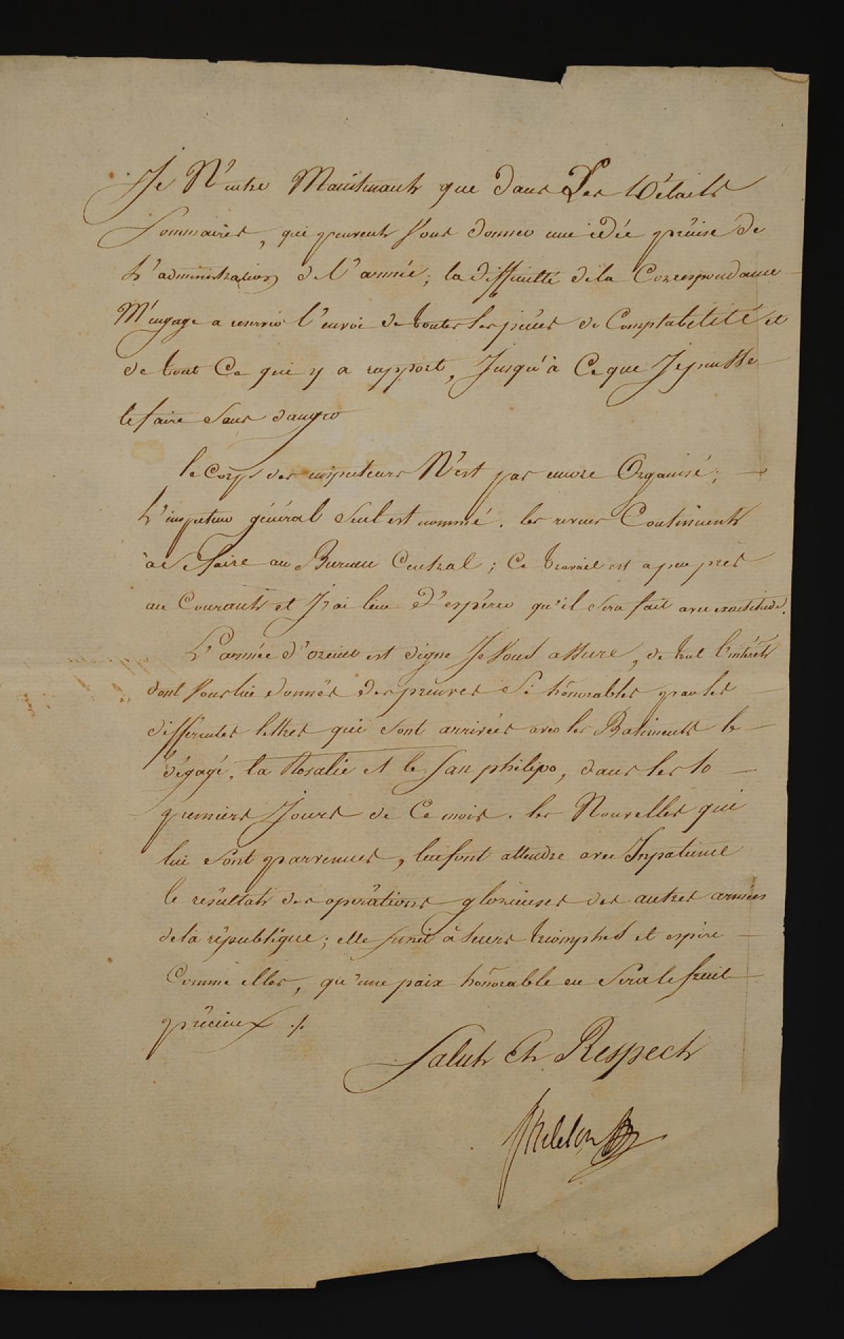 The news that has reached him makes him eagerly await the results of the glorious operations of the other Republic's Armies; he joins in their triumph and hopes, like them, that an honorable Peace will be the precious fruit of it [...]