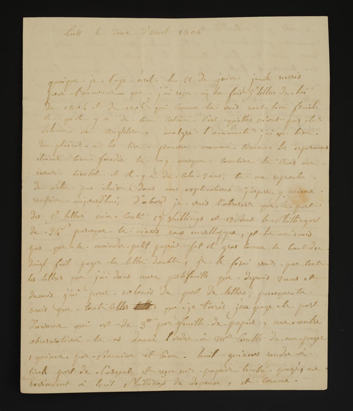 Although I wrote to you on June 21, I am writing to you again to let you know that I received 5 letters from you at once from 1804 and 1805 [...] Despite their age, I was very pleased to read them. Poor mom, how well-founded your hopes were, you mention to me how much you think you will see me soon and it has been about 2 years, you reproach me for not being clear in my explanations I hope to do better today, first I will observe to you that sending the 5 letters cost me 17 shillings and 12 sous, the shilling is 24 sous because you write me in an envelope, and you do not know that even the smallest piece of paper, even as small as the tip of a finger, makes the letter cost double [...]