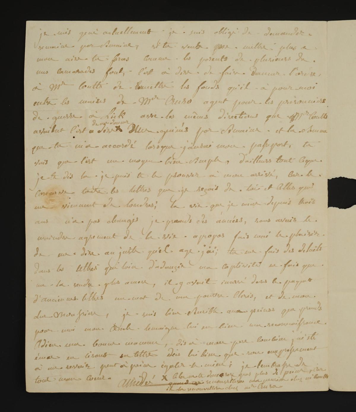 Amédé explains to his mother the cost of sending and receiving letters. He asks her to arrange for funds to be sent to him, like all soldiers do through their parents, by giving "instructions to Mr. Coutts, agent for prisoners of war in Leek with the same directions as Mr. Coutts had, namely to give me a Guinea per week, and the sum that you approved for me when I receive my passport. you see that it is a very simple way [...]