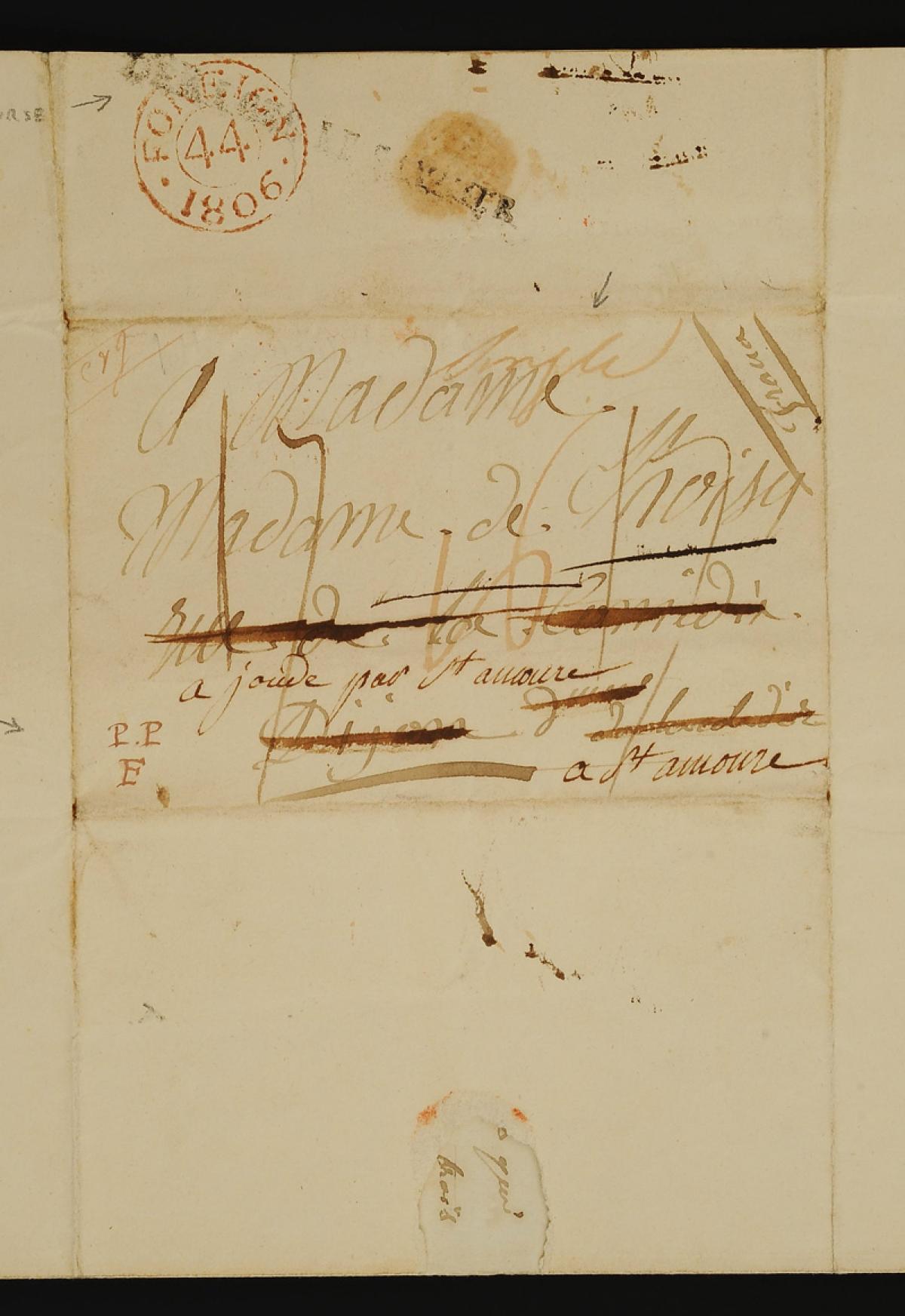 With address: "To Madame / Madame de Thoisy (an address crossed out in Dijon: Rue de la Comédie DIJON duly. from Cote d'Or, replaced by that of Joudes) In Joudes near St Amour In St Amour" "France".