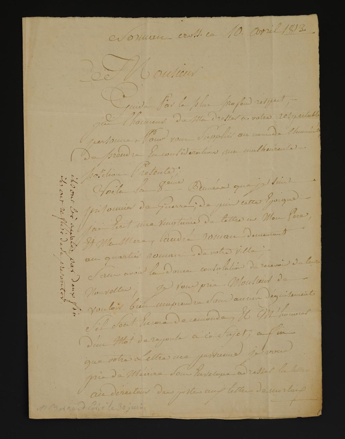 Pierre ROMAN writes on April 10, 1813, as a last resort, to the mayor of Marseille, ANTOINE, as he has been a prisoner of war for eight years at Norman Cross, a prison in England, and has had no response to the many letters he has sent to his parents. He wishes to know if they are still alive.