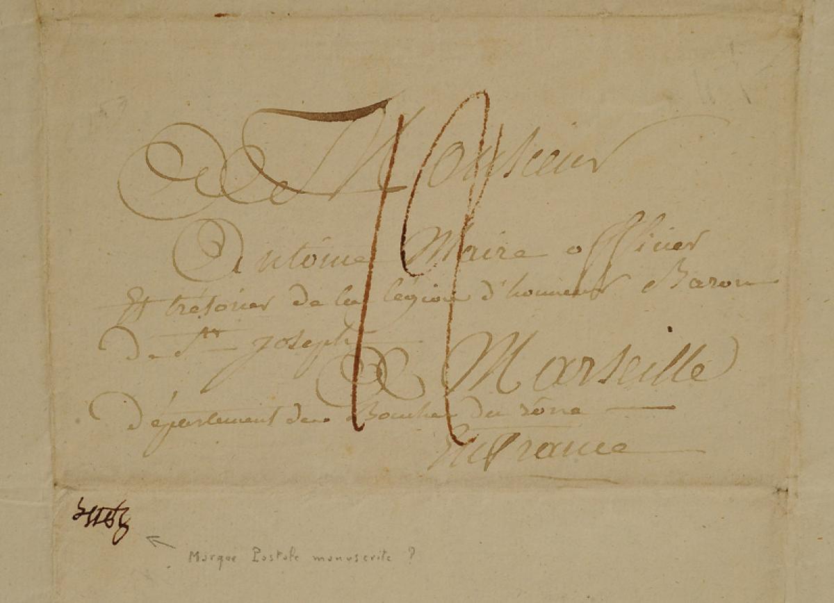 "To Mr. ANTOINE, Mayor, Officer and Treasurer of the Legion of Honor, Baron of St. Joseph / In Marseille / Bouches du Rhône Department in France." Postal marking over the address.