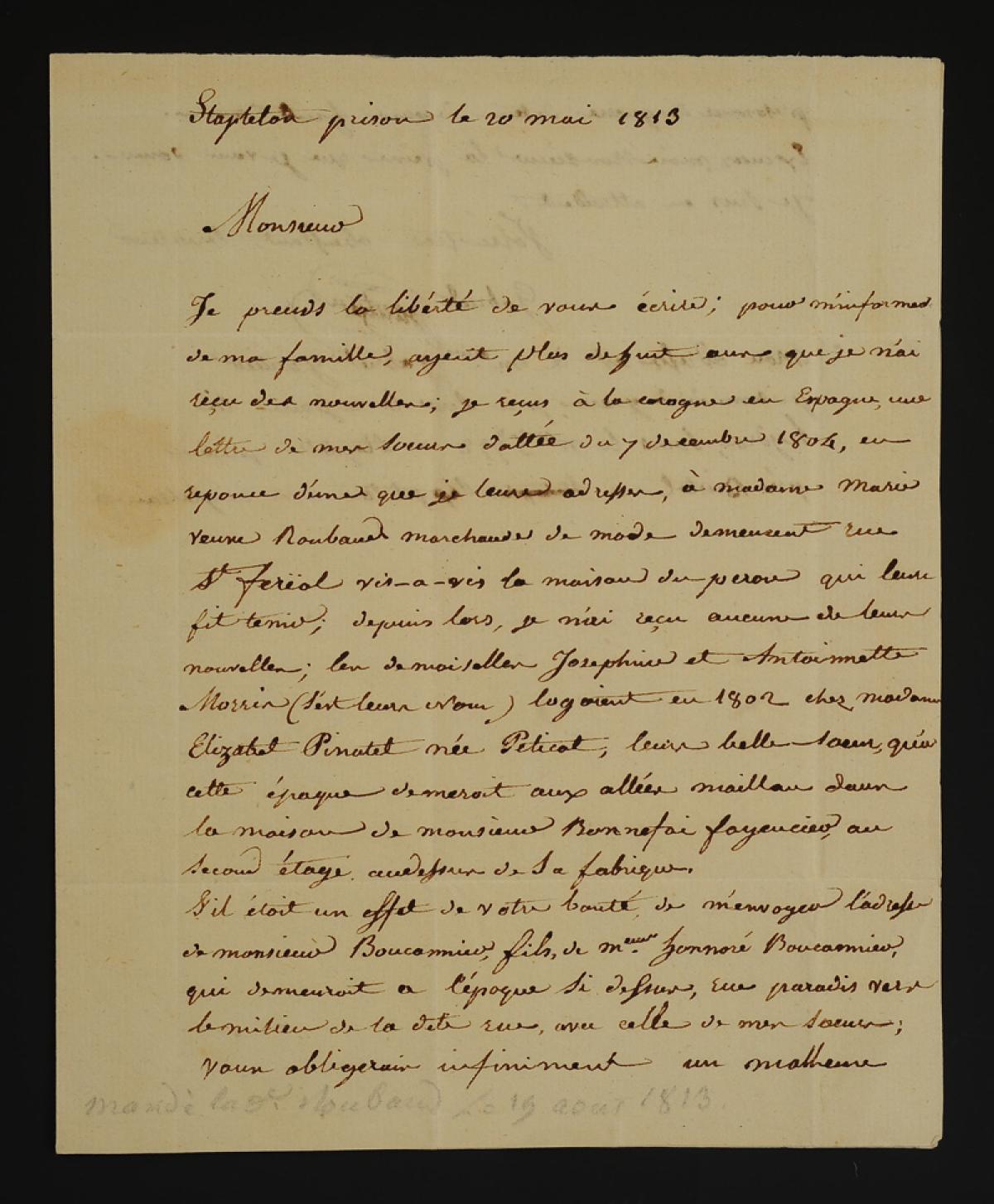 LETTER FROM GABRIEL GAUTIER, prisoner of war in Stapleton, England, ADDRESSED TO THE MAYOR OF MARSEILLE, on May 20, 1813. 18910-19