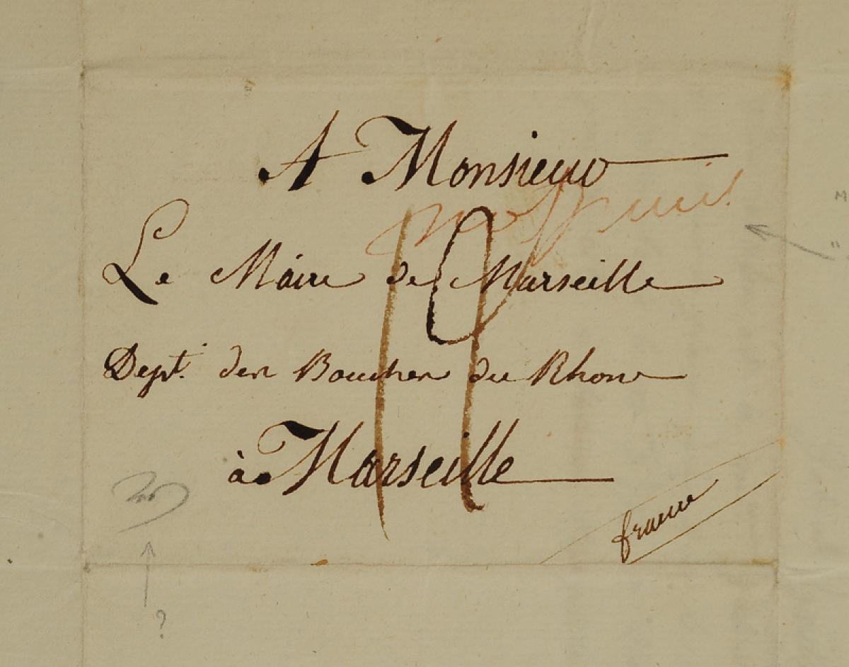 The letter is addressed to "Monsieur / Le Maire de Marseille / Dépt des Bouches du Rhône à Marseille / France". There are postal markings over the address, indicating "not paid".