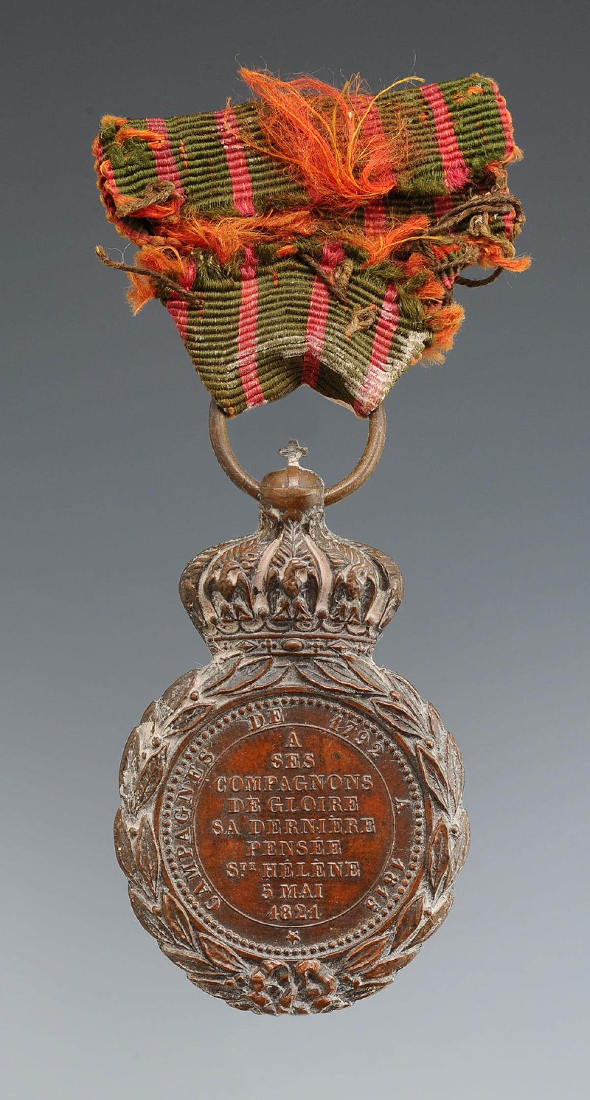 Obverse featuring the profile of Emperor Napoleon I, reverse bearing the inscription: "Campaigns from 1792 to 1815. To his companions of glory, his last thought, May 5, 1821", upper part in the shape of an imperial crown. Green silk ribbon with red vertical stripes.
