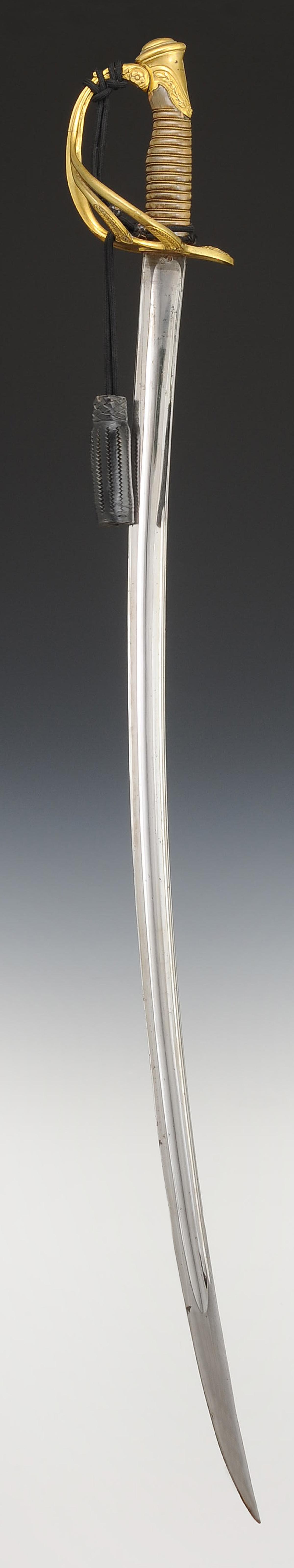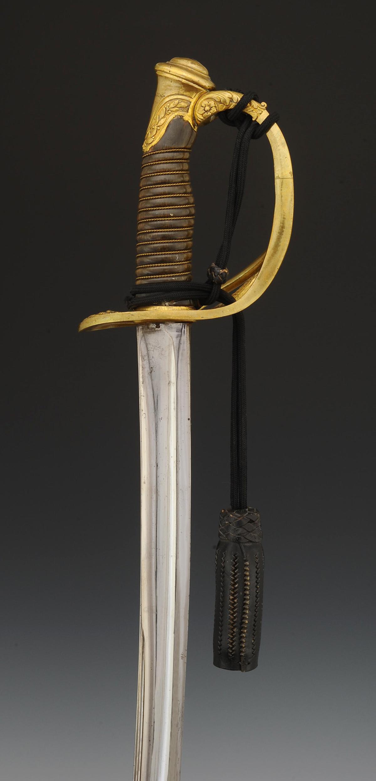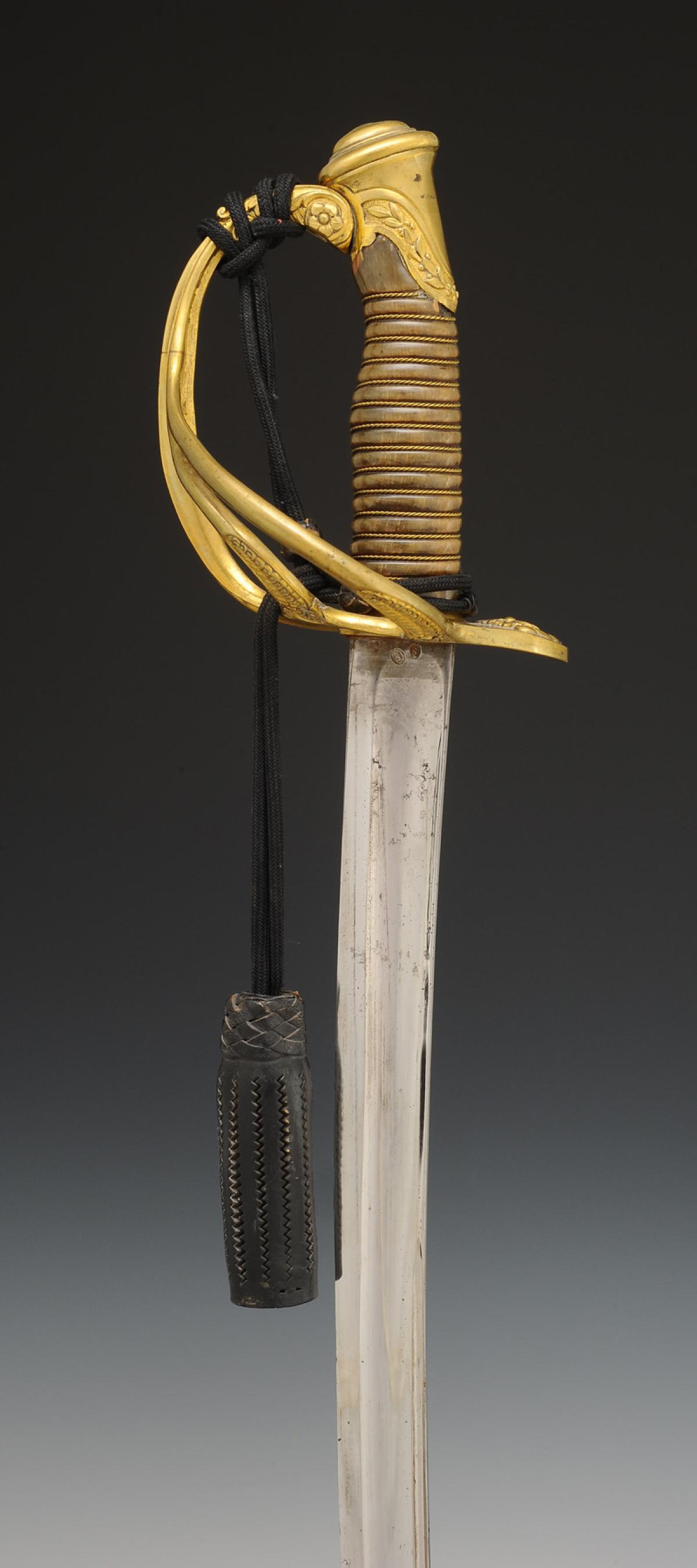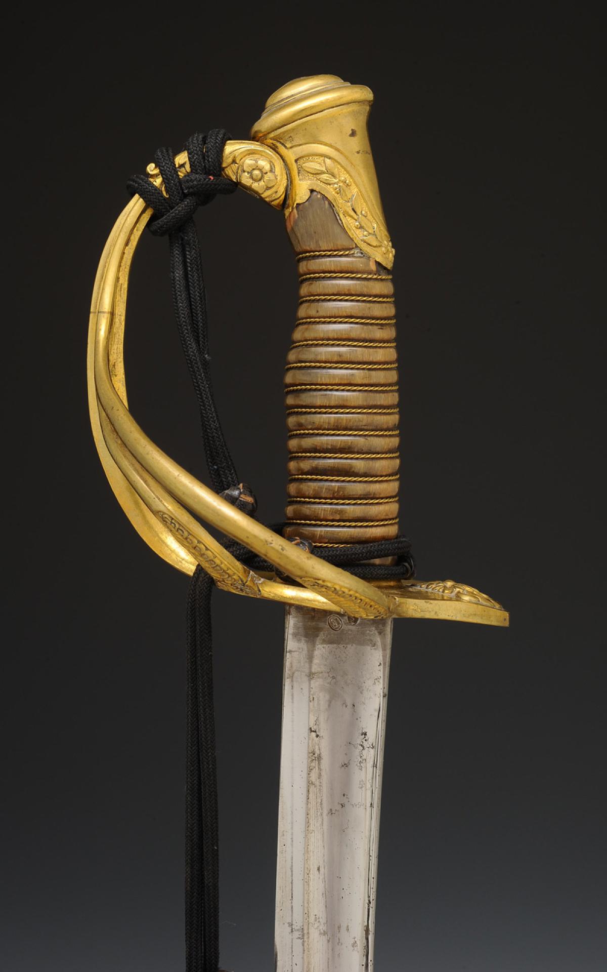 Gilt brass hilt. Guard with three branches decorated with laurel leaves. Cap with a short tail. Horn handle, copper wire filigree. Curved blade with hollow facets, length 91.3 cm, signed on the back "Mre Impale de Châtt 8bre 1868 = Cavrie lre mle 1822". Steel scabbard with two suspension rings.