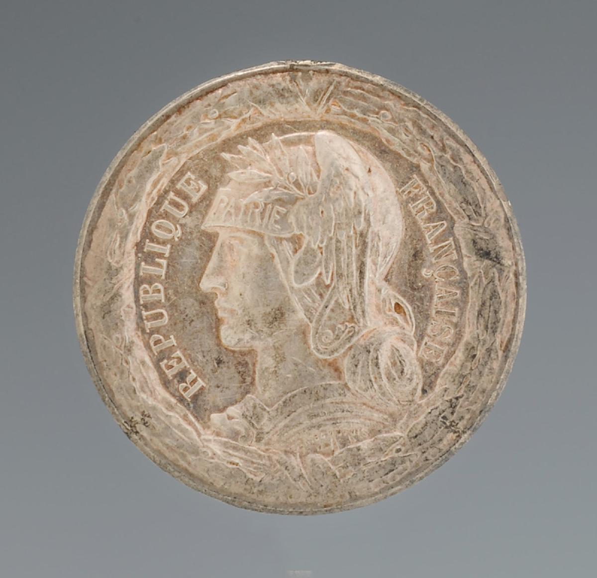 Round silver medal, diameter 3 cm, engraved by Jean-Baptiste Daniel Dupuis. Obverse featuring the effigy of the helmeted Republic, with the word "PATRIE" on the visor, surrounded by the legend "RÉPUBLIQUE FRANÇAISE".