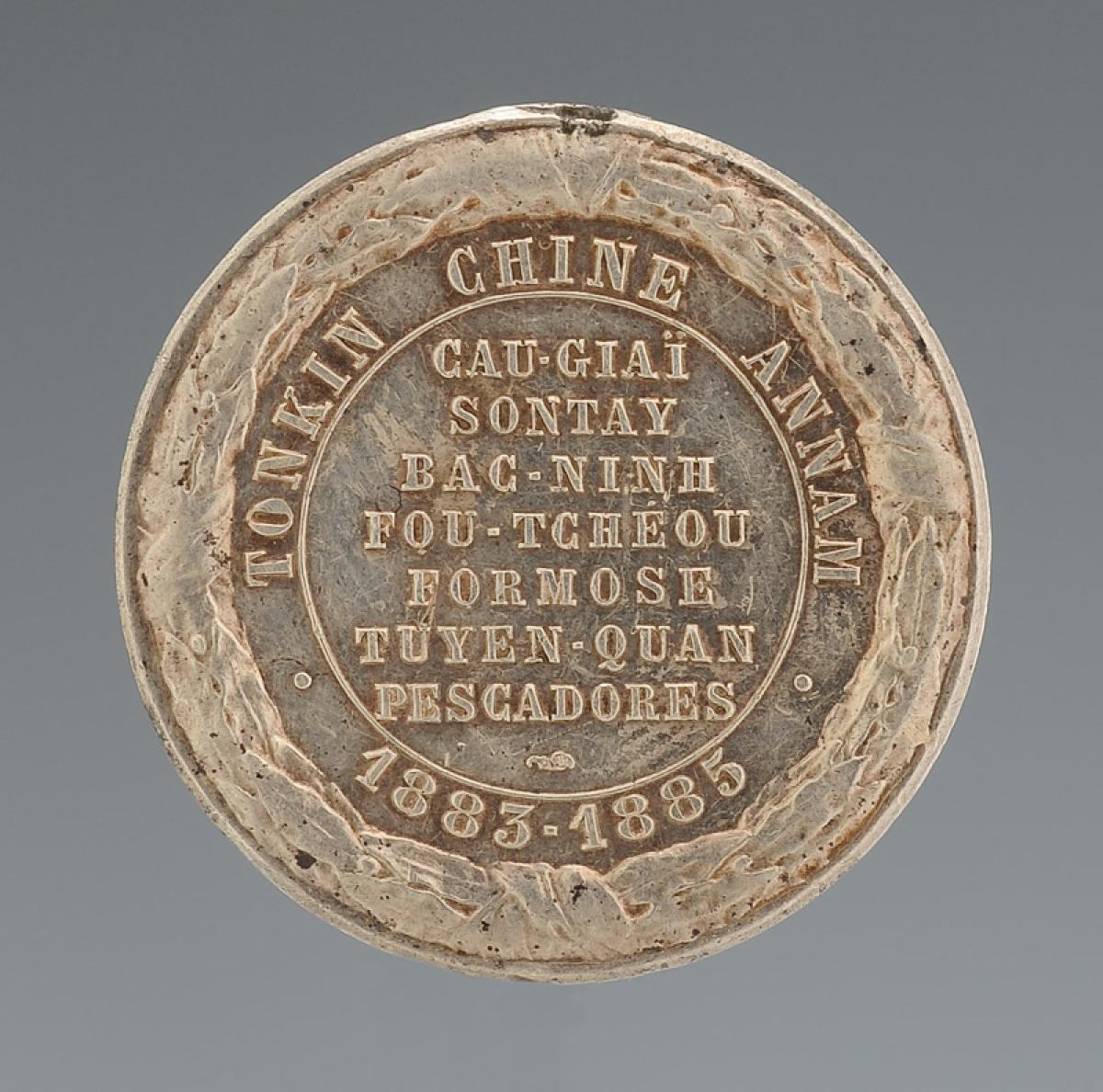 Reverse with the inscription "TONKIN - CHINA - ANNAM • 1883-1885 •" framing the names of the battles of "SONTAY, BAC-NINH, FOU-TCHÉOU, FORMOSE, TUYEN-QUAN, PESCADORES".