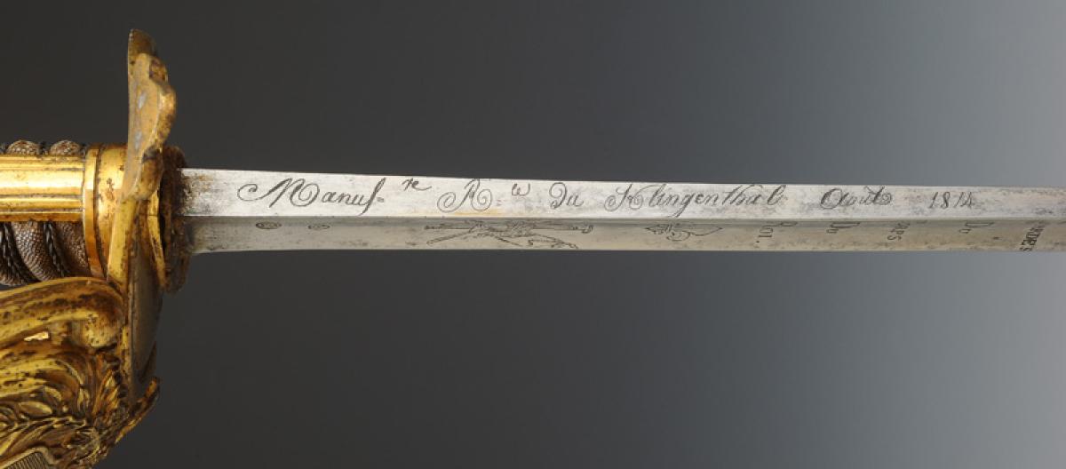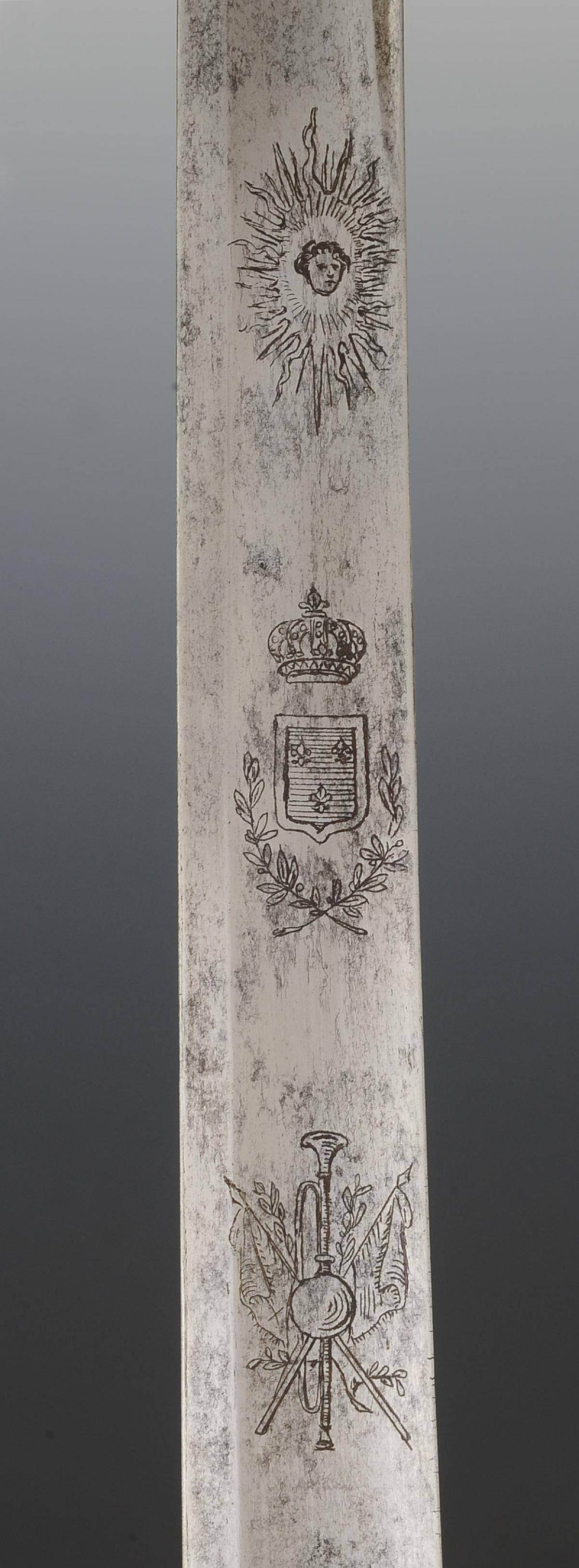Natural buffalo cravat. Blade with hollow facets engraved with a bundle of arms, two fleur-de-lis, and the inscription "KING'S BODYGUARDS" on one side, and on the other side with a trophy of arms, the arms of France, and a radiant sun with a face. Back engraved "Manufre Rle du Klingenthal August 1814." It bears the stamps of Borson August 1814 - September 1816 from the Manufacture of Klingenthal and Bick, 1st class controller 1812 - 1815. Blade length 92.9 cm.