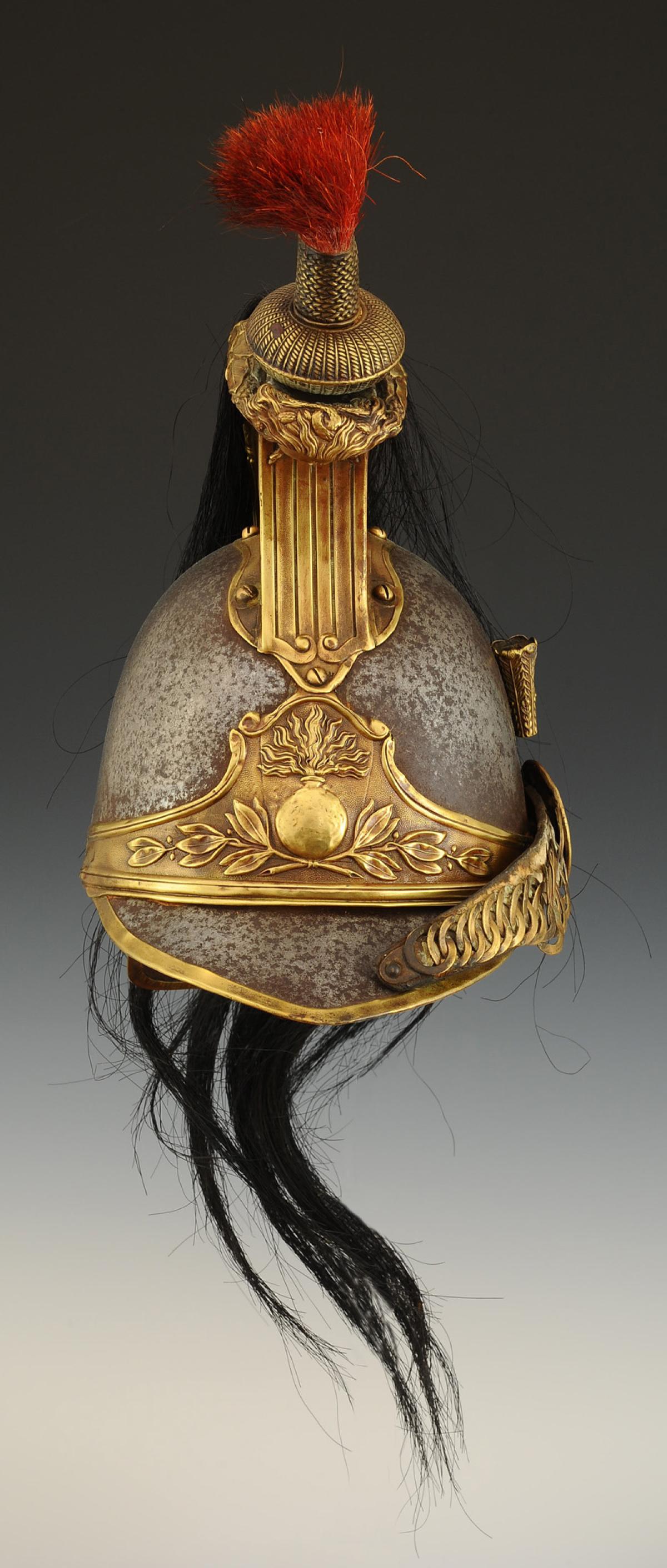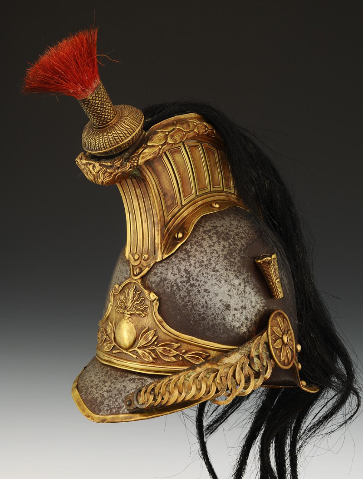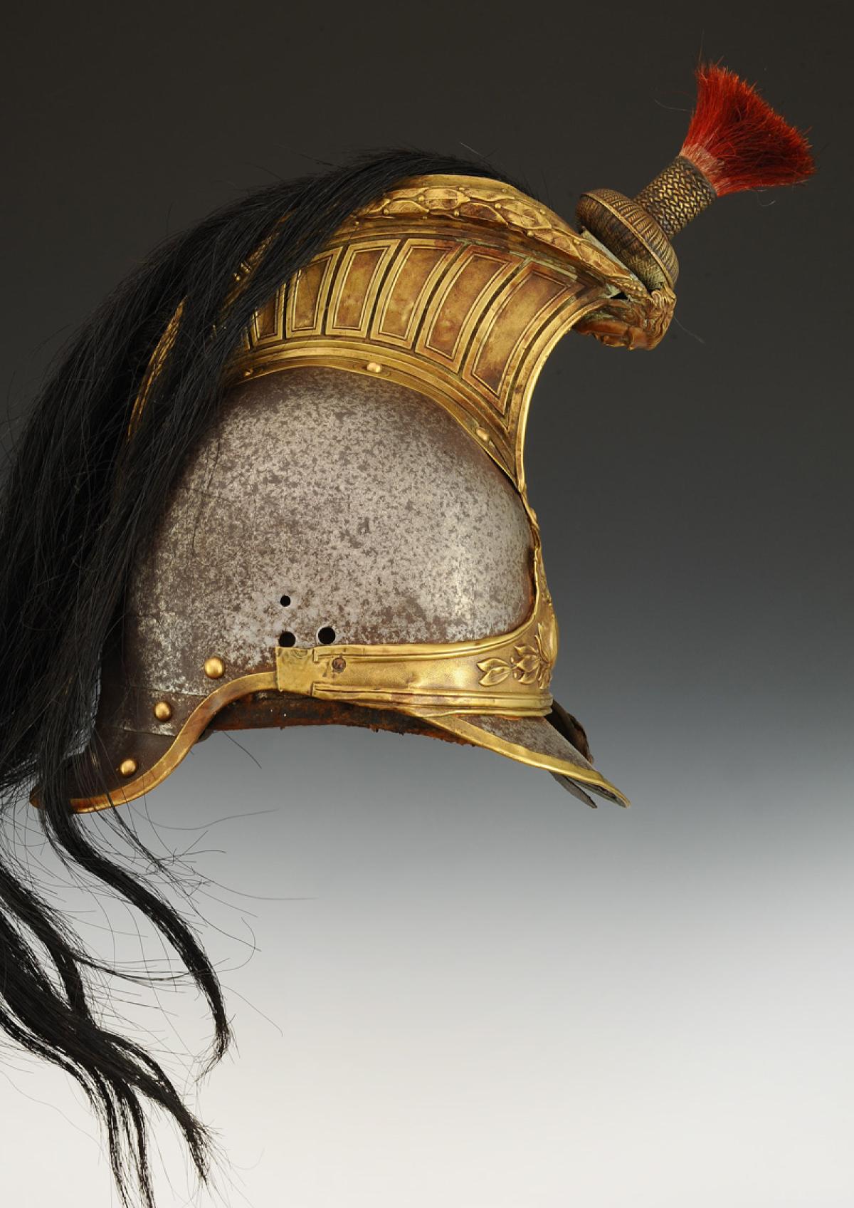 HELMET with bowl, visor, and neck guard made of steel sheet with brass fittings. Bowl marked "490" scratched and then re-marked "1542" dated "56" (1856) with crown and "2C" for the second regiment of cuirassiers of the guard. Visor with neck guard with brass rim bent over their outer edge, visor lined with black waxed leather. Front band transformed in 1872 by removal of the crowned "N" replaced by a flaming bomb. Crest (H 10.5 cm) composed of two stamped fins with a series of ten decreasing caissons towards the back bordered at the top by laurel leaves; and a mask (width 4.1 cm) embossed with the head of Medusa at the top. Brass crest ornament trimmed with scarlet horsehair. Mane of black horsehair with a braided braid in the center, approximately 50 cm long. Chin strap with black leather chinstrap covered with interlocking rings stamped with laurel leaves (diameter 5.3 cm); each rosette is attached to the bowl by means of a brass screw. Brass plume holder with a round section, tapering downwards and molded with laurel leaves. Inner leather lining cut in wolf teeth.