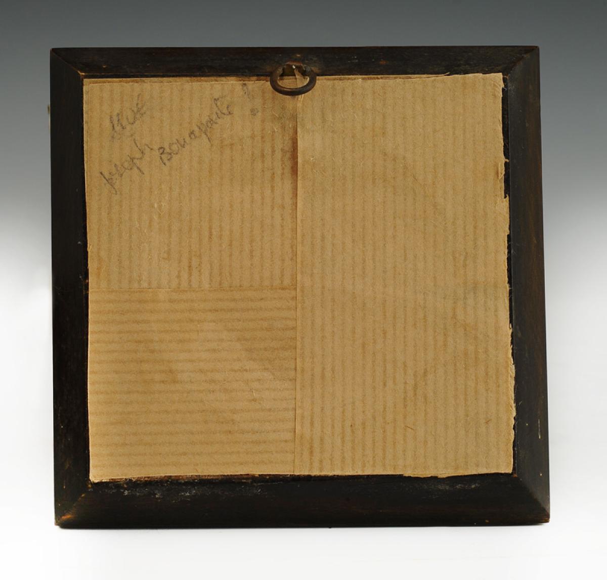 Circular shape with a diameter of 5.6 cm. Presented under glass on a brass frame. In a varnished wooden frame, measuring H 11.7 cm x 12 cm.