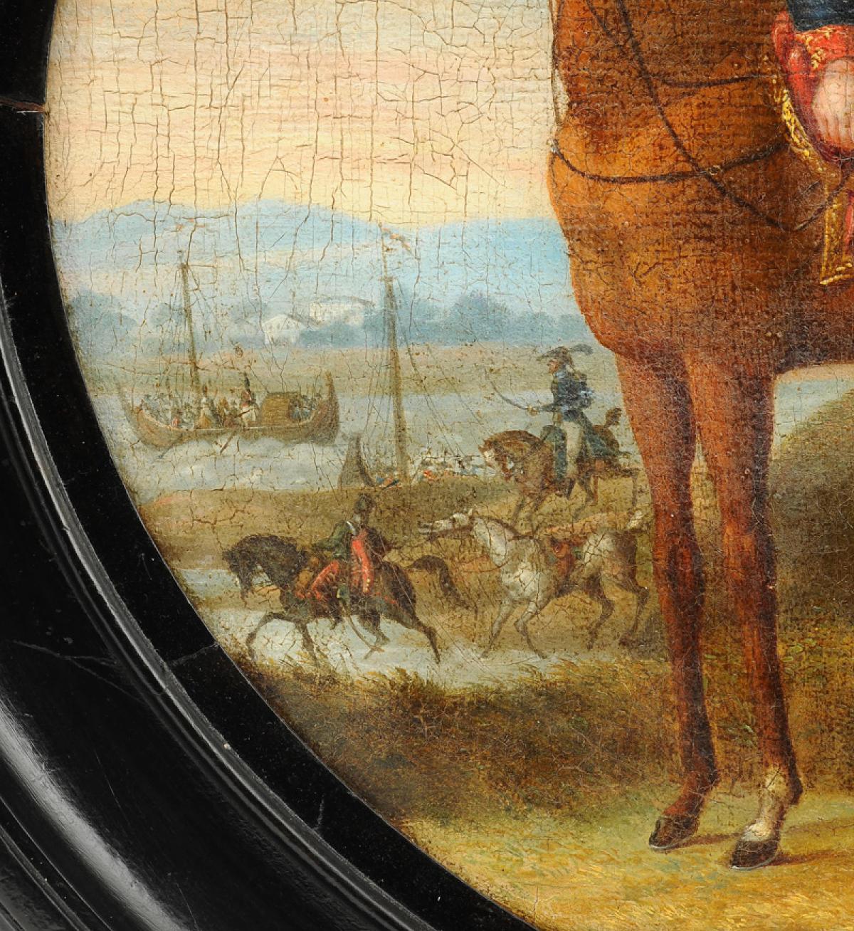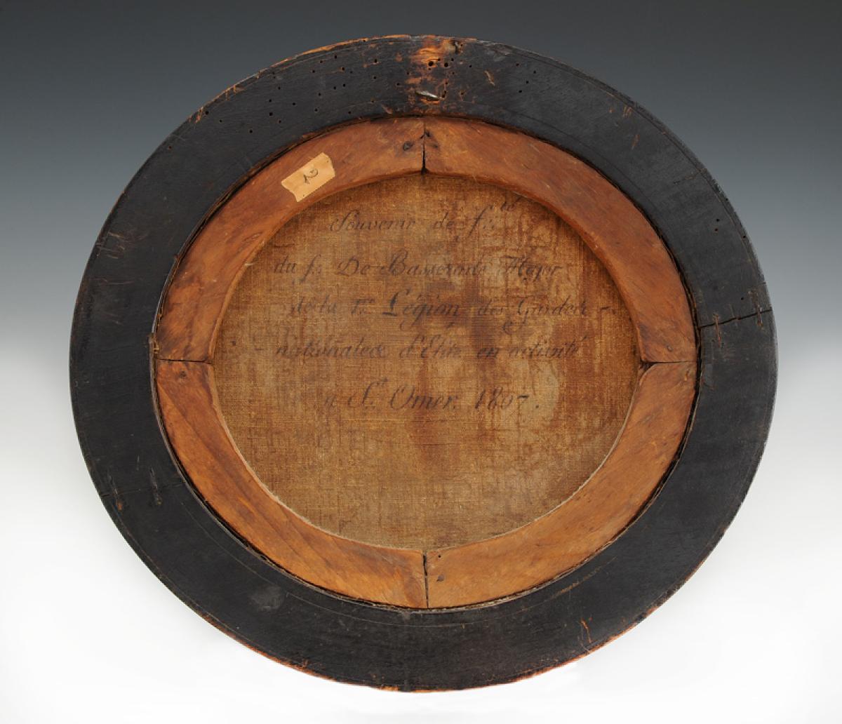 Presented in a black waxed wooden oval frame, H 37.5 cm, W 39.5 cm.