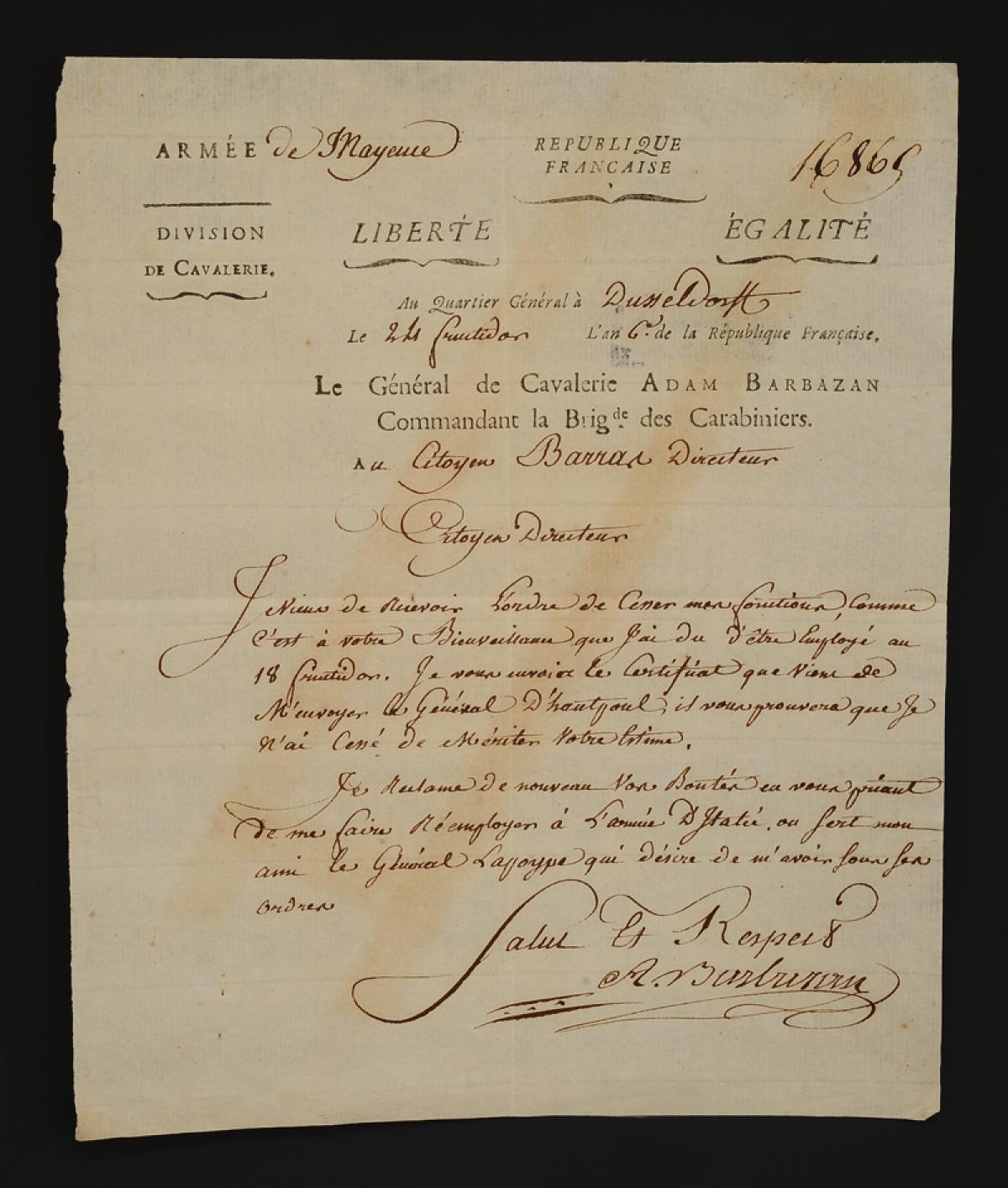 Autograph letter from the general of the Army of Mayence on 24 Fructidor An VI to Citizen Barras Director, in which he requests to be transferred to the Army of Italy.