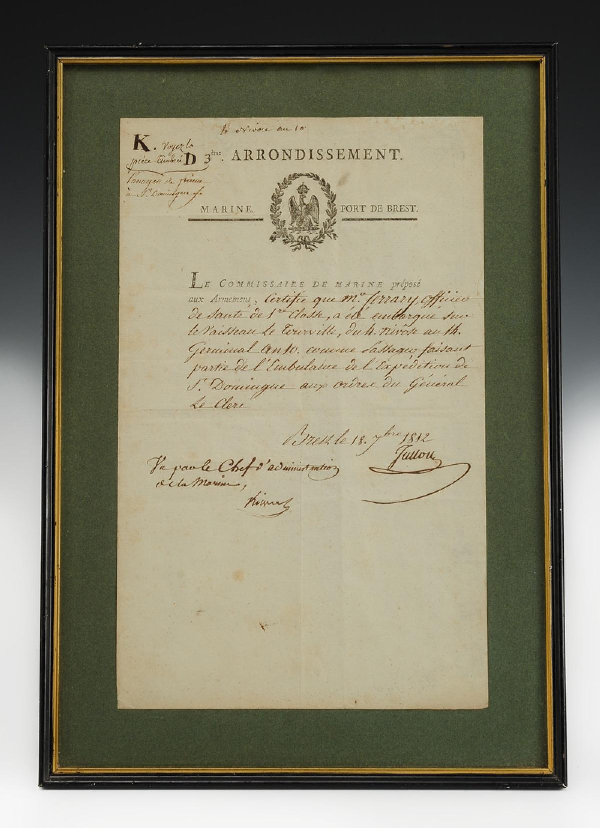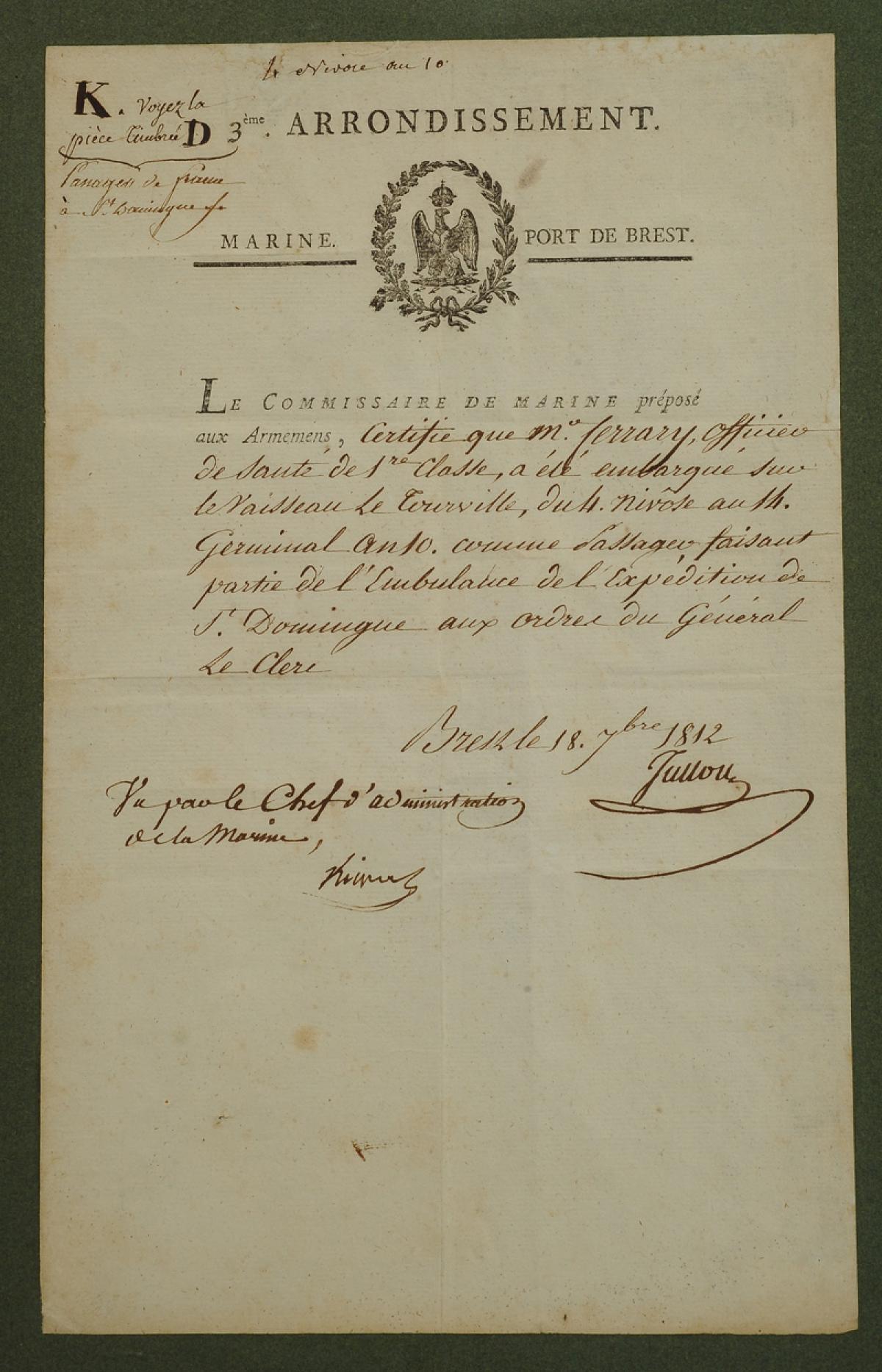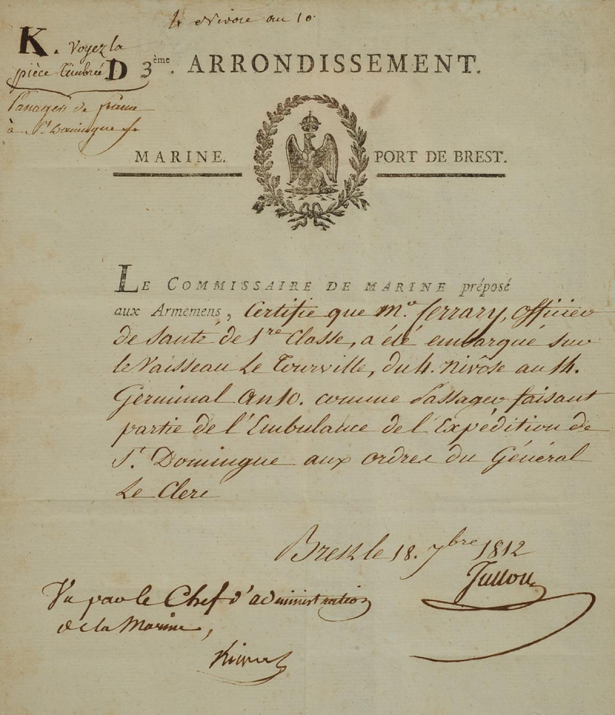 "The Navy Commissioner in charge of armaments certifies that Mr. Ferrary, 1st class medical officer, was embarked on the ship Le Tourville, from 4 Nivôse to 14 Germinal year 10, as a passenger forming part of the field hospital of the Saint Domingue expedition under the command of General Le Clerc.