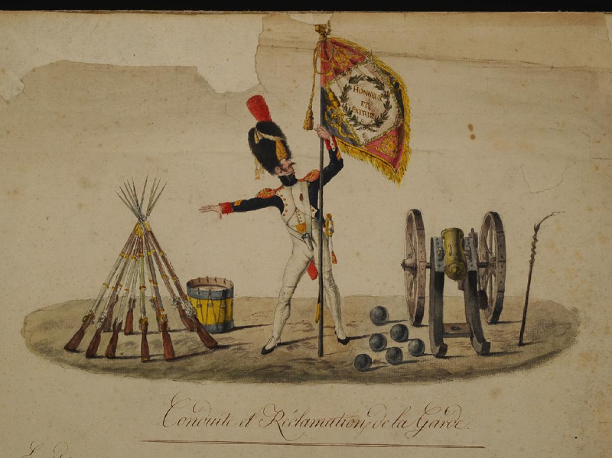 Handwritten text on a poster format, with a watercolor header depicting a standard-bearer of the Foot Grenadiers of the Imperial Guard, surrounded by a bundle of flags and a howitzer.