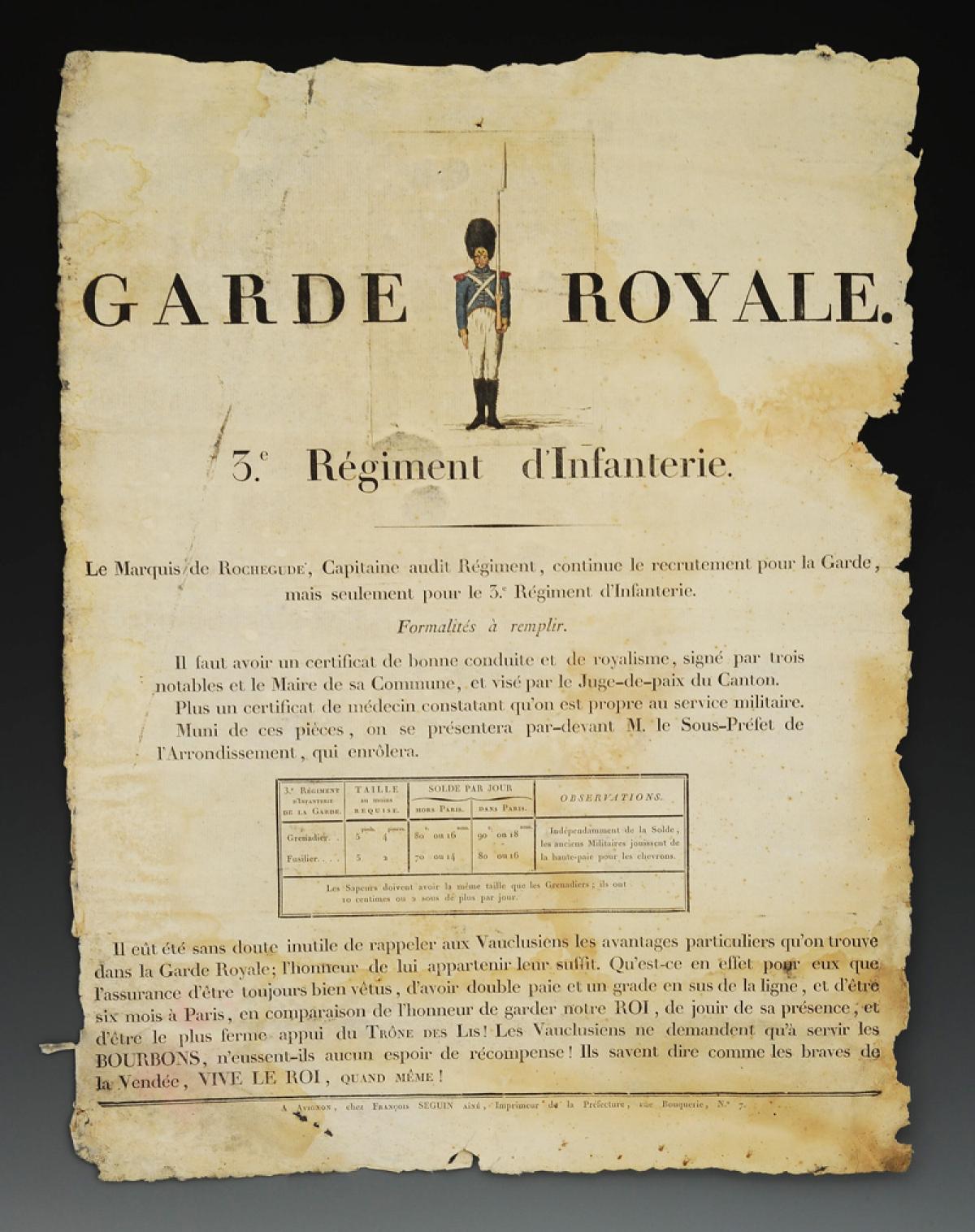 Color-printed poster for the recruitment of the 3rd Regiment of the Royal Guard Infantry by the Marquis de Rochegude.