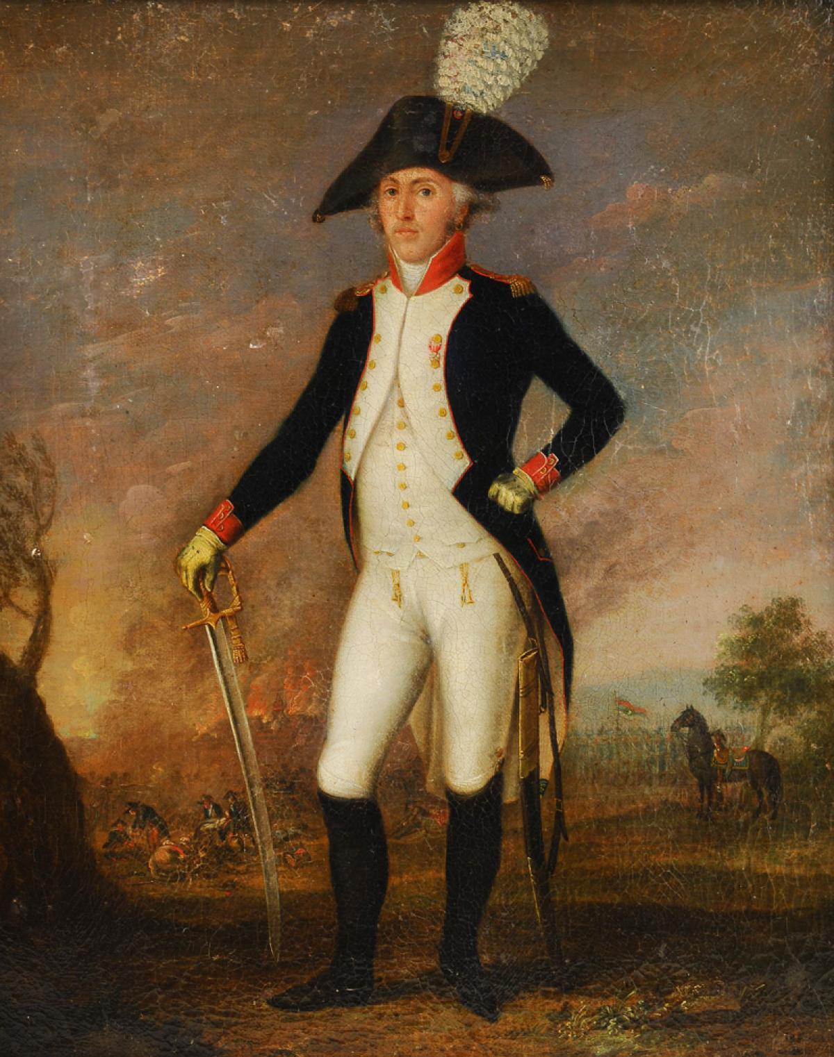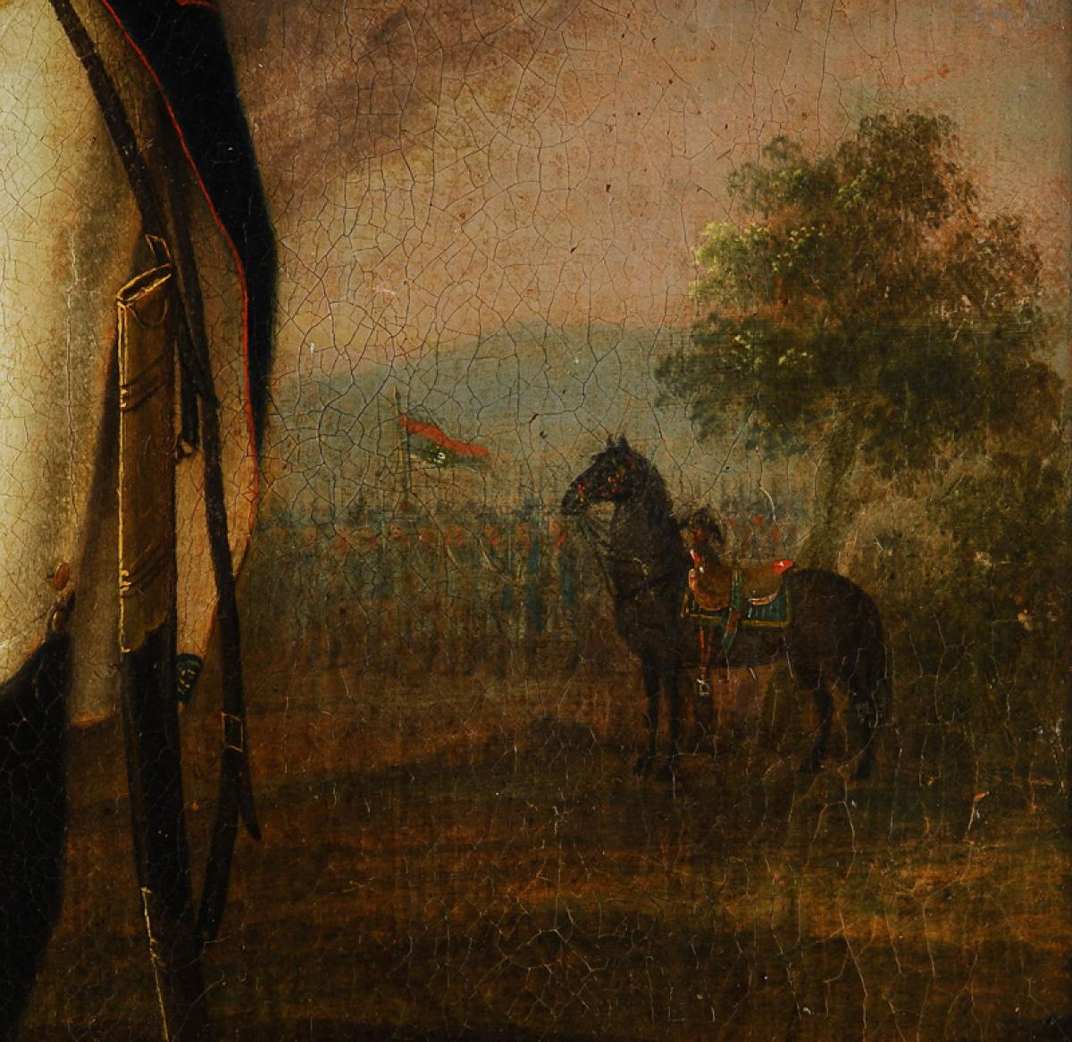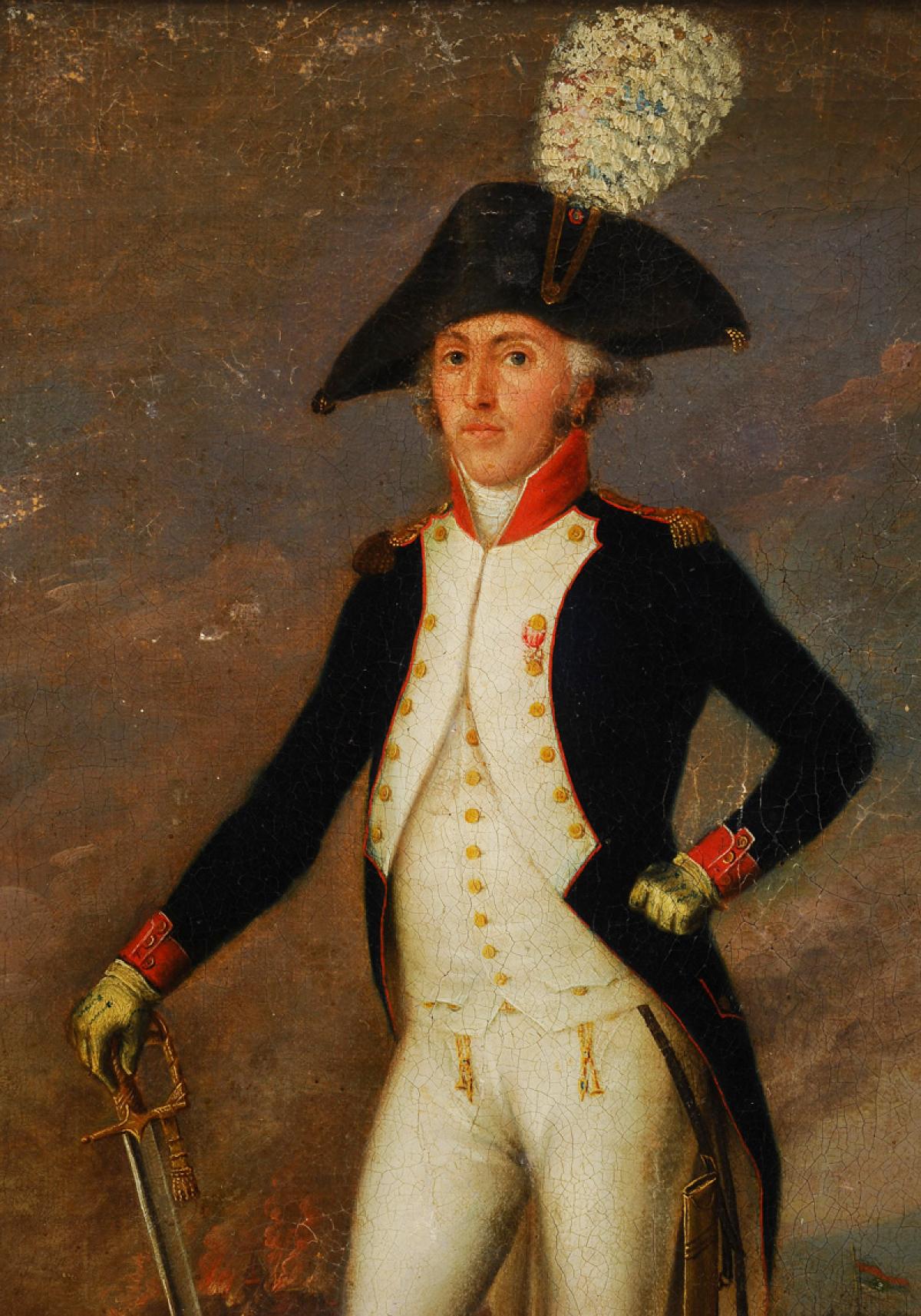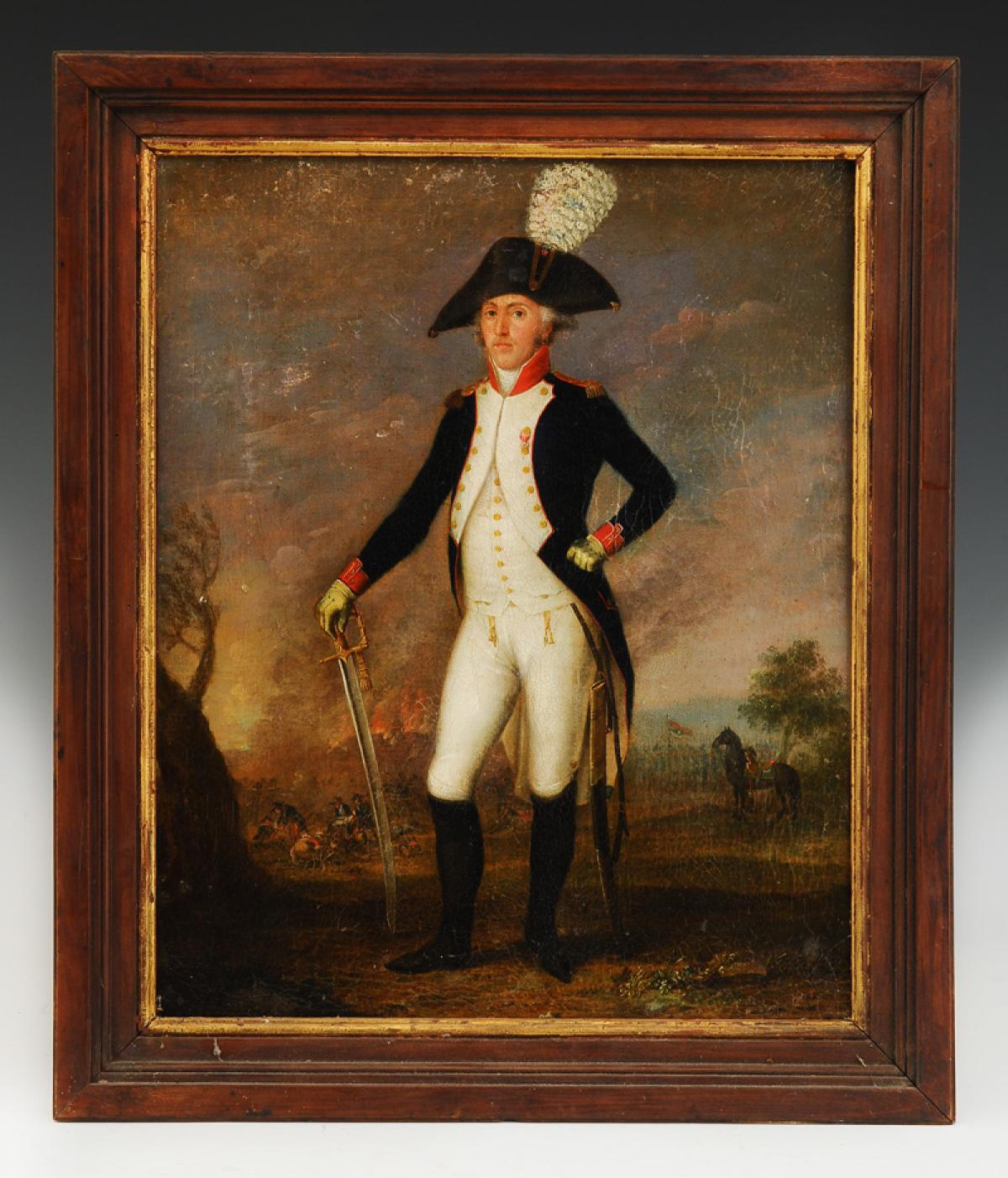 Anonymous oil on canvas depicting a full-length portrait of an infantry captain of the line in dark blue uniform, scarlet collars and cuffs, white lapels, bicorne hat with white plume and gold trimmings.