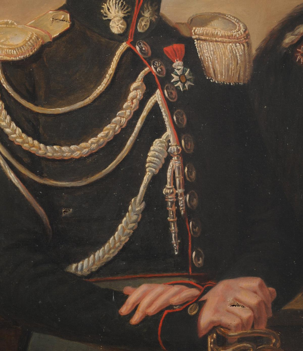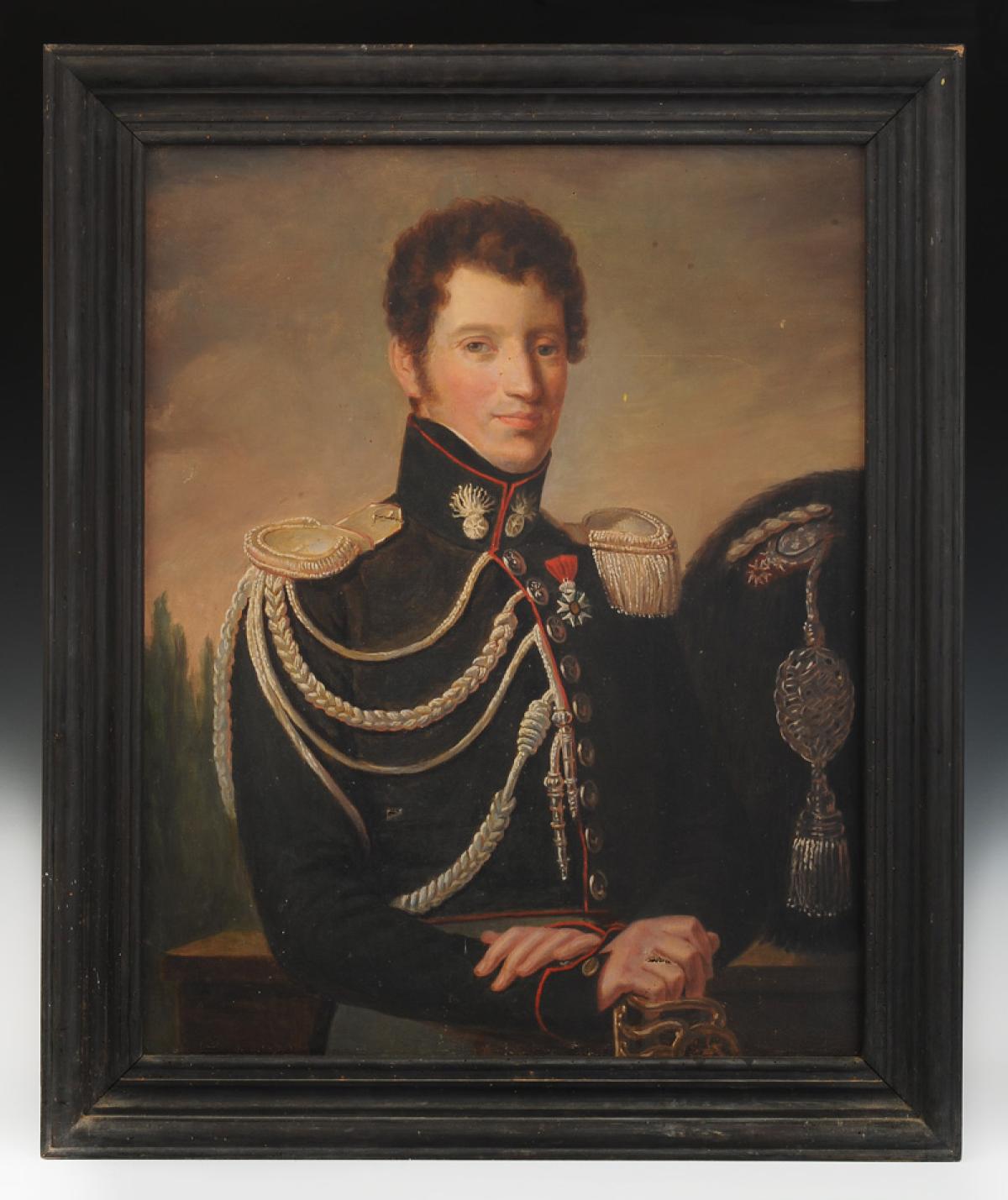 Anonymous oil on canvas. Bust portrait of a lieutenant of the Grenadiers on horseback of the Royal Guard, wearing a dark blue uniform piped in scarlet with silver buttons and silver grenade decorations at the collar, epaulettes, shoulder knots, and aiguillettes. He is depicted with crossed arms on the hilt of his sword, with his bearskin hat in the background showing the back portion with the silver Arms of France and its silver aiguillette cord.