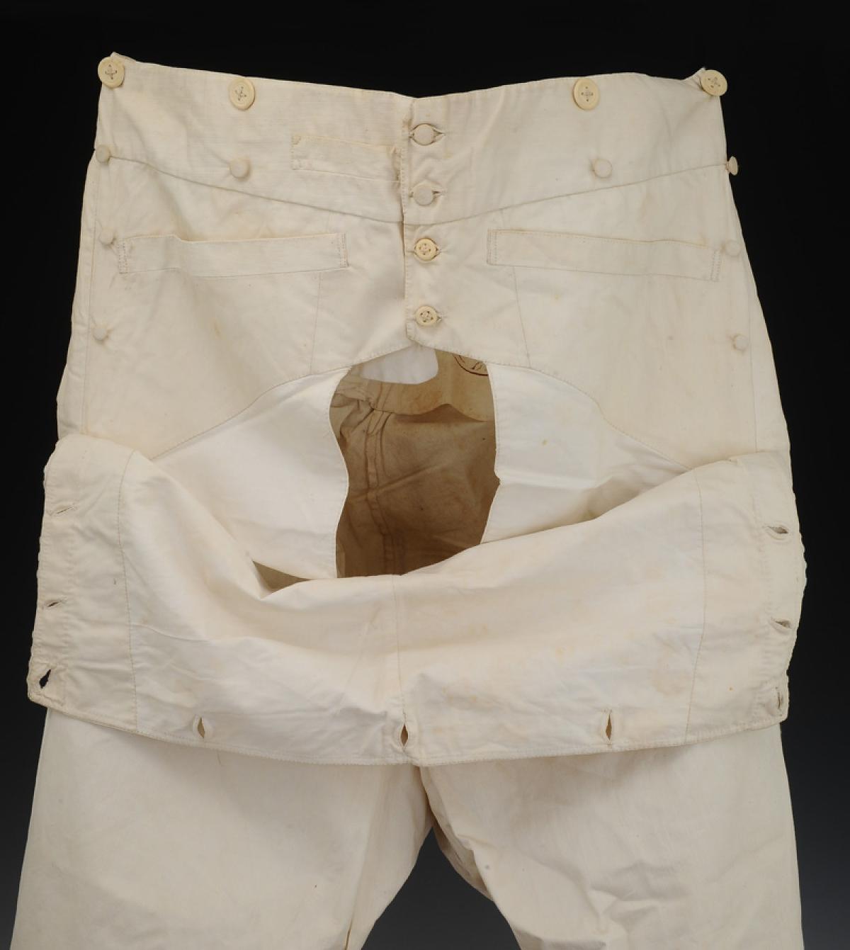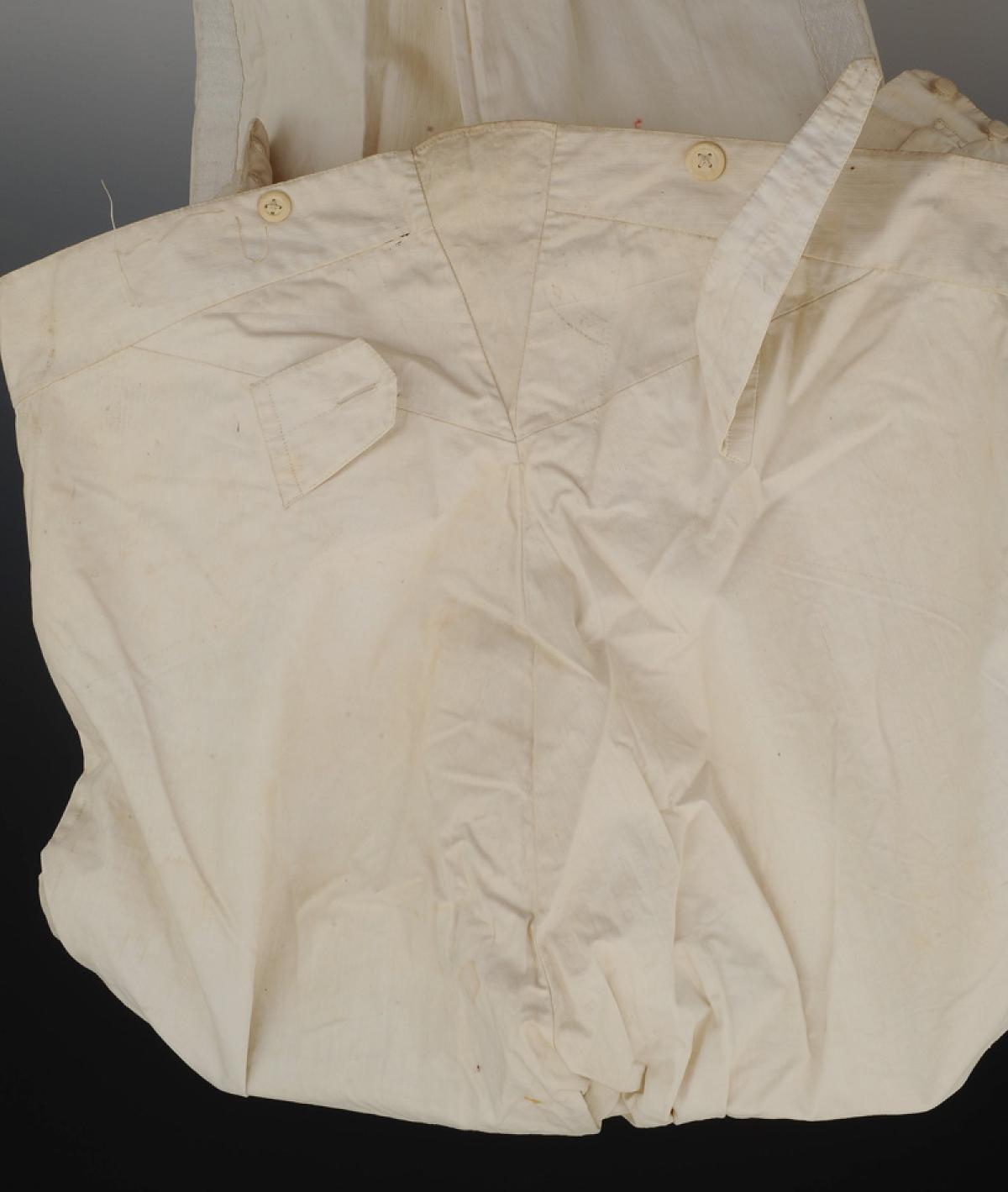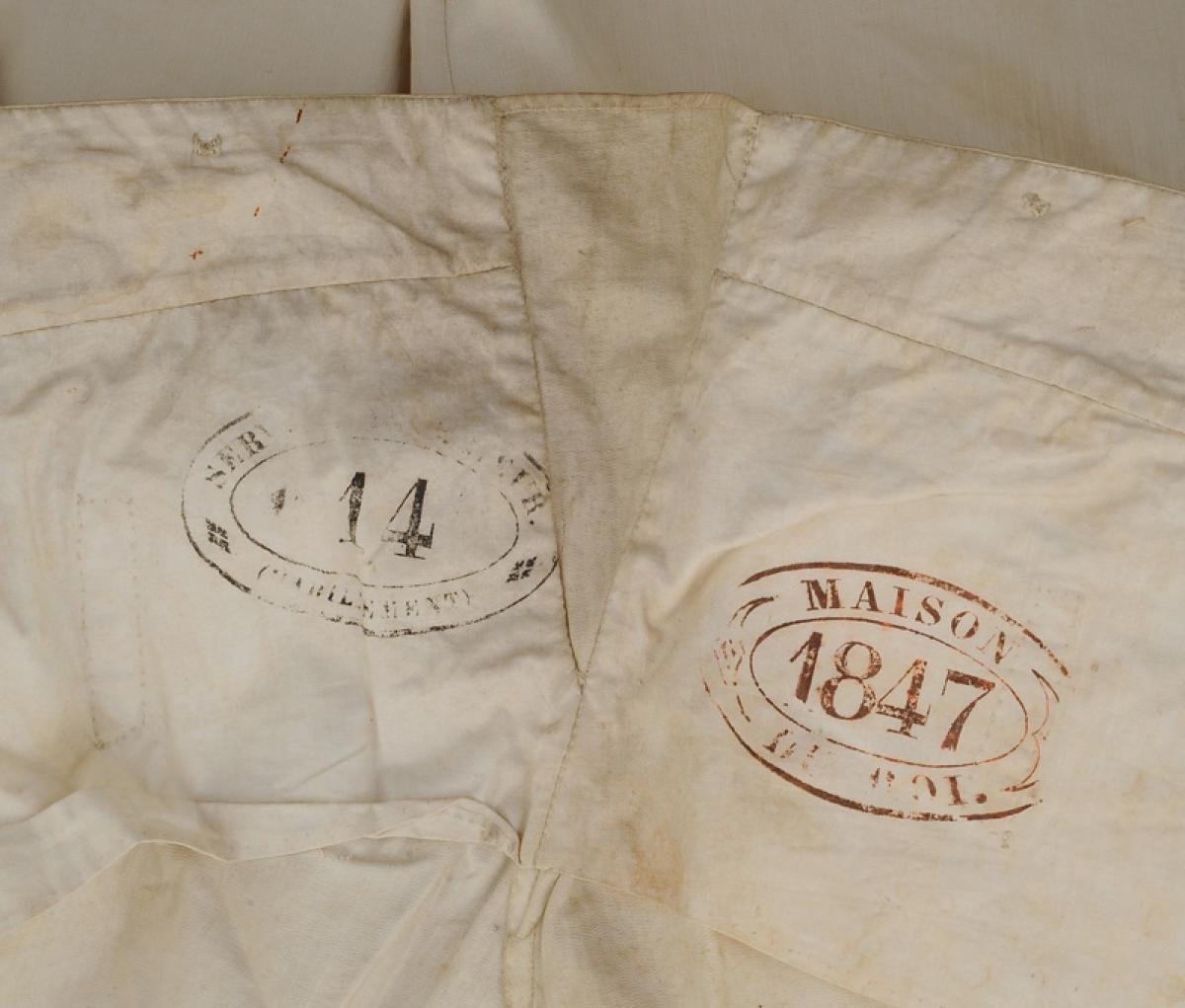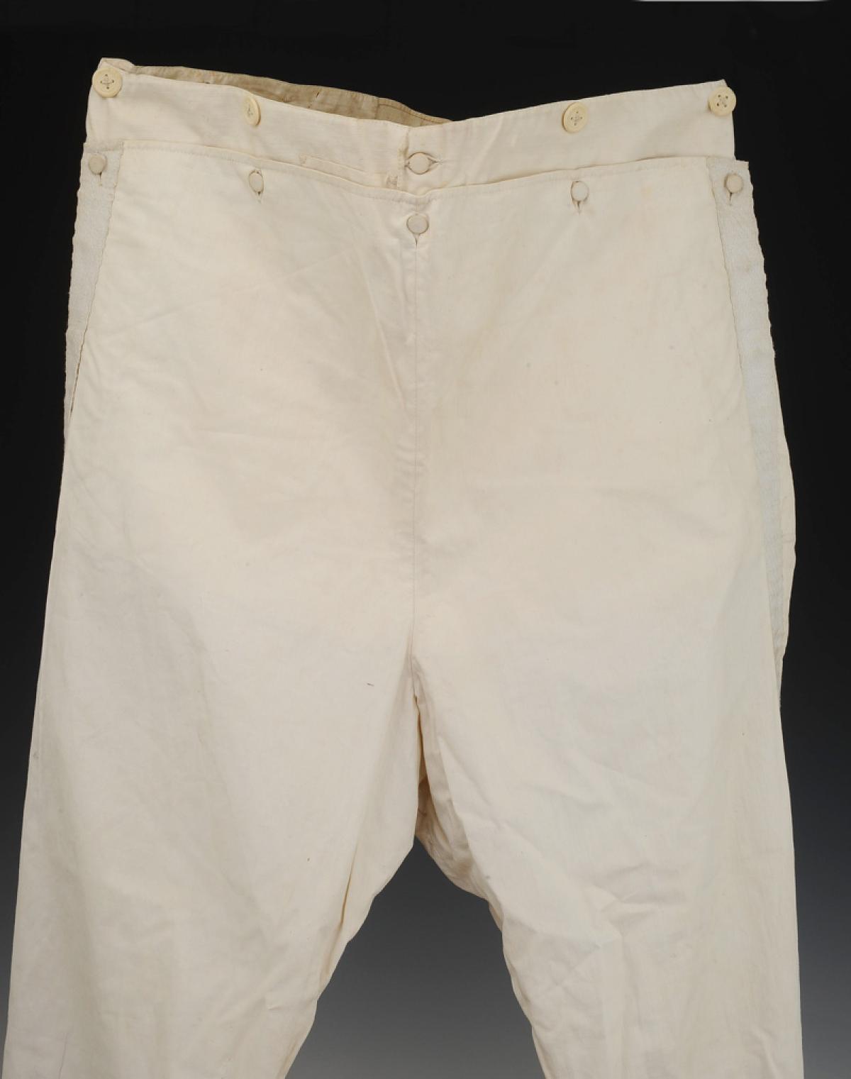 Made of white cotton fabric, adorned on the sides of the legs with white woven braid with scalloped edges. Fastens at the front with buttons covered in white fabric. At the waist level, six bone buttons for suspenders. Inside, it bears a large oval stamp in black ink marked "KING'S HOUSE. 1847" and a second stamp in black ink "SER... ...EUR / CLOTHING / 14".