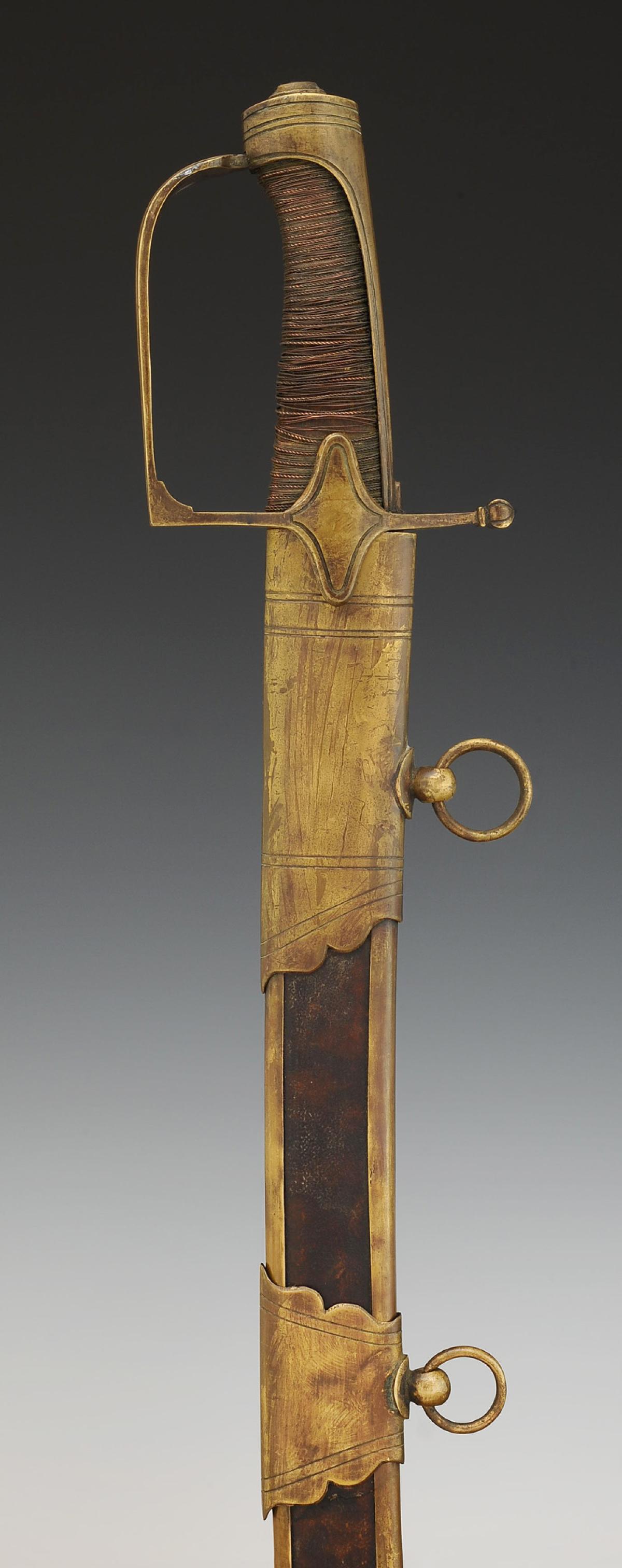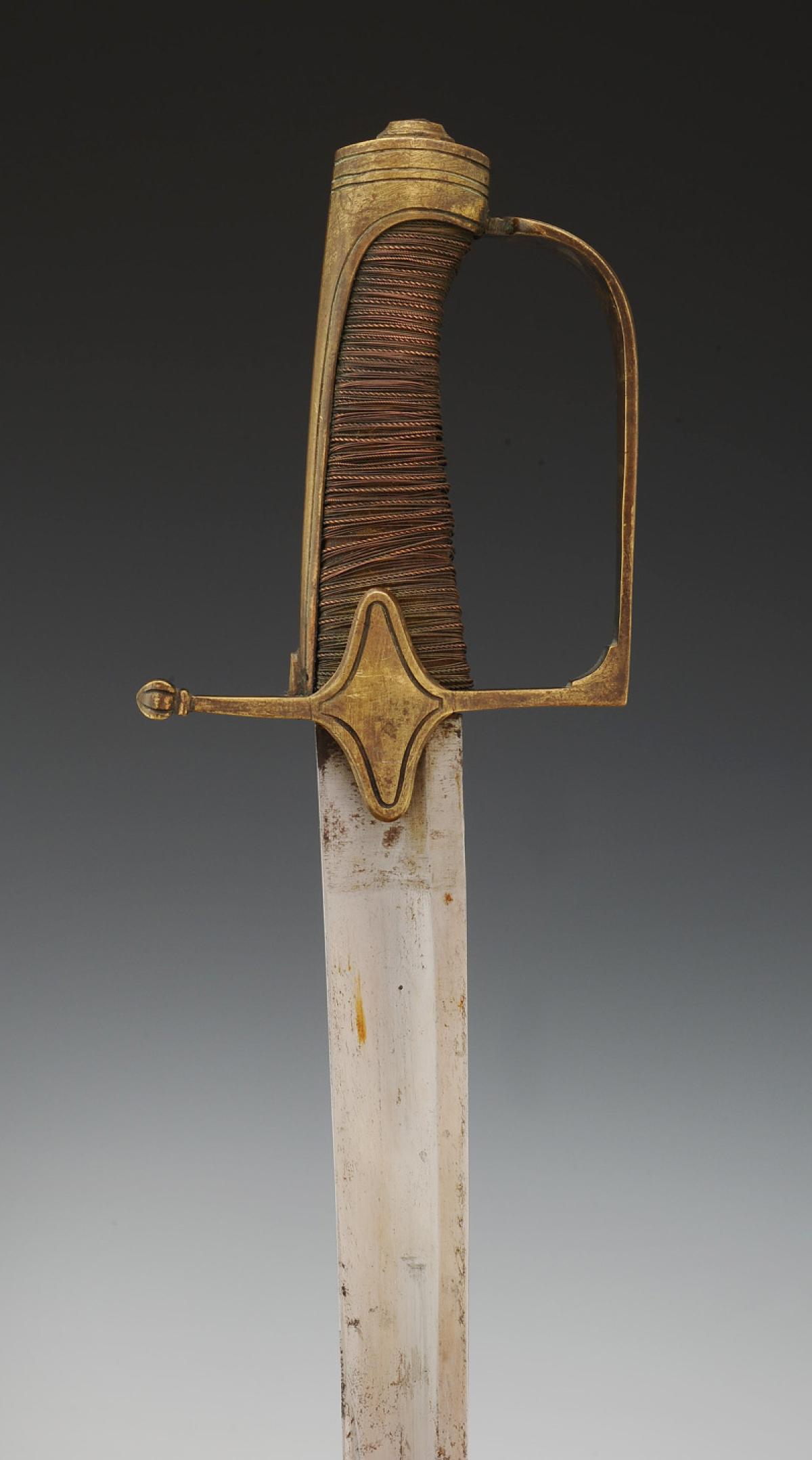 Brass hilt. Hungarian-style guard with one branch, with ear guards, faceted button on quillon, long tailed pommel decorated with lines. Hilt made of beech wood fully decorated with copper filigree. Slightly curved blade with hollow back and edges, 90.5 cm long. Scabbard made of beech wood covered in brown leather with brass decorations featuring lines and scalloped edges, chape and ring-bearing bracelet, brass straps, scabbard tip with iron tip.