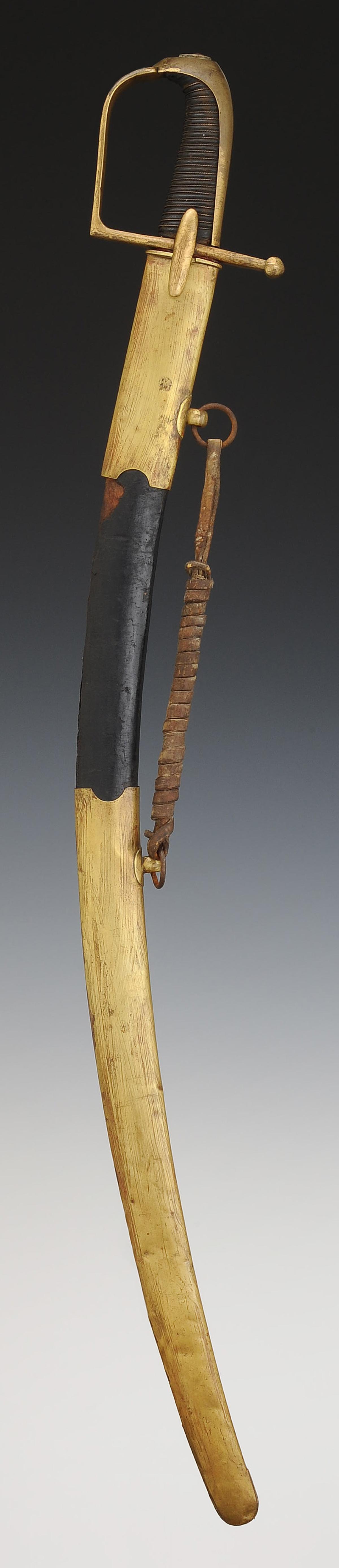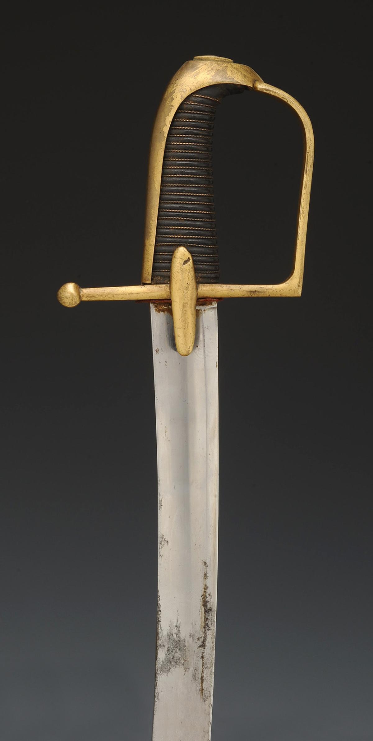 Brass hilt. Guard with a single branch stamped with a rooster (stamp for revolutionary productions from 1793), marked with the name of the supplier "LIORARD". Long-tailed pommel, handle in black waxed veal leather-covered beechwood, brass filigree. Curved blade with hollow edges, length 82.5 cm. Scarlet cloth tie. Beechwood scabbard covered in black varnished leather with two large brass fittings with scalloped edges on the inside, brass belt rings and steel rings. Brass dagger entirely filed. Cap with bowl entrance.