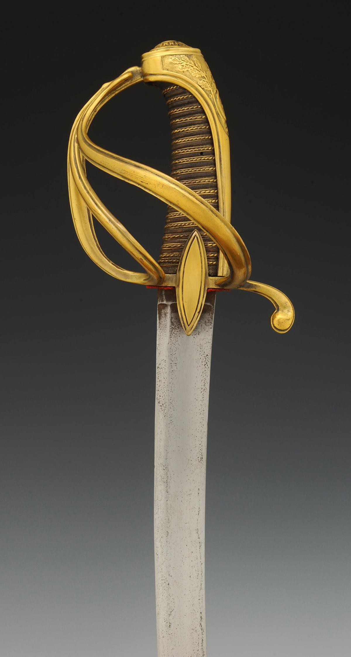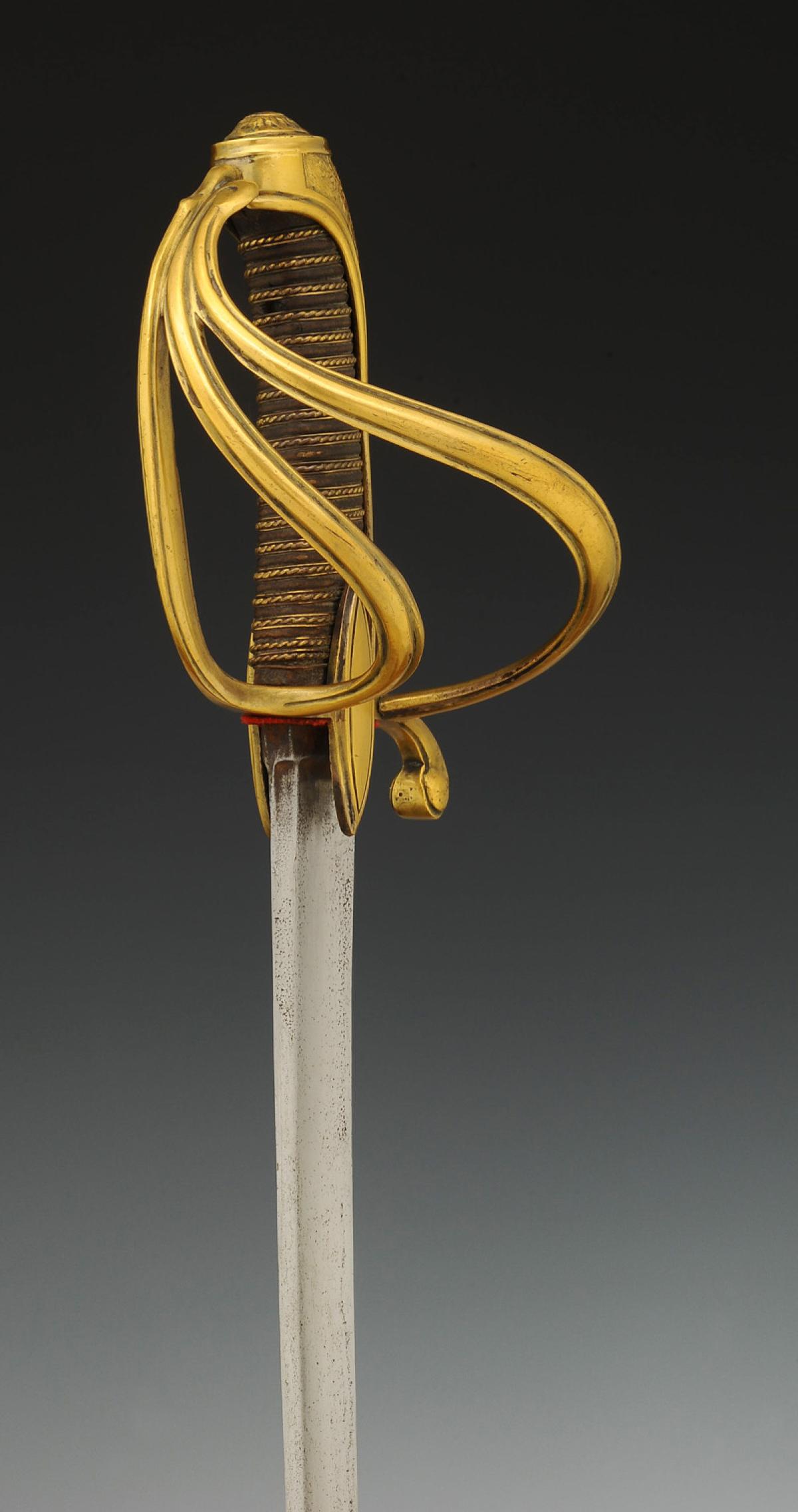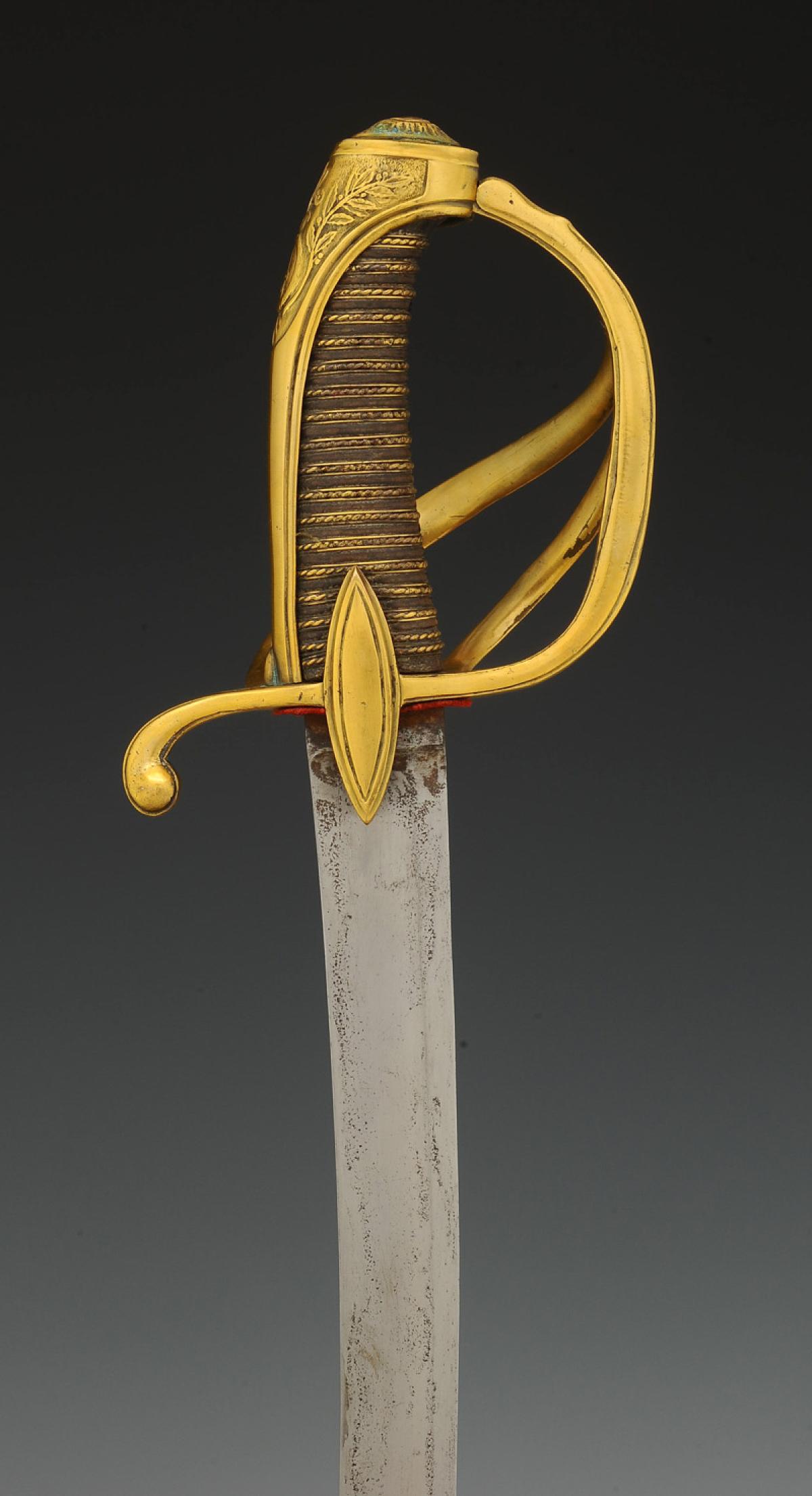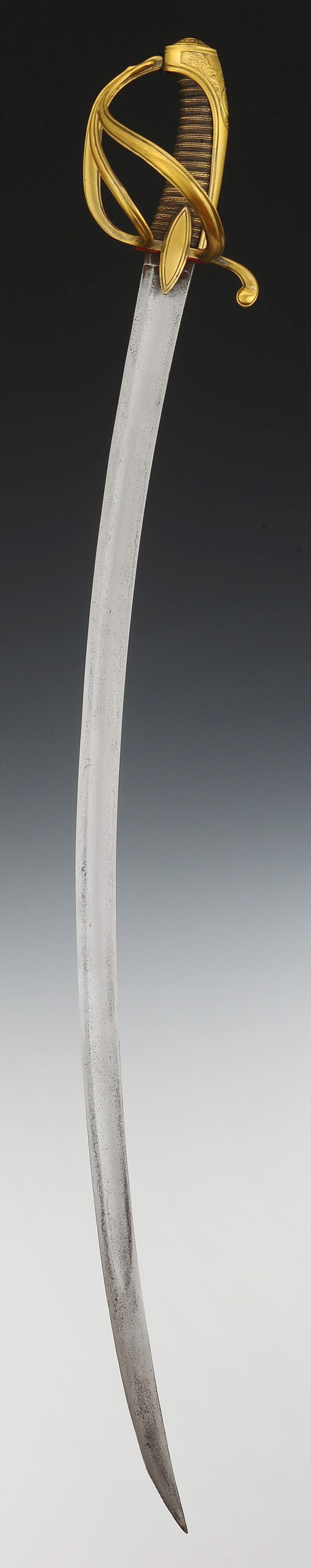 Gilt brass hilt. Three-branch guard. Pommel with a long tail decorated with oak and laurel branches and a fleur-de-lys medallion. Beech wood grip with brass filigree. Curved white blade with hollow flutes, 84 cm in length. Scarlet cloth knot. Iron scabbard with two gilt brass relief moulded fittings of volutes and palmettes, gilt brass rings and staples, gilt brass protruding scabbard throat. Steel scabbard tip.