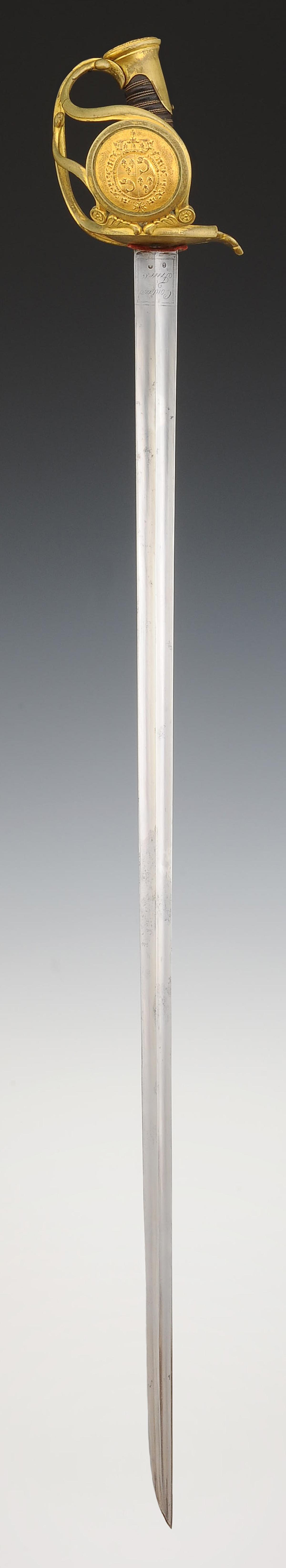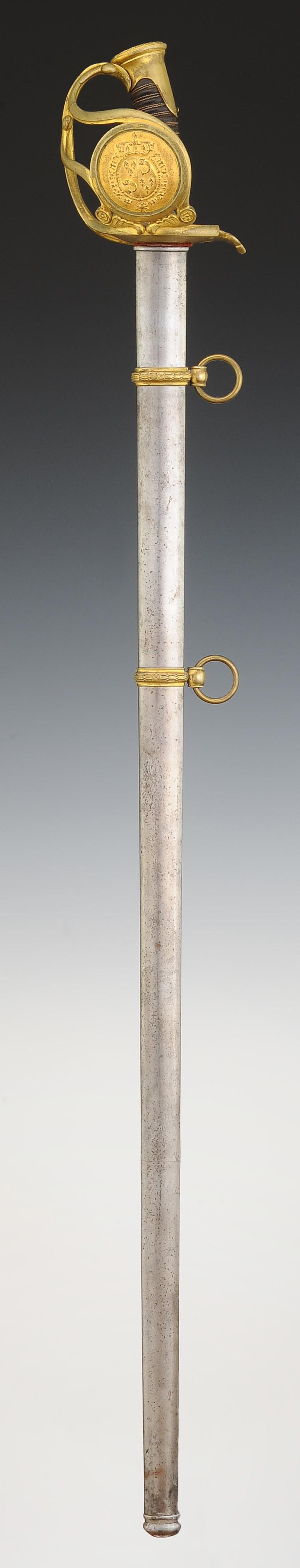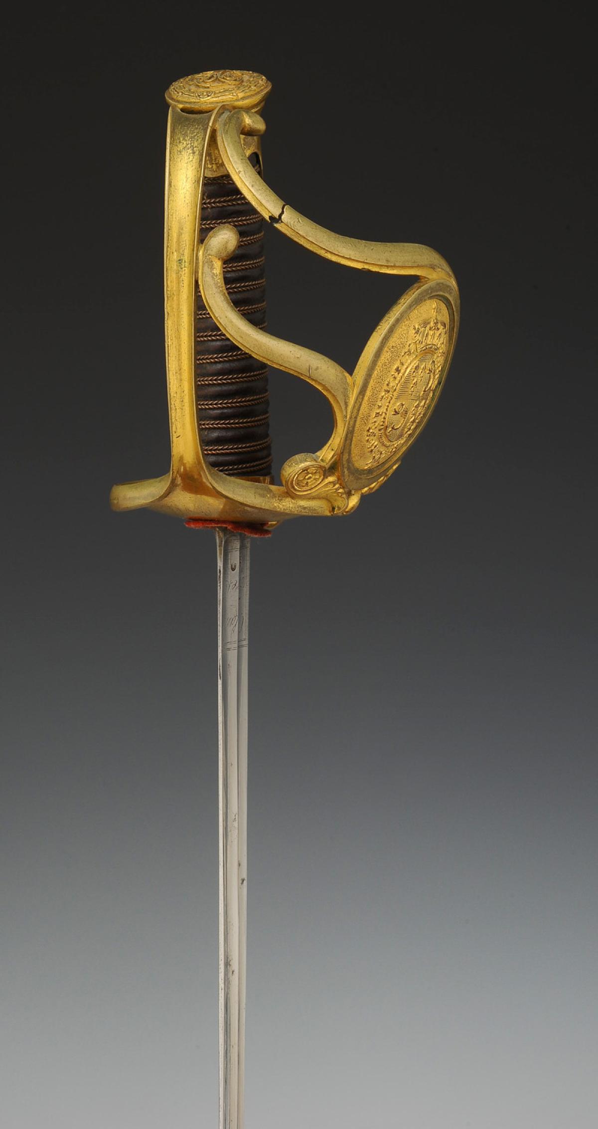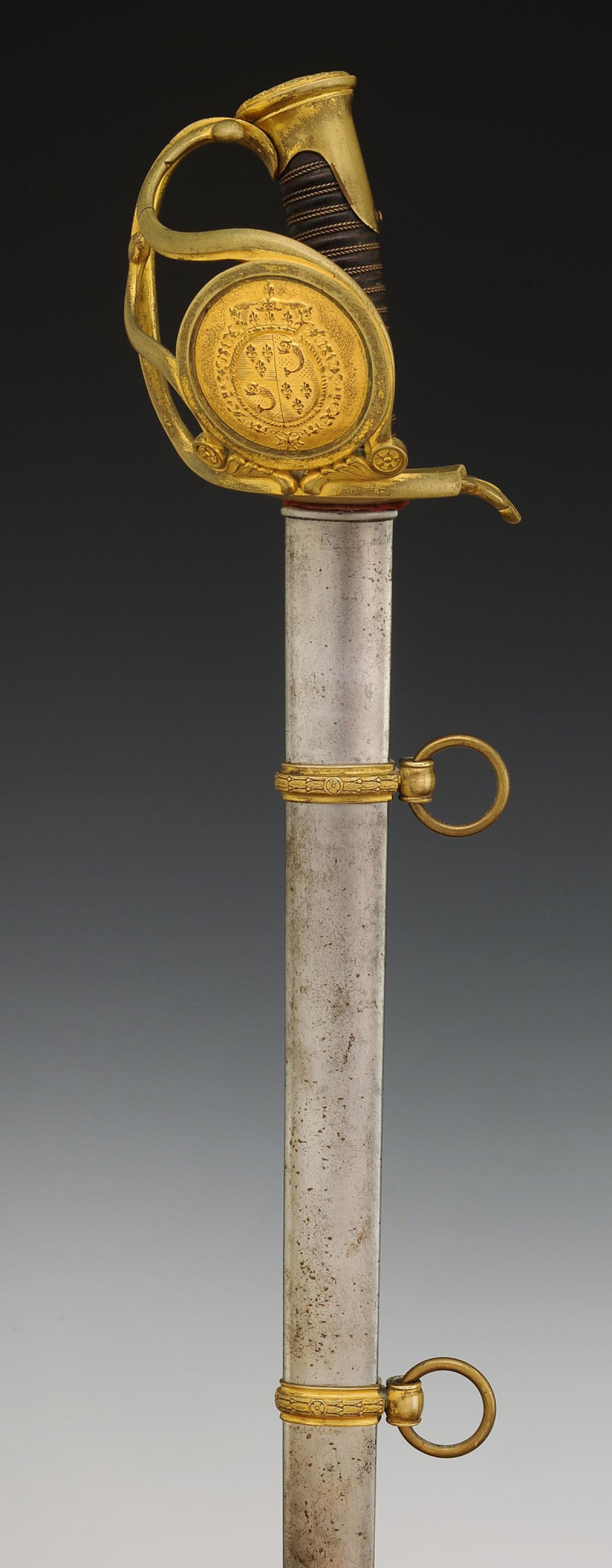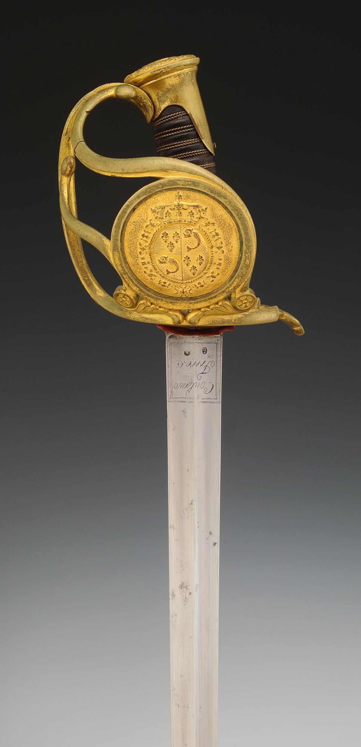 Gilded bronze hilt. Guard with three branches forming a shell at the front in the shape of a round medallion decorated with the Coat of Arms of the Dauphin. Handle made of black waxed calf-skin covered beech wood, with brass wire filigree. Cap with a short tail and pommel decorated in relief with the initials "PA" for Philippe d'Artois (the Dauphin). Straight and white blade with two gutters, signed on the front face at the base "Coulaux / Frères" with the stamps "B" with a star by E.L. Borson, inspector from August 1814 to September 1816 and "B" surrounded by a chain by J.G. Bick, first class controller from May 1815 to August 1824, and on the back face "Manufre / Rale / du / Klingenthal". Blade length 91.5 cm. Scarlet cloth tie. Steel scabbard with prominent cup with two brass gilded belt rings decorated with laurel leaves, brass gilded loops and rings. Iron chape.