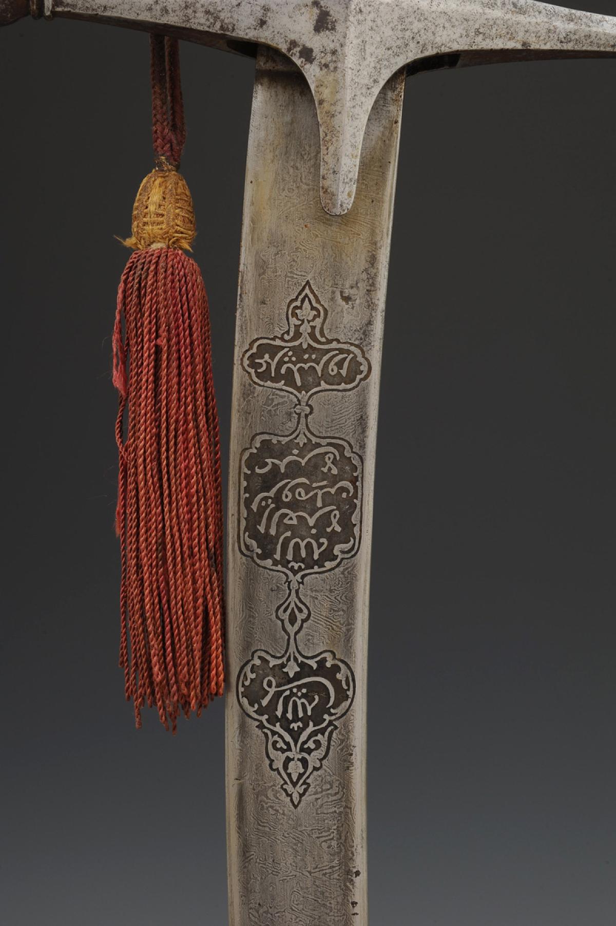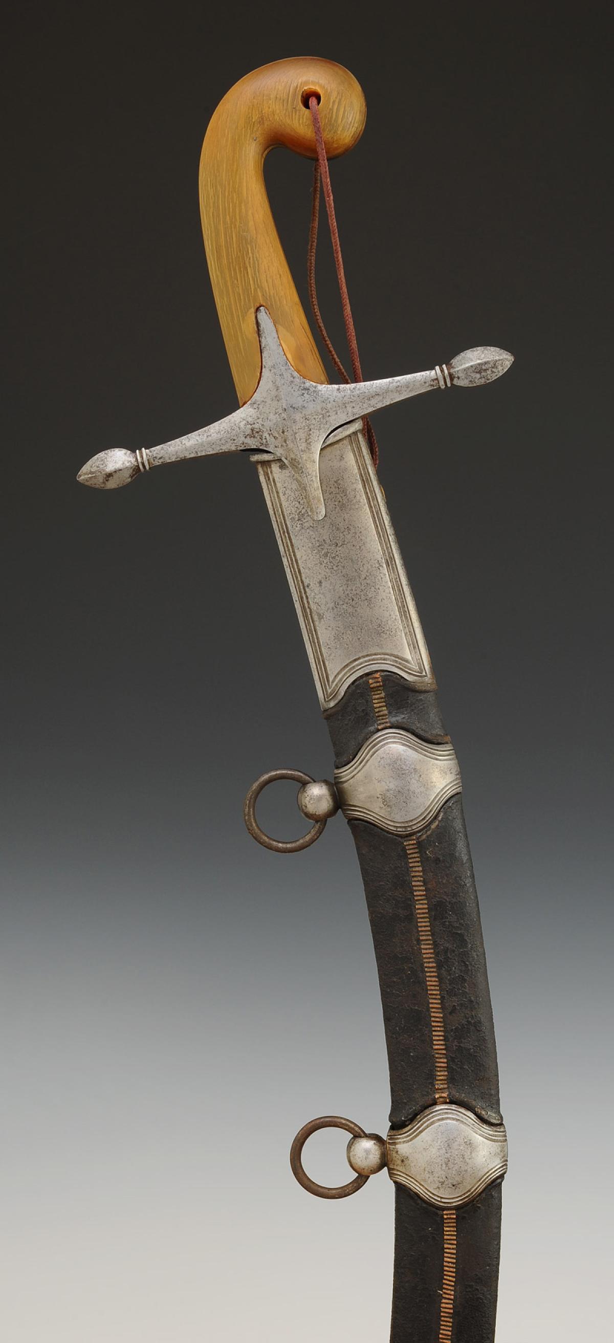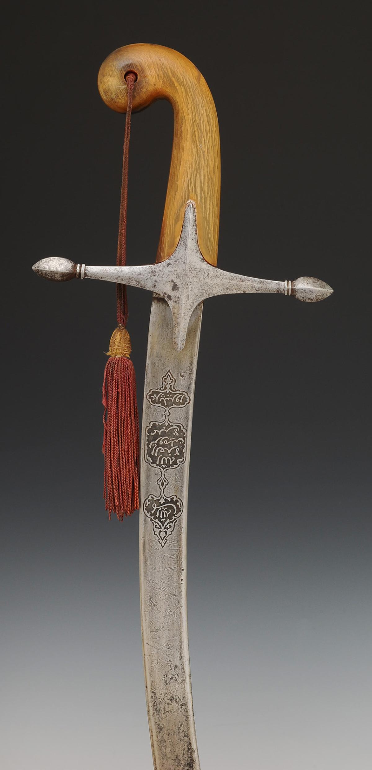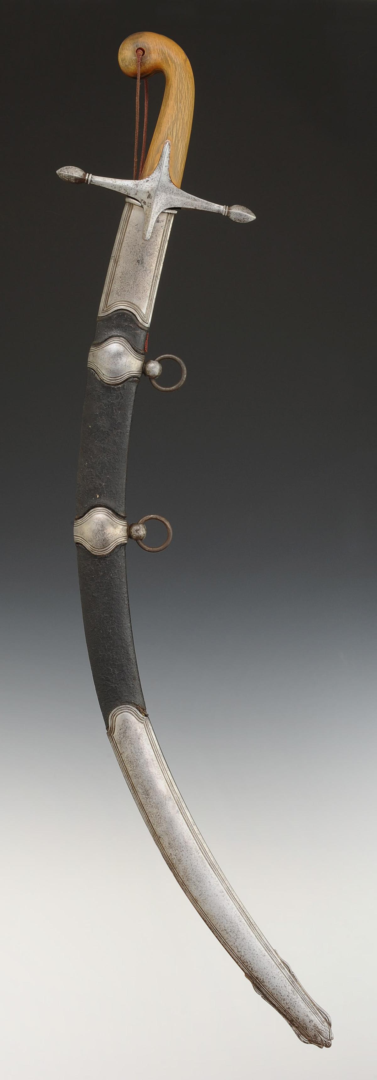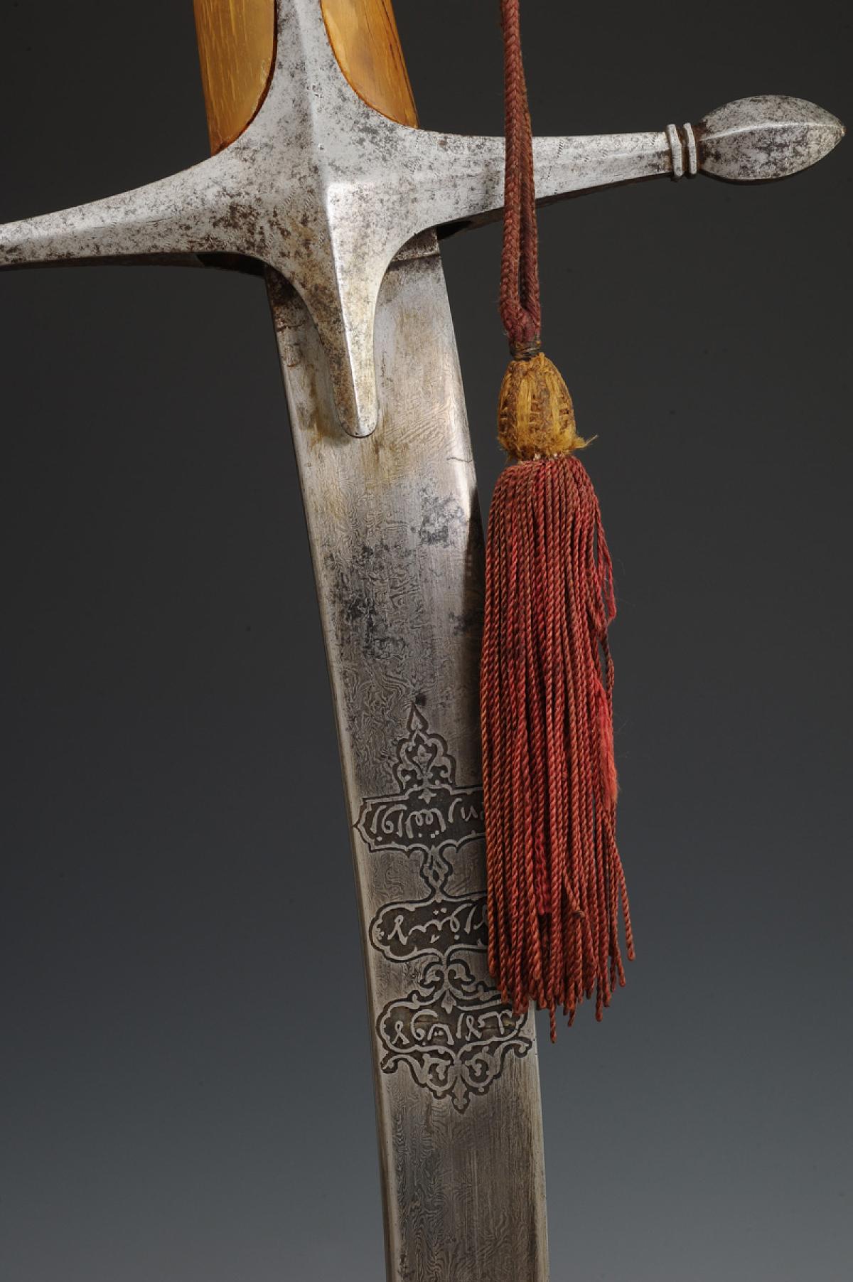 Steel hilt. Crossguard with double horizontal quillon. Blonde horn handle with transverse perforation for the passage of the wrist cord at the pommel level. Curved damascus blade acid-engraved near the cartouche heel with Arabic inscriptions on the verso "Allah" / "Glory to Allah" / "His servant Turmelin" (the owner), and the name of the blacksmith "Pleuror"; on the recto "There is no youth but Ali and no sword but Dhul-Fiqar" and the date: "1271" (1854/1855), length 69 cm. Black waxed calfskin-covered wooden scabbard, with spring stitch in silver-plated copper thread, with four steel fittings decorated with relief line moldings. Garance and jonquille passementerie wrist cord.
