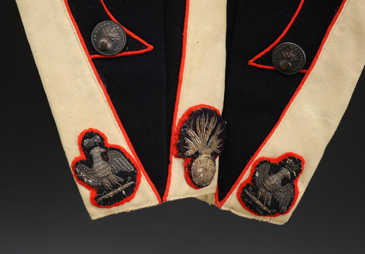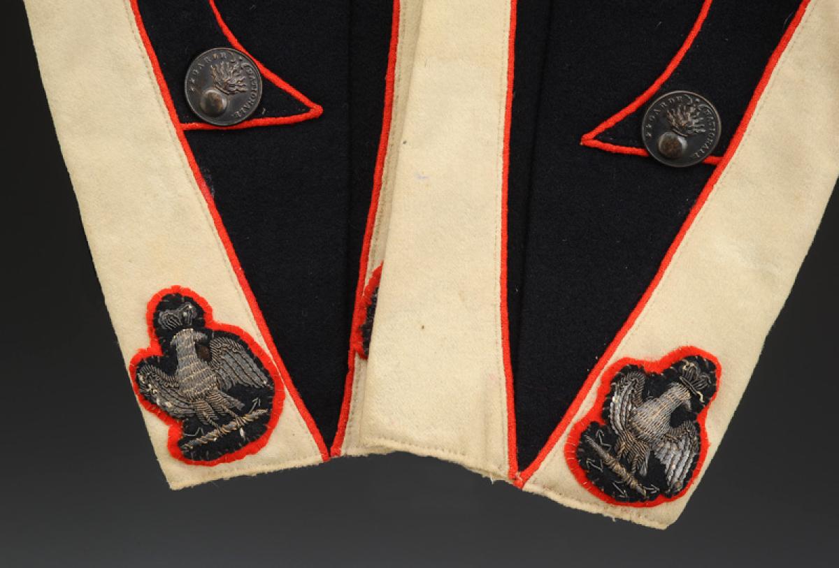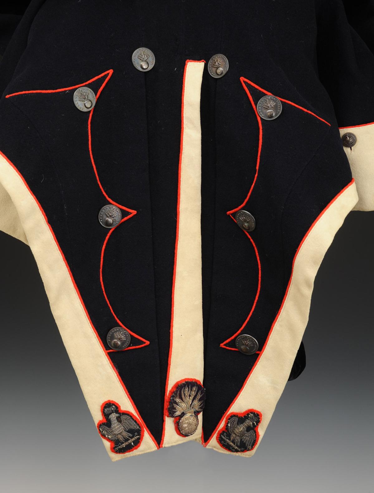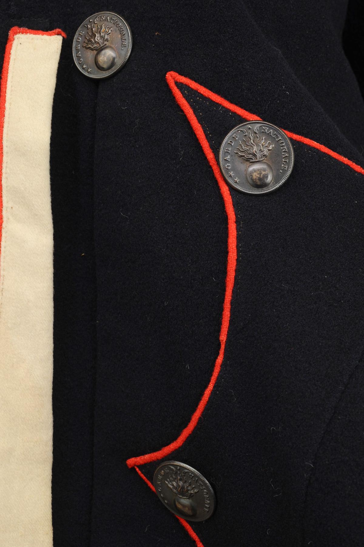 Dark blue wool coat entirely piped in scarlet, closing straight at the front with 17 metal hooks. Lapels in white wool piped in scarlet, each adorned with 7 small round uniform buttons Ø 1.7 cm, made of stamped silver depicting a flaming bomb with the motto "NATIONAL GUARD", two original buttons are marked BAYONNE. Straight collar, H 8 cm. Cuffs pointed with a small uniform button. False vertical back pockets forming three points, each point adorned with a large uniform button Ø 2.5 cm. Tails in white wool piped in scarlet, adorned at the bottom with imperial eagles and grenades embroidered in threads, silver sequins and silver bullion on dark blue wool, sewn on cut scarlet wool.