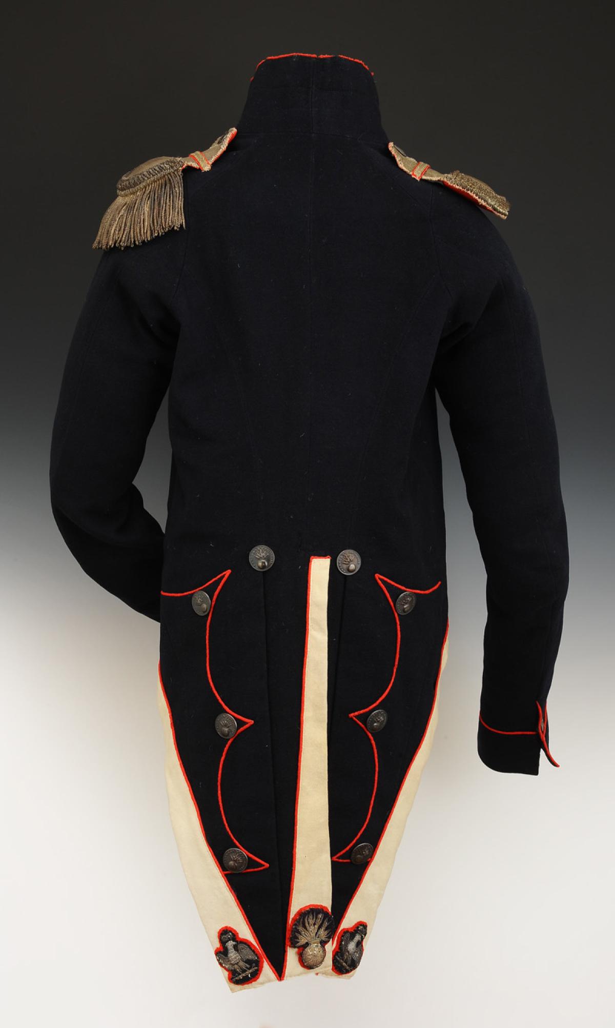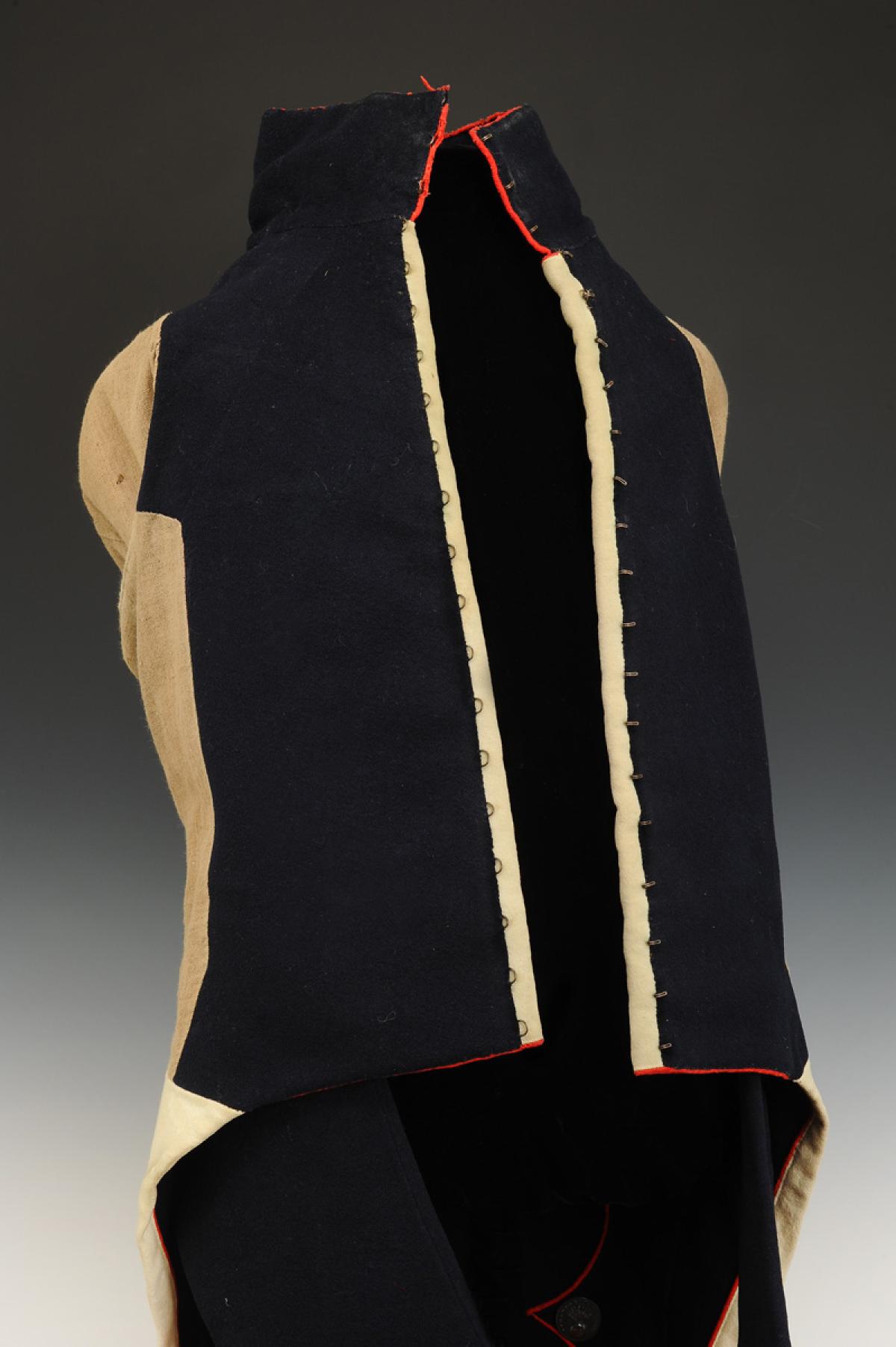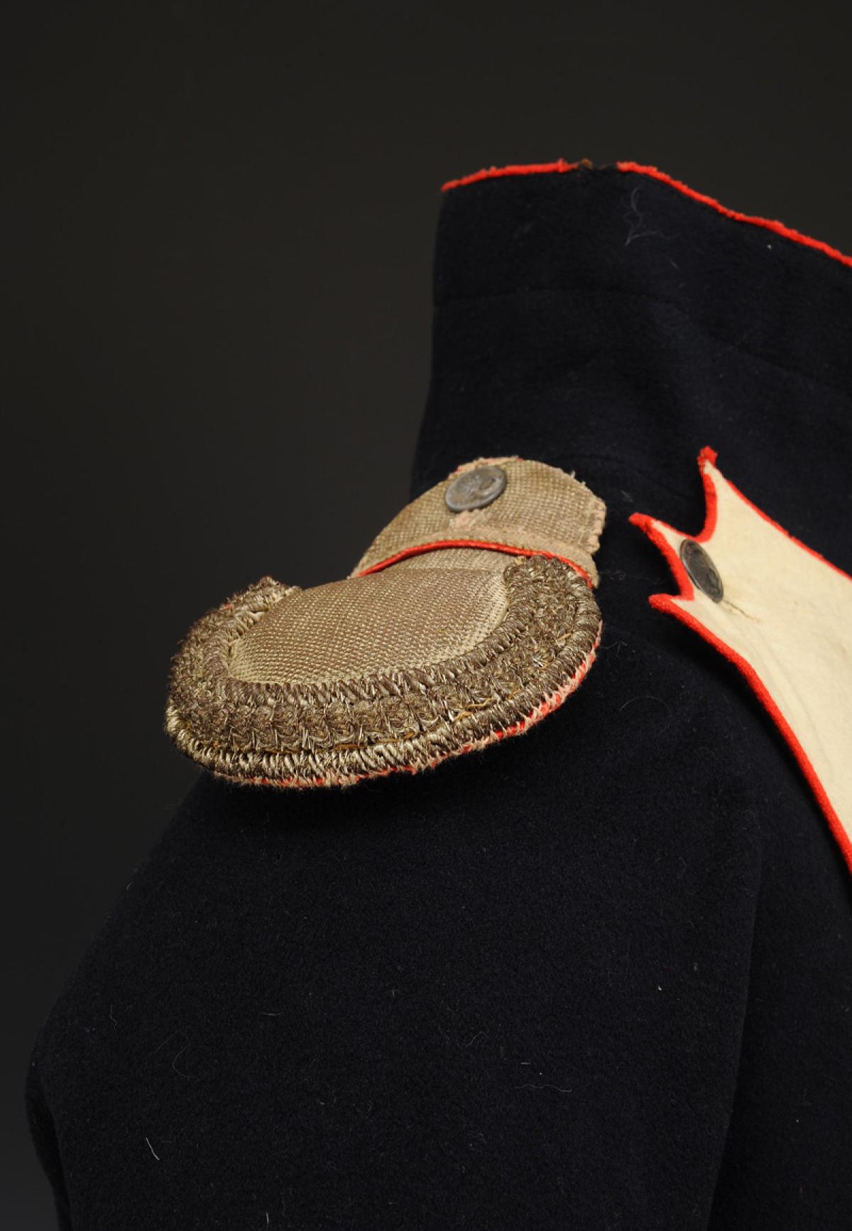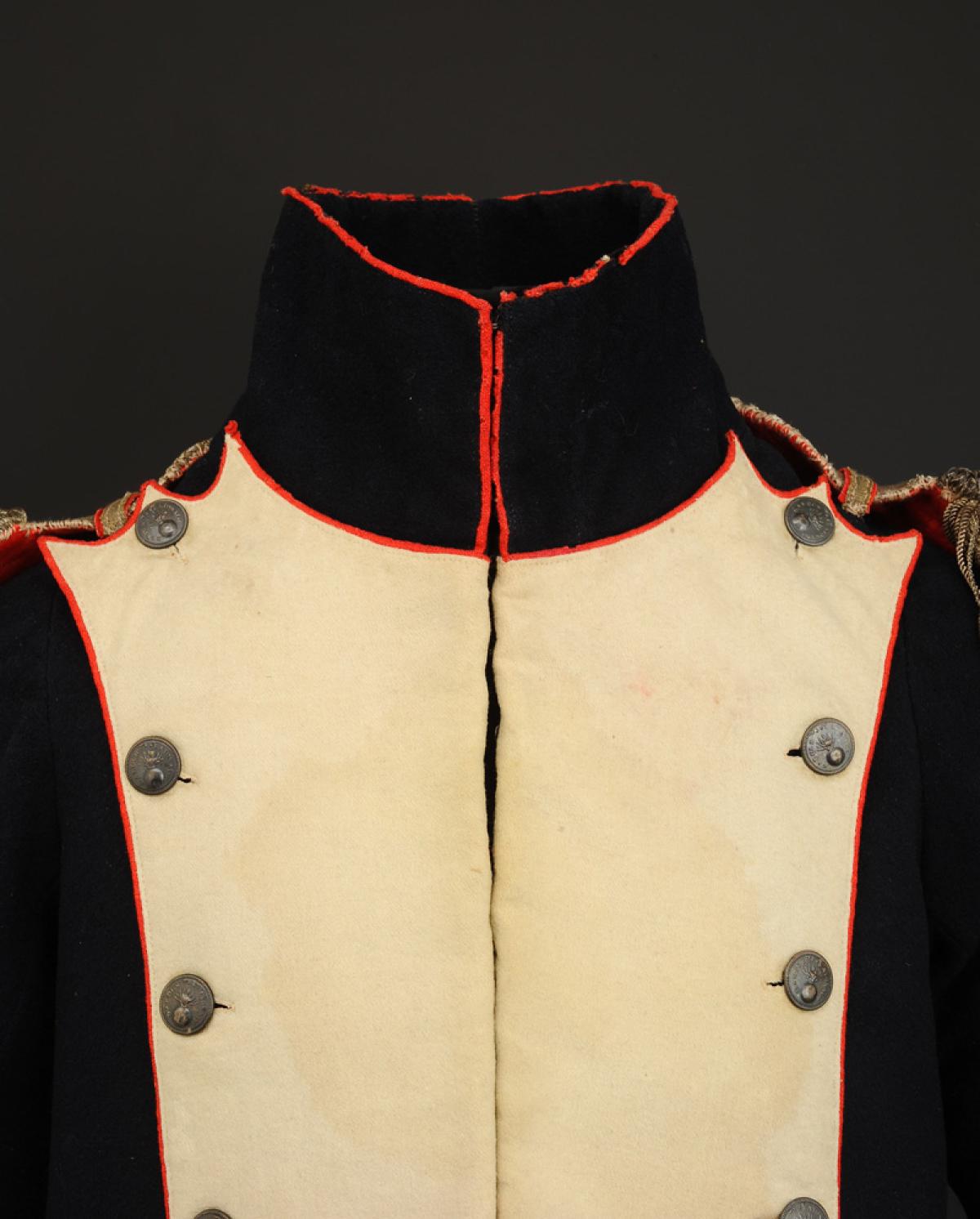 Dark blue wool coat entirely piped in scarlet, closing straight at the front with 17 metal hooks. Lapels in white wool piped in scarlet, each adorned with 7 small round uniform buttons Ø 1.7 cm, made of stamped silver depicting a flaming bomb with the motto "NATIONAL GUARD", two original buttons are marked BAYONNE. Straight collar, H 8 cm. Cuffs pointed with a small uniform button. False vertical back pockets forming three points, each point adorned with a large uniform button Ø 2.5 cm. Tails in white wool piped in scarlet, adorned at the bottom with imperial eagles and grenades embroidered in threads, silver sequins and silver bullion on dark blue wool, sewn on cut scarlet wool.