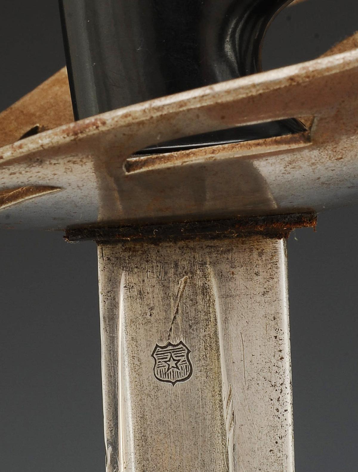 Iron hilt, seven-branch guard, cap with a short tail, wooden handle covered with black celluloid featuring ten flutes and an ergonomic grip for the index finger. Straight blade measuring 89.5 cm in length signed on the back "Manufacture d'Armes de Châtellerault JH." Coat of arms of Chile on the ricasso. Natural leather knot. Steel scabbard with one suspension ring and a movable ring.