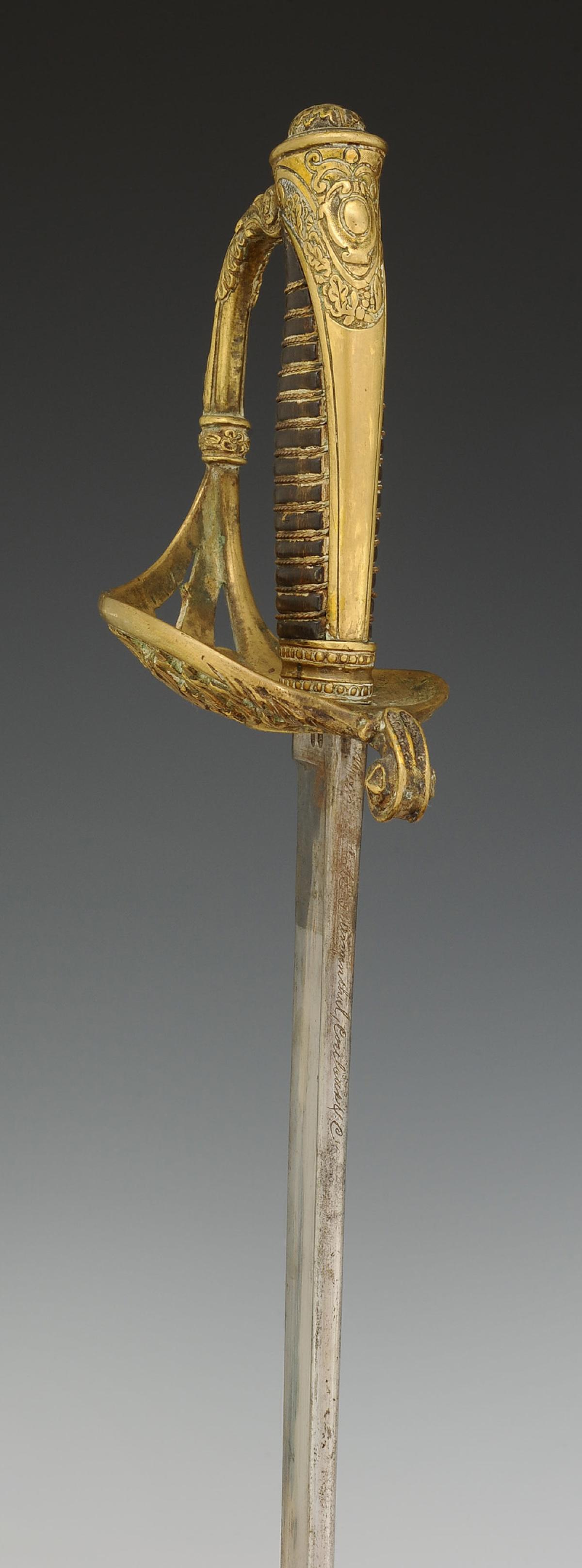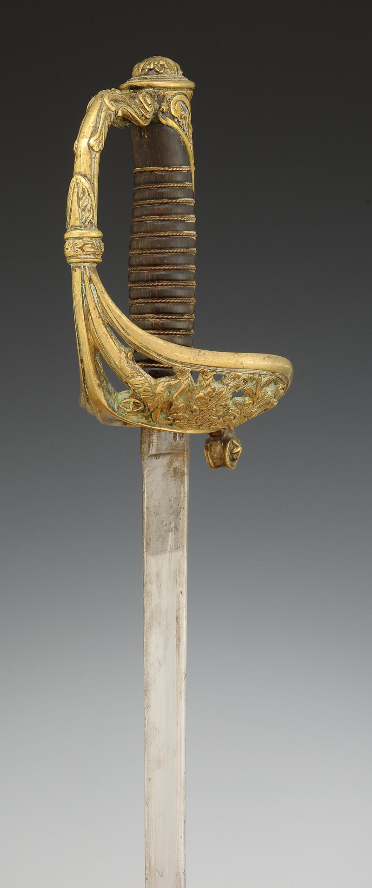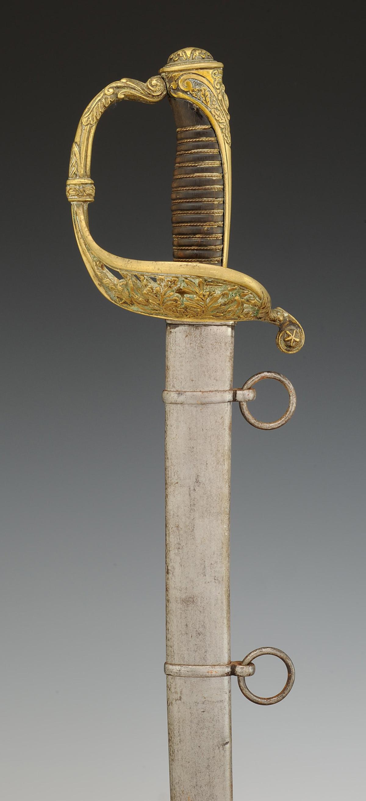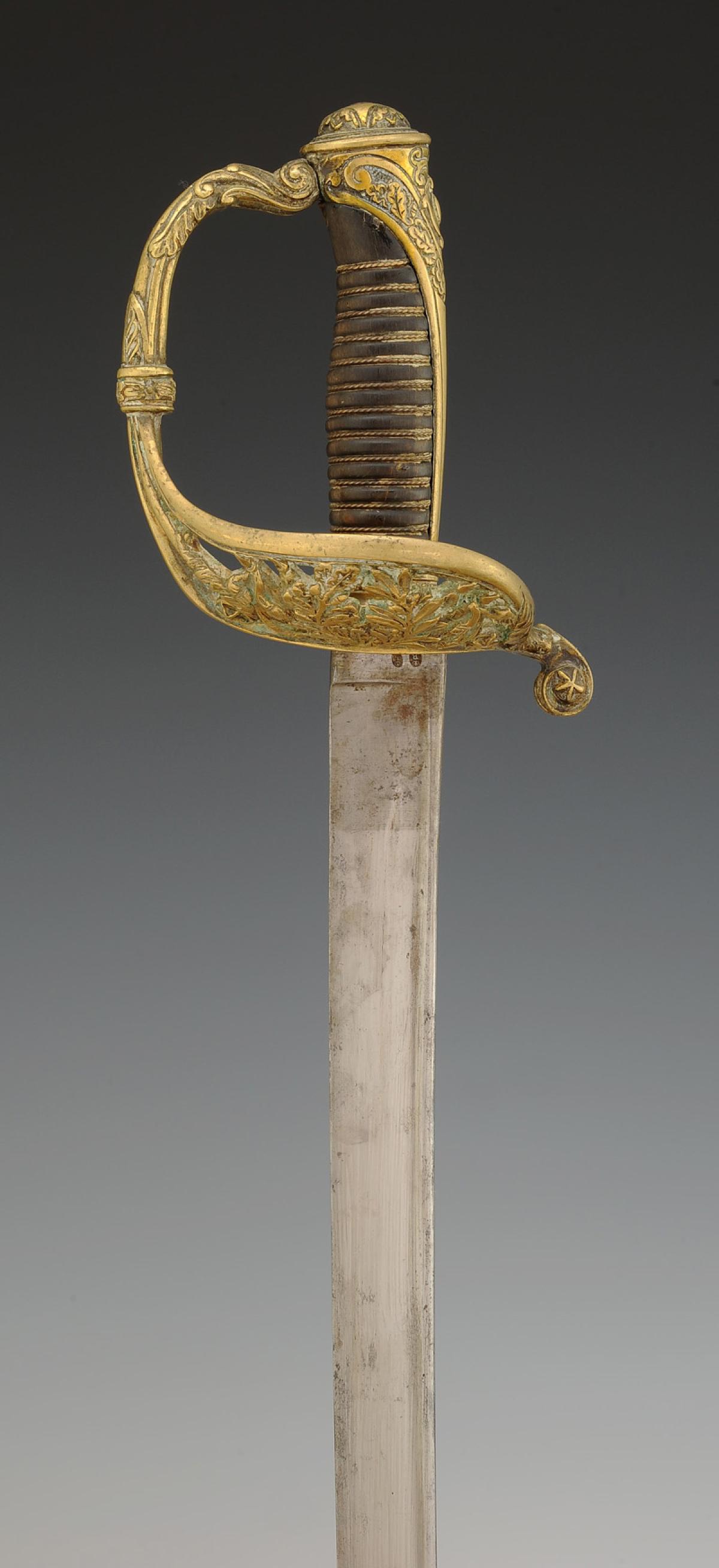 Brass hilt, guard with three branches forming a shell decorated with openwork foliage motifs, pommel with long tail decorated with foliage, filigree horn handle. Slightly curved blade, back edge at the tip with gutters and hollow facets, L 76 cm. Marked "Manufacture de Klingenthal, Coulaux." Steel scabbard with two suspension rings.