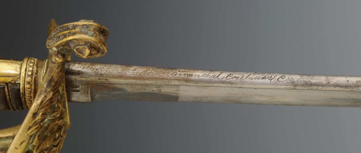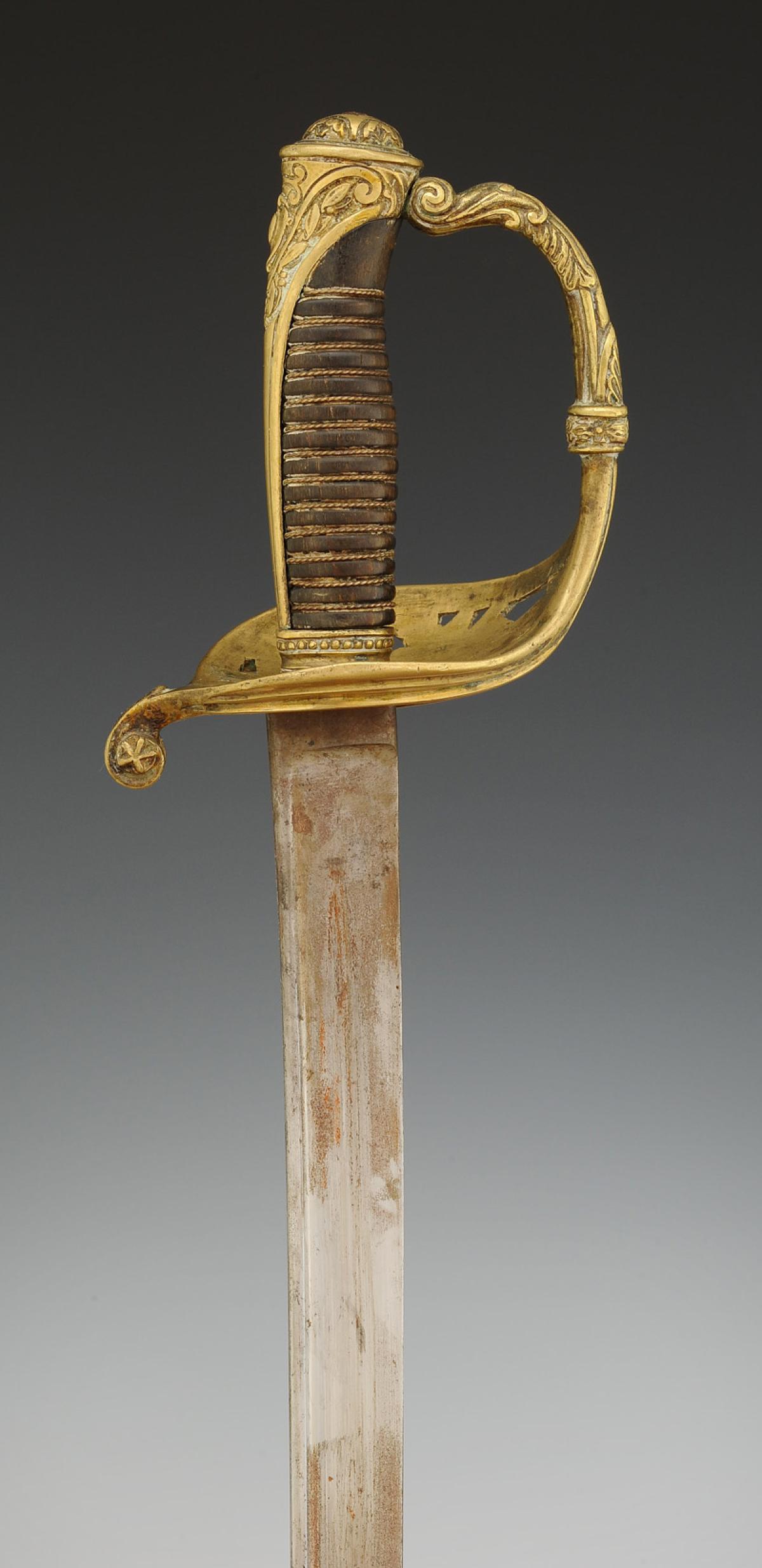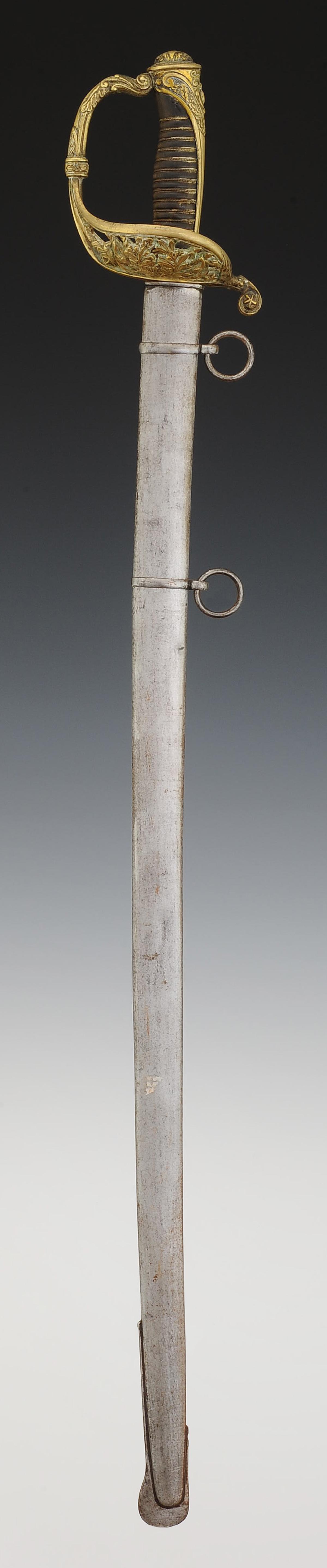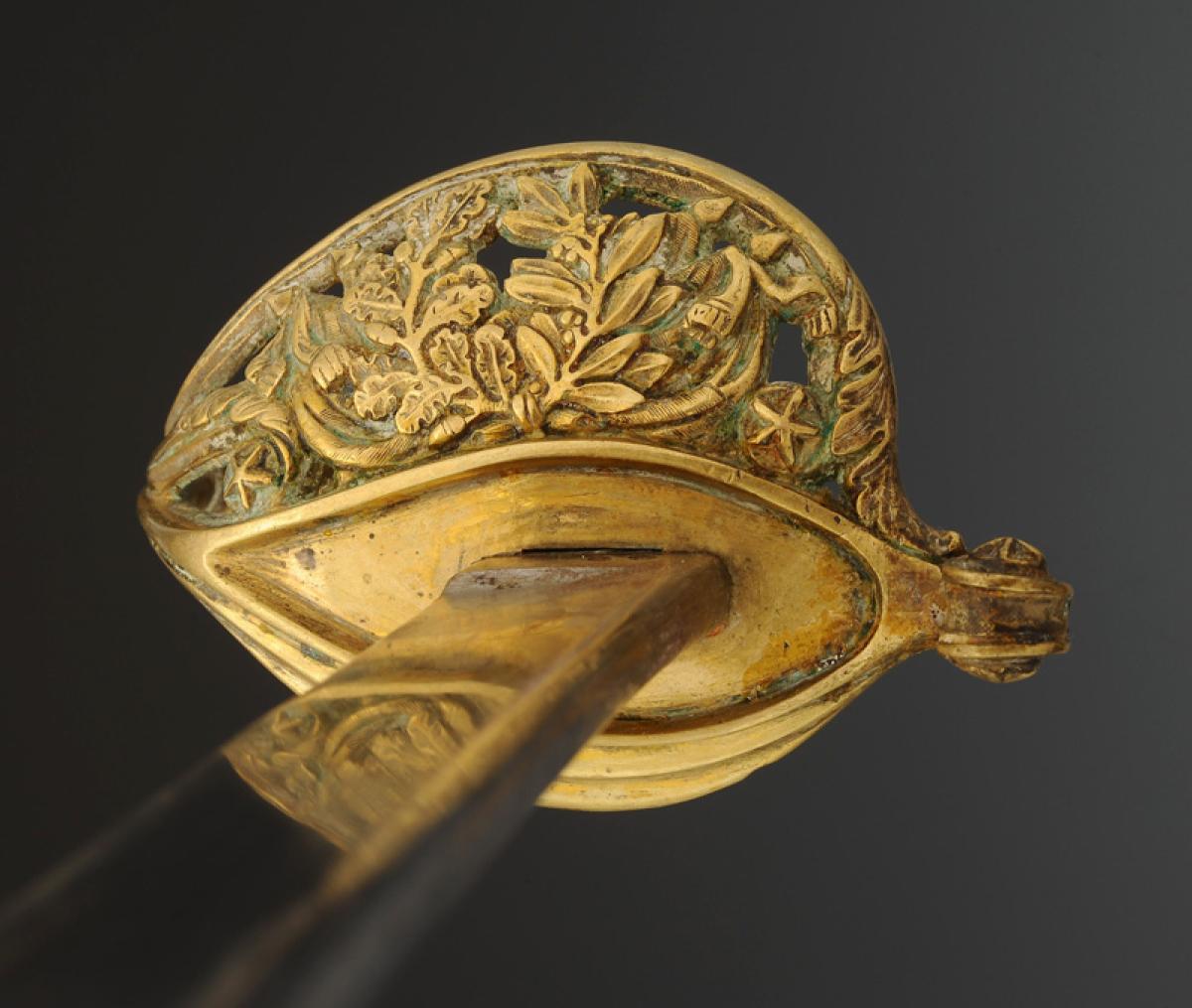 Brass hilt, guard with three branches forming a shell decorated with openwork foliage motifs, pommel with long tail decorated with foliage, filigree horn handle. Slightly curved blade, back edge at the tip with gutters and hollow facets, L 76 cm. Marked "Manufacture de Klingenthal, Coulaux." Steel scabbard with two suspension rings.
