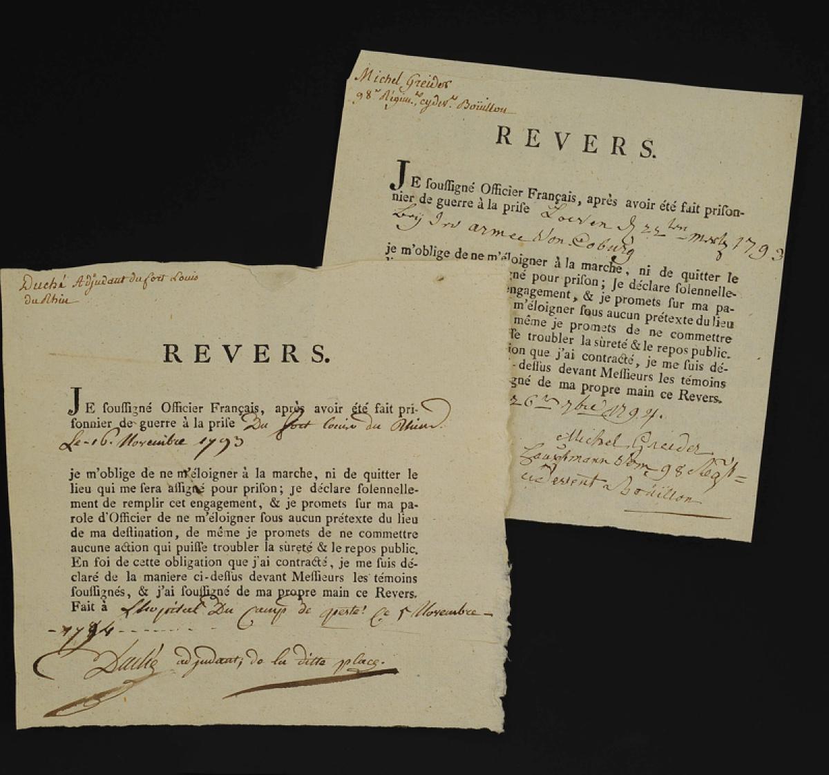 Prisoners of War 1794. TWO DOCUMENTS ENTITLED "REVERSES," one signed by Michel GREIDER, 98th Bouillon Regiment on September 26, 1794, and the second signed by DUCHÉ, adjutant at Fort Louis du Rhin on November 5, 1794. 18910-26
