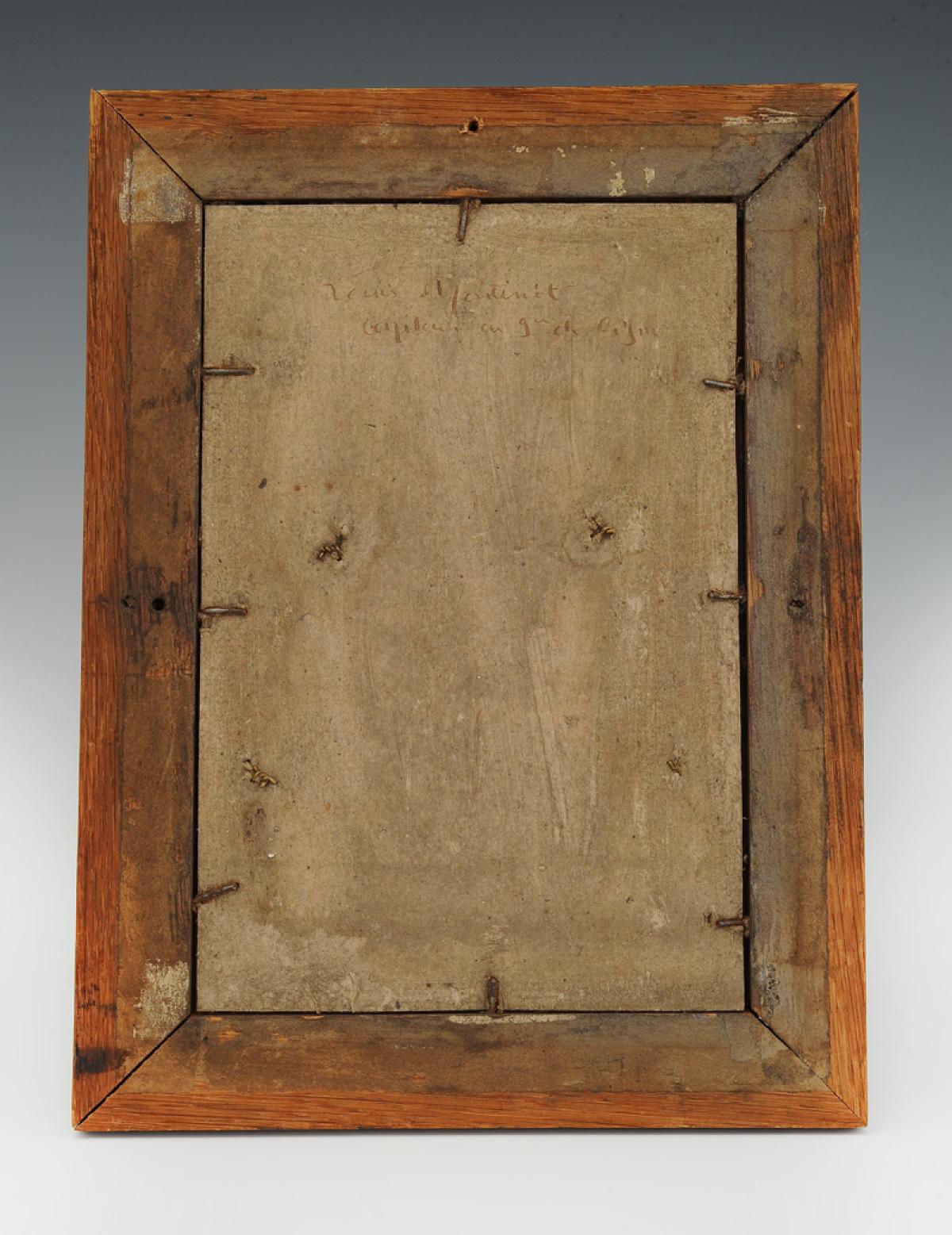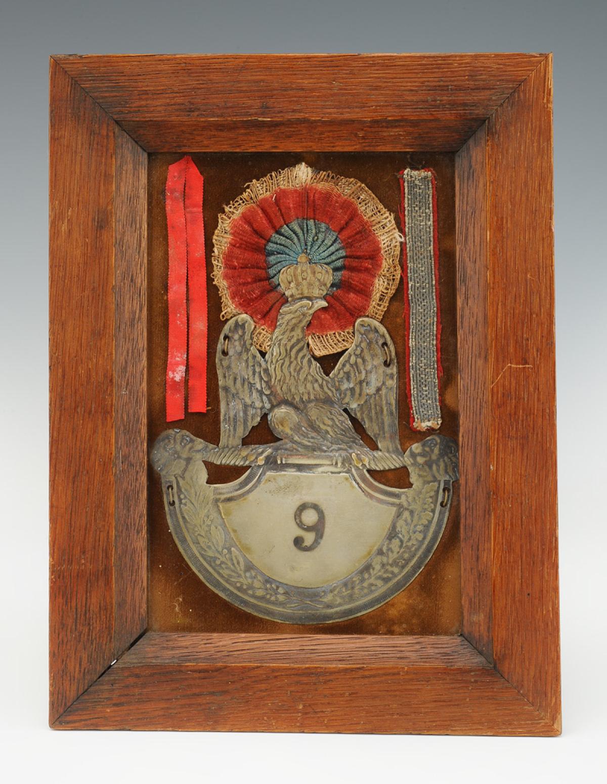 Silver-plated metal plate stamped with the crowned imperial eagle holding in its talons Jupiter's thunderbolt resting on a shield stamped at the bottom with an oak branch and a laurel branch, and on each side with a lion's head; the center of the shield is adorned with the numeral "9" in applied metal. Plate height 13.5 cm x 11.3 cm. It is framed under glass, accompanied by a scarlet cord, a scarlet cloth shoulder strap covered with a woven silver "cul de dé" braid, and a tricolor cockade approximately 7 cm in diameter. Waxed wood frame, height 24.3 cm x 18 cm.