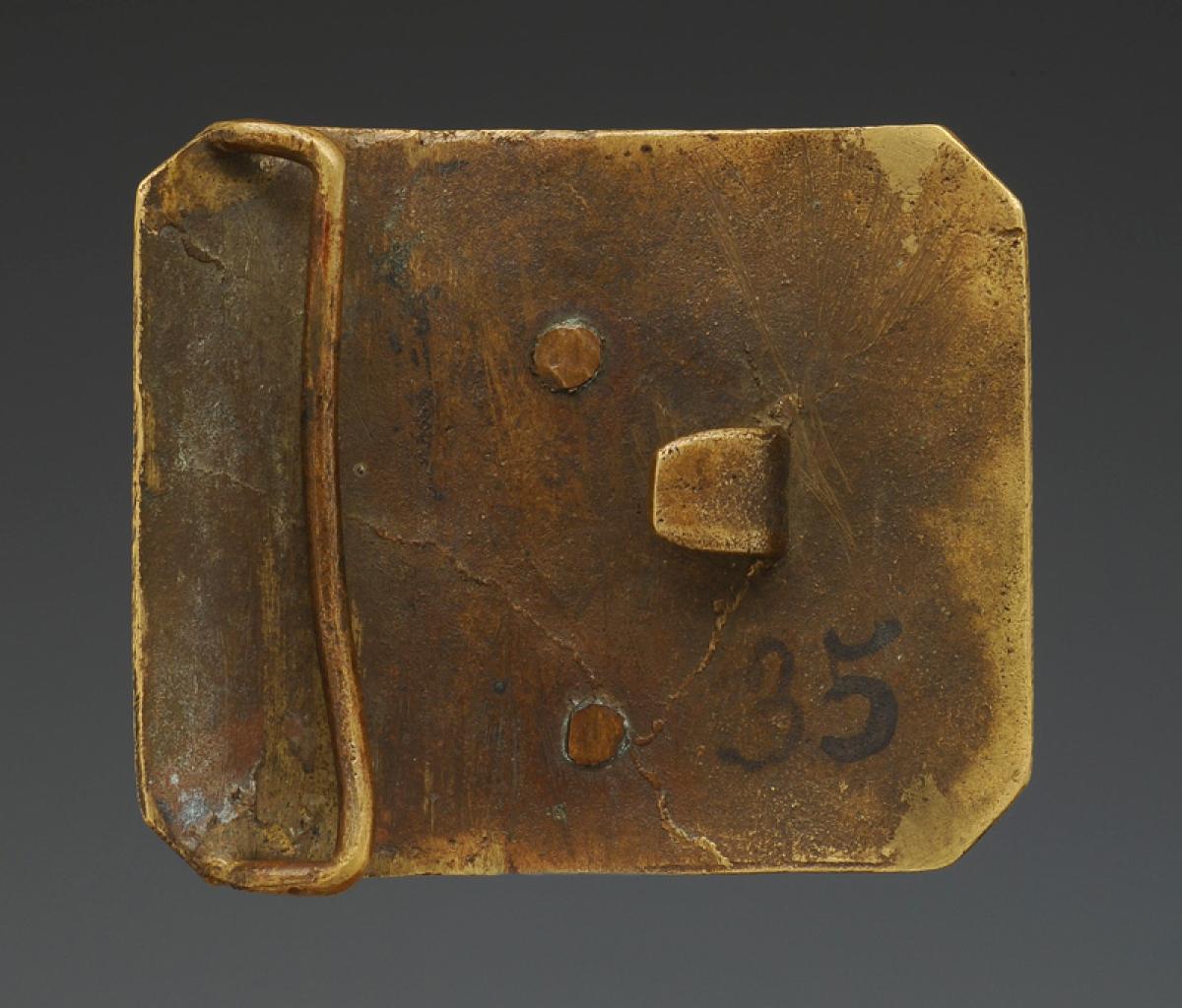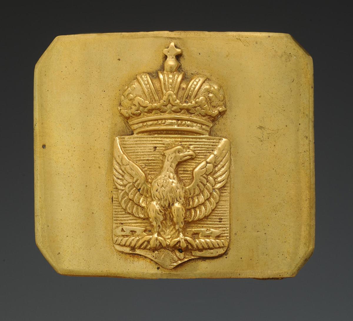 Made of cast brass. Rectangular-shaped plate with cut corners, 7.2 cm in height, 8.5 cm in width without the curve. Center featuring an attached and riveted brass piece depicting an eagle with outspread wings atop an imperial crown, with the central part measuring 6.5 cm x 3.4 cm.
