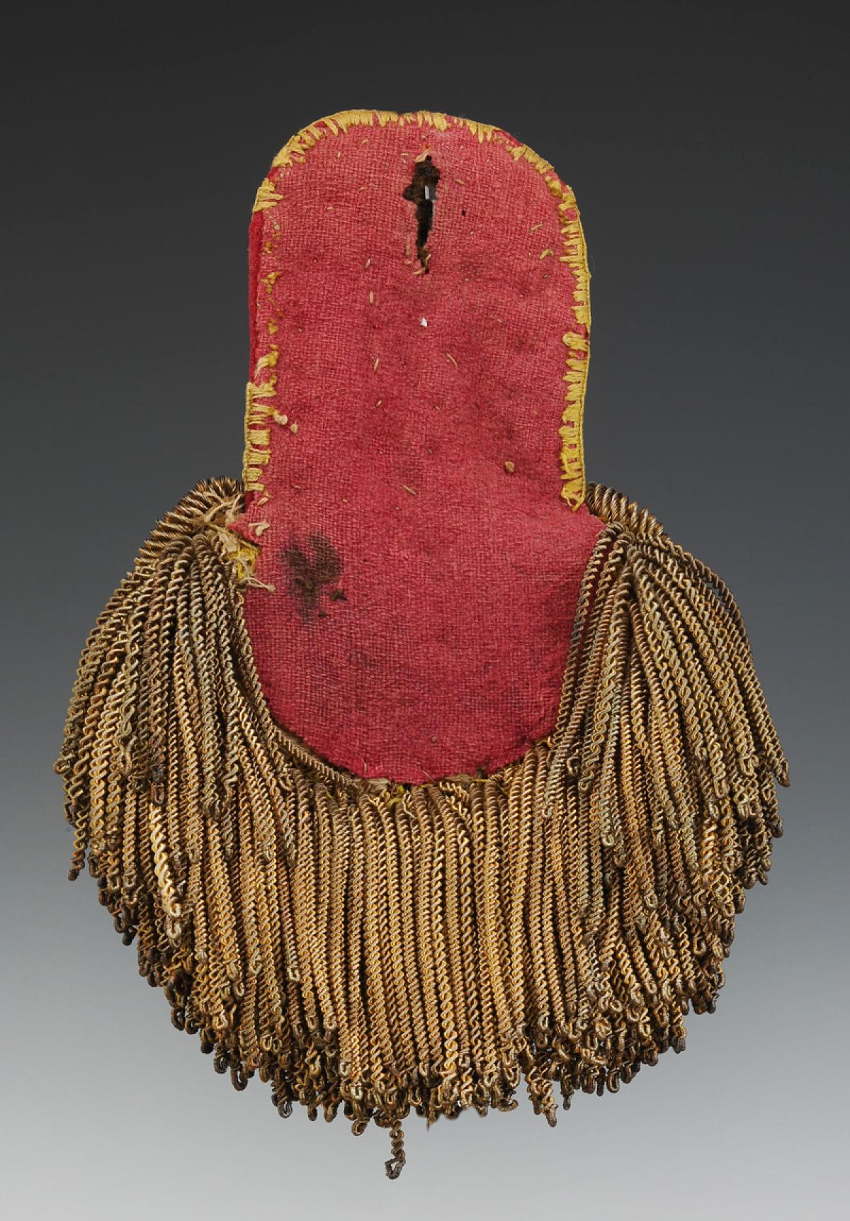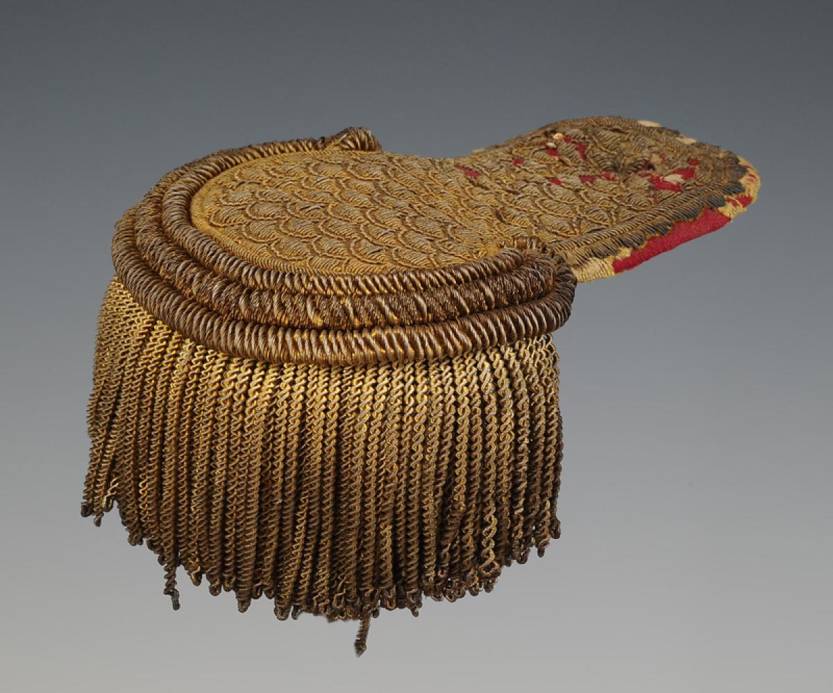 Entirely made of golden silver thread trimmings. Body embroidered with a series of scallops with scalloped edges. Lined with crimson cloth, finished with three tassels and supple fringes called "well ropes".
