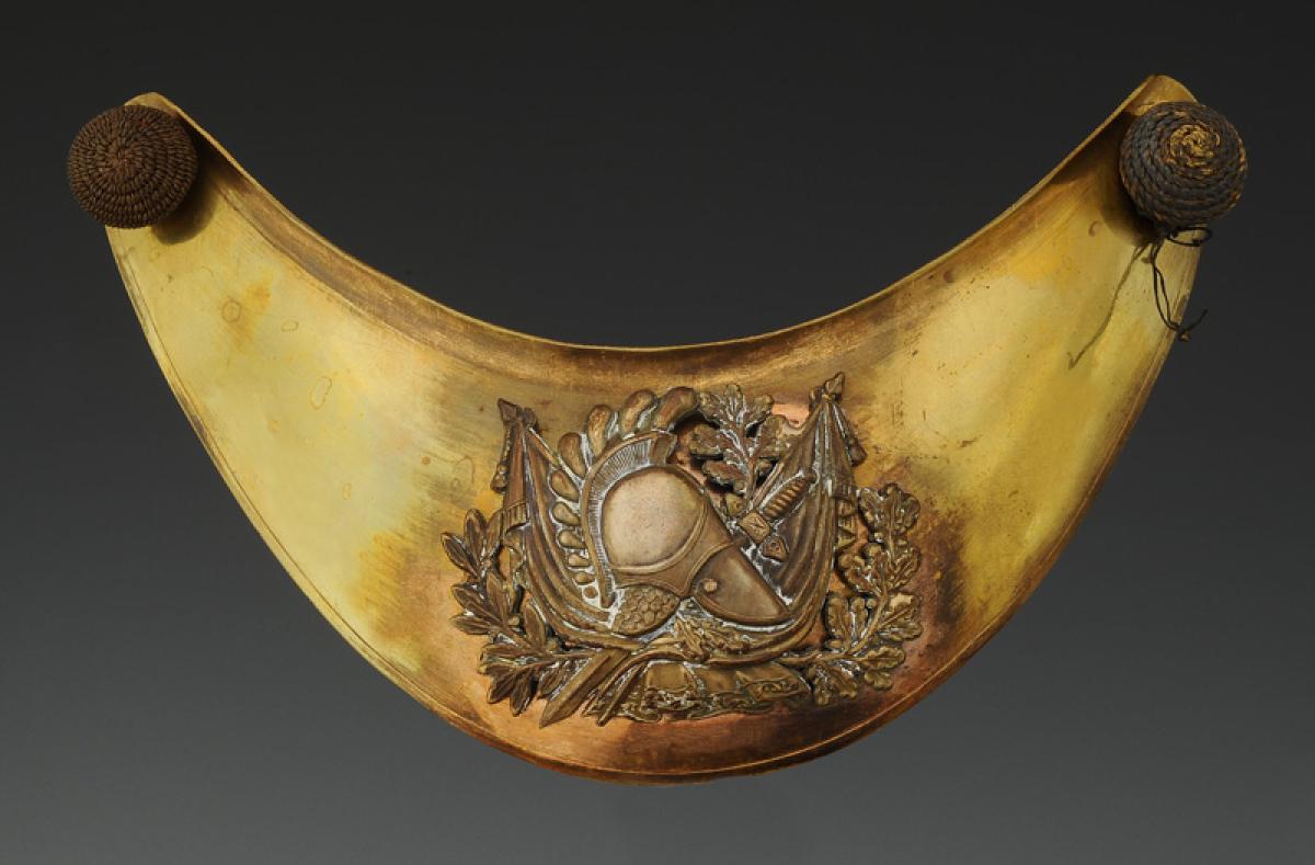 This model of stock is not regulation, the plate is from the First Empire period, the central motif is probably an adaptation made by the officer, it is secured by four clasps with an additional hole in the center of the plate.