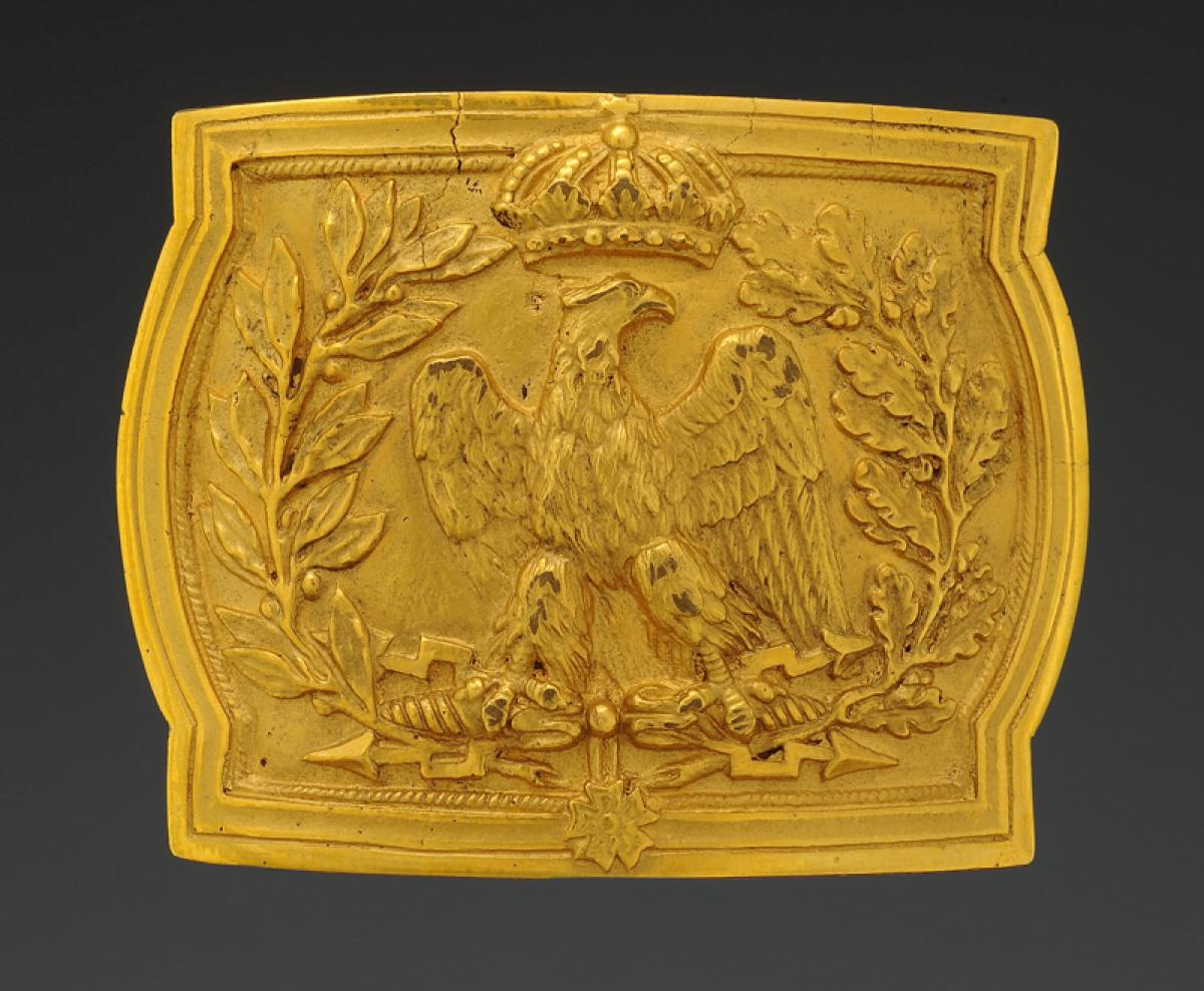 Made of cast and gilded bronze, rectangular in shape with rounded edges on both sides, height 6.8 cm, width without the curvature 8.6 cm. Molded in its center is the crowned imperial eagle with outstretched wings, holding in its talons Jupiter's thunderbolt, in the middle of which hangs a Legion of Honor. The eagle is surrounded by an oak and laurel branch, with the plaque framed by a raised molding.