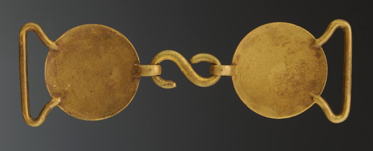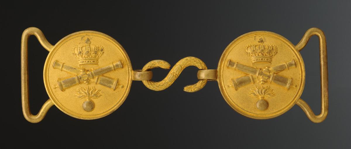 Made of gilded brass, consisting of two round relief-molded plates depicting two crossed cannons over a flaming bomb, topped with a royal crown. Each plate is finished with a large ring for the belt to pass through on their outer parts, and on their inner parts with a small ring receiving a snake-shaped hook.