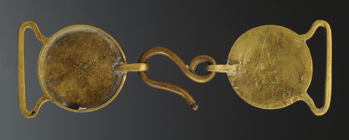 Buckle composed of a double round-shaped closure buckle in relief-cast brass depicting two crossed cannons above a pile of cannonballs, with a flaming bomb at the top (buckle diameter 4.4 cm). A brass ring for the belt passage is soldered on the outer part, and an horizontal ring inside with a brass S for closure.